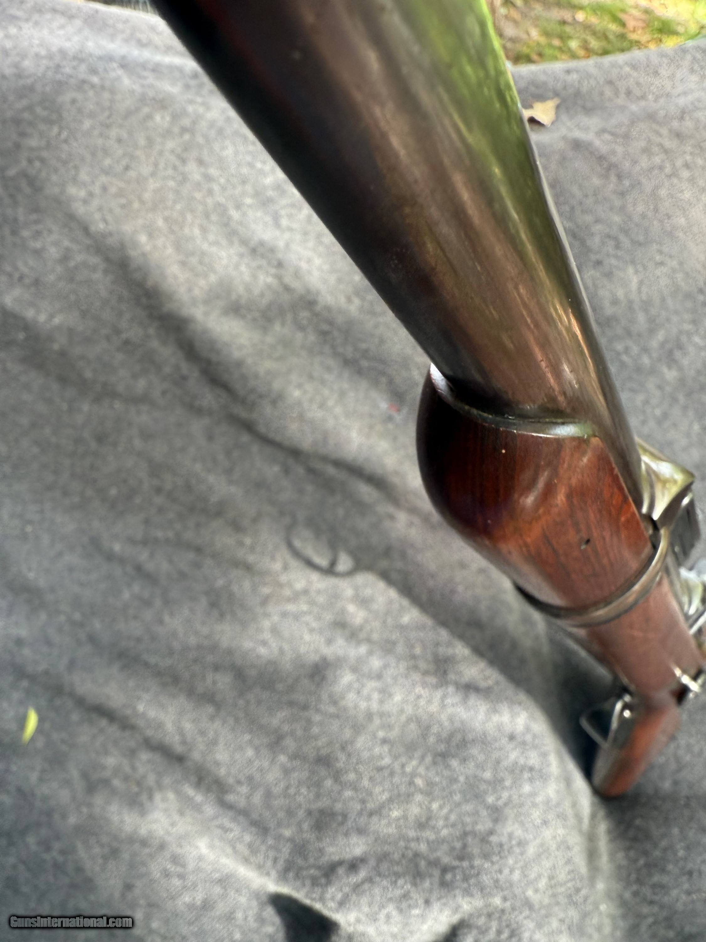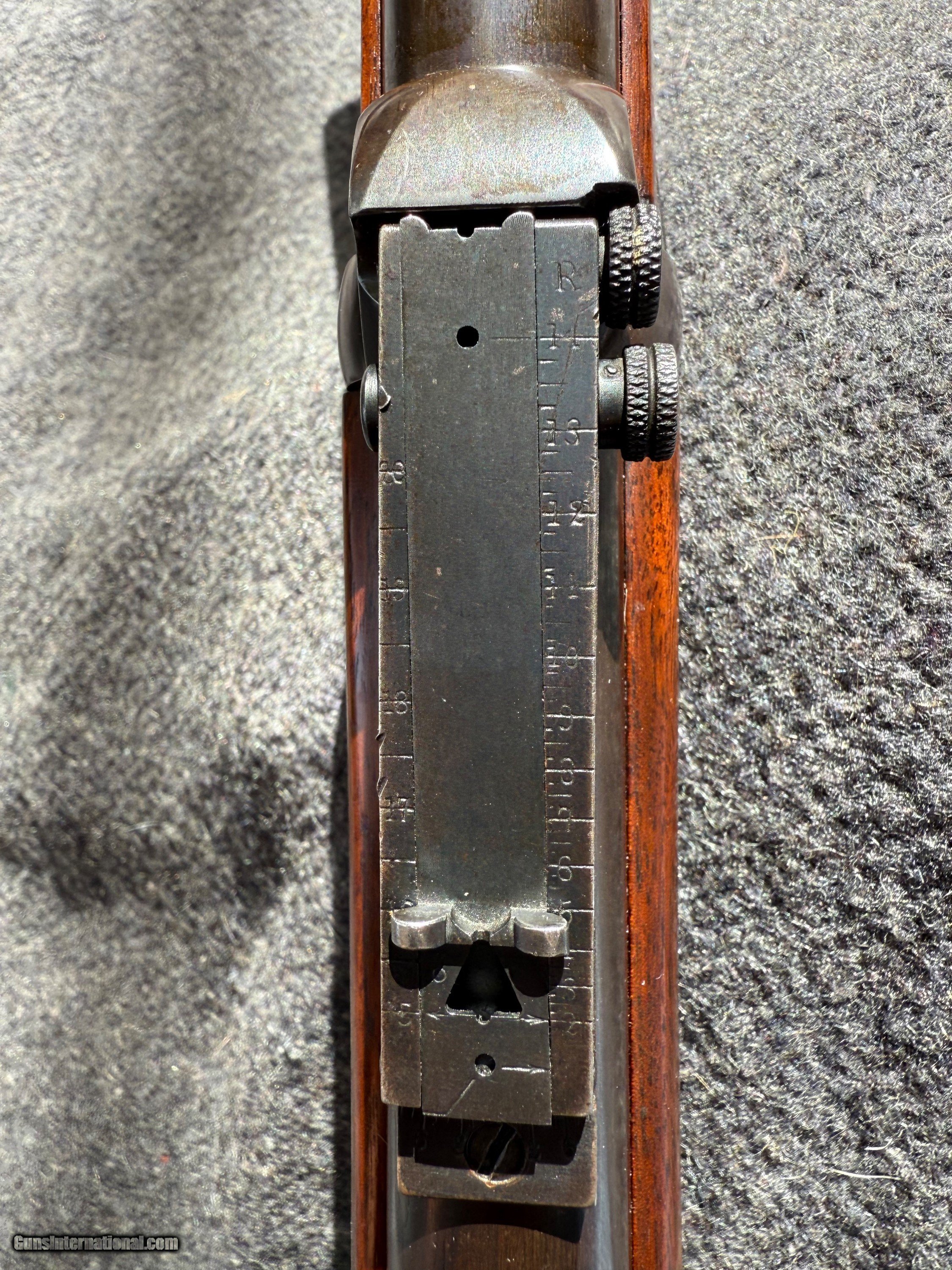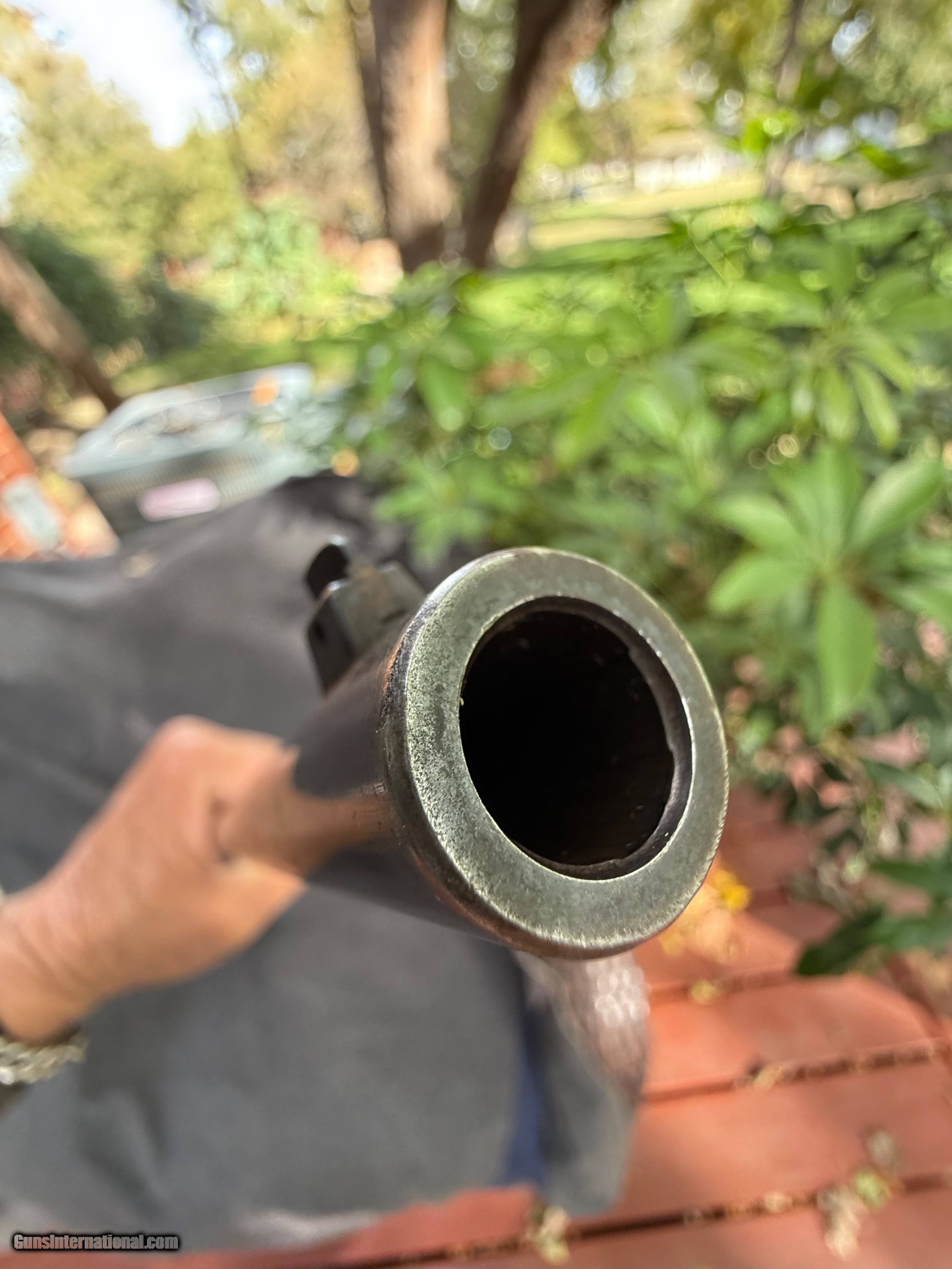 Overall Condition: This rifle retains about 90% of its metal finish. The metal shows scratches and dings. The barrel shows thinning at the muzzle, and small specklings of surface oxidation. Overall, this rifle rates in about Very Good Plus condition for its age.