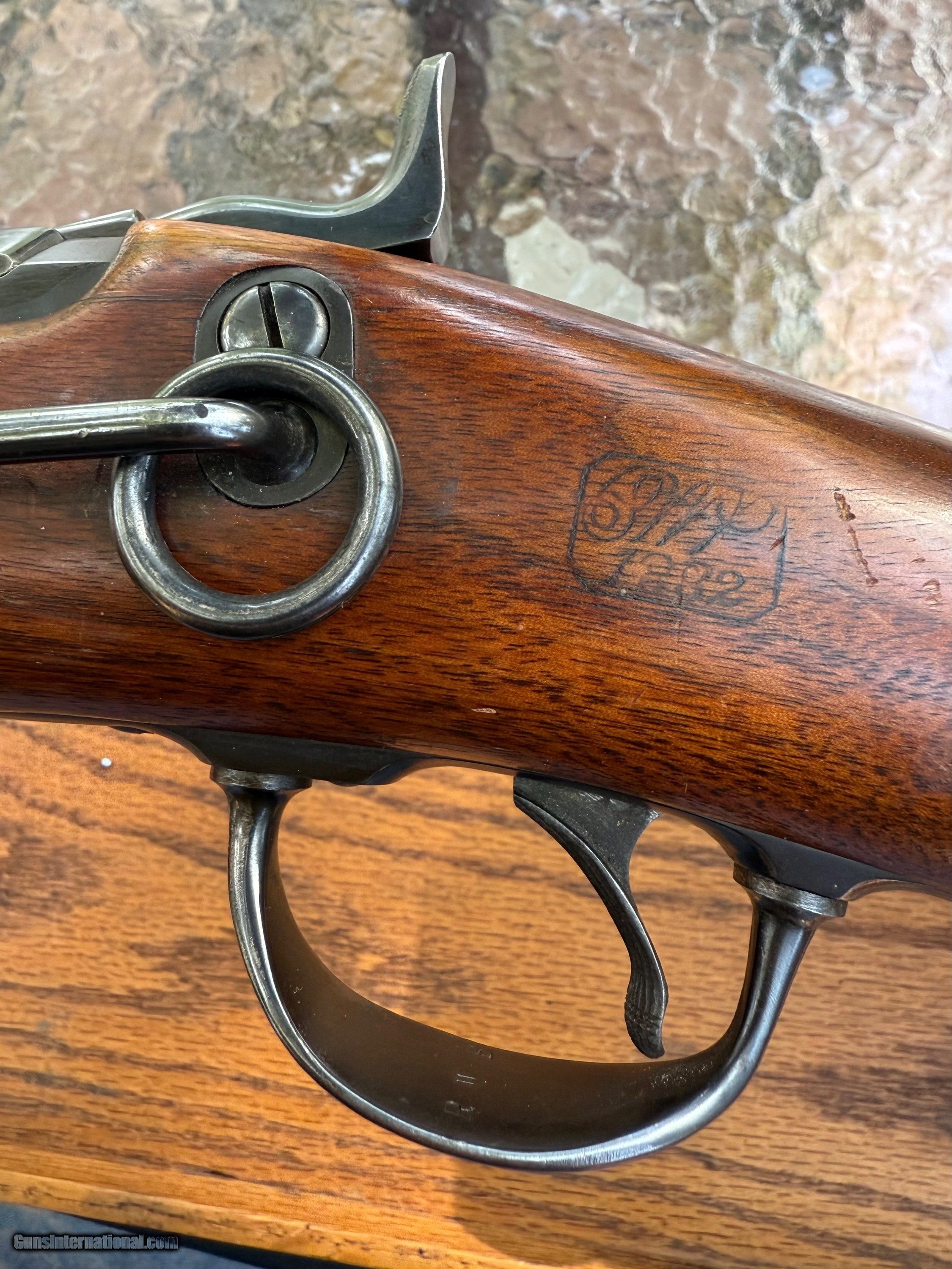 This Springfield Model 1873 Carbine was manufactured in 1882 of which 580 were made.. This carbine features a carbine sling bar with saddle ring. The Buffington sight is rifle (R) marked. Most of the markings are strong and shows collectible cartouches on the stock. The inspectors cartouche shows “1882” which matches the serial number range for 1882's. The sights slide up nicely . The breech case coloring is beautiful. The rifle's overall condition isn’t bad for being over 140 years old. If you are a Trapdoor collector or looking for a carbine in .45-70, this is would be a great addition.