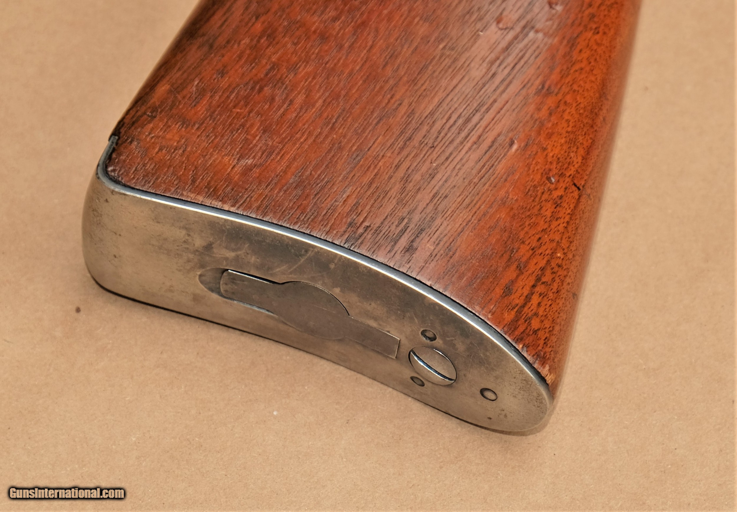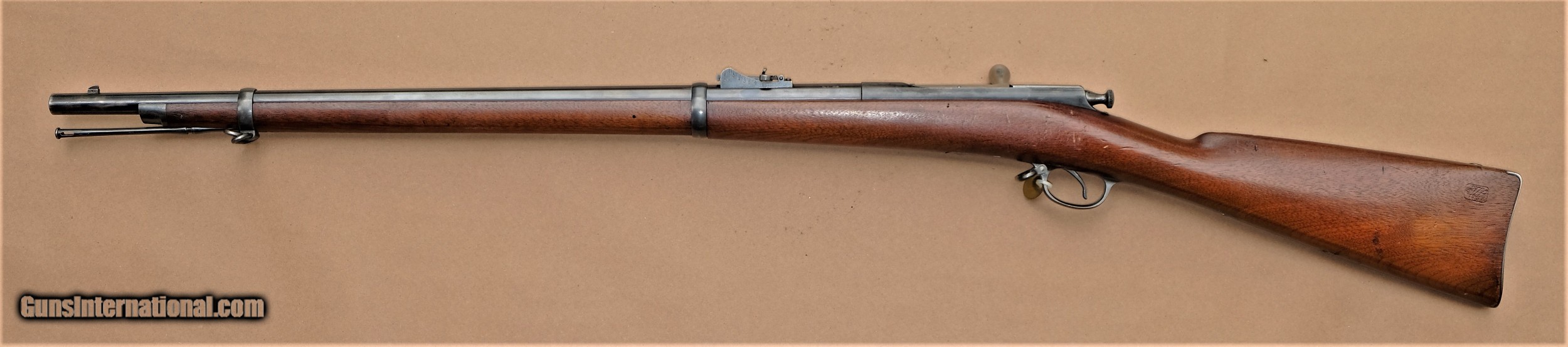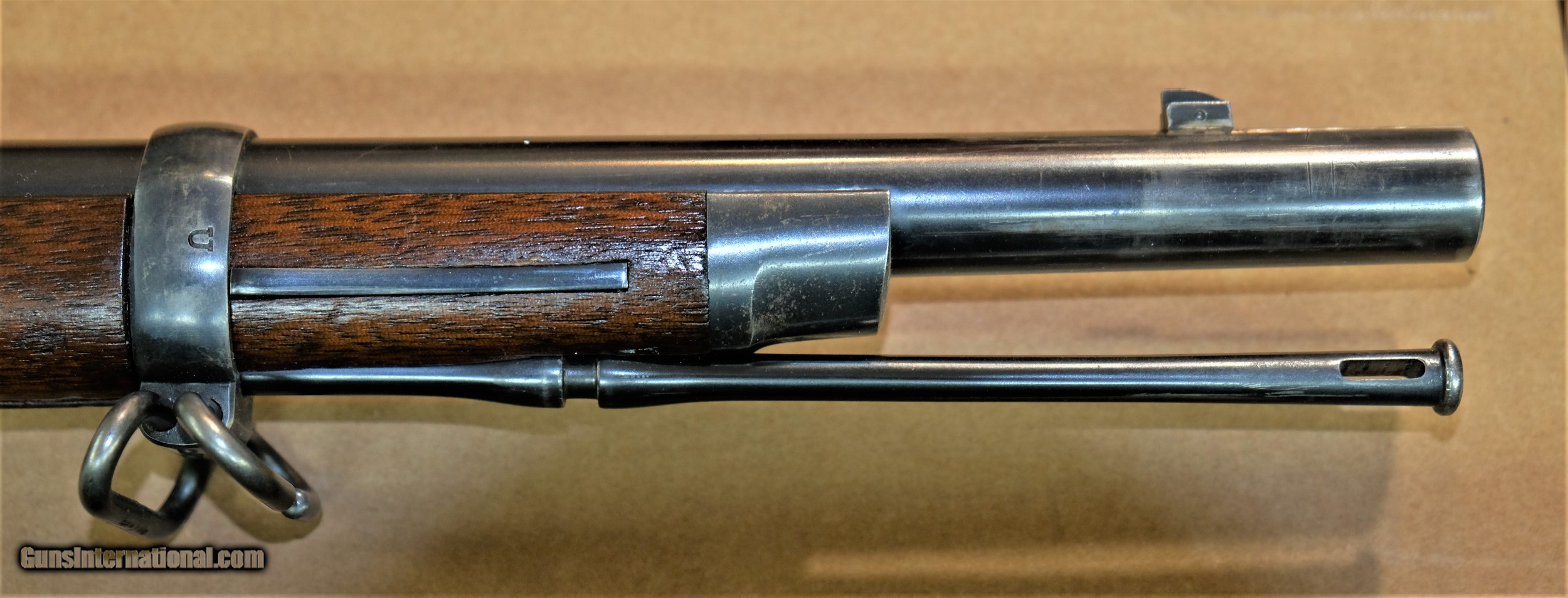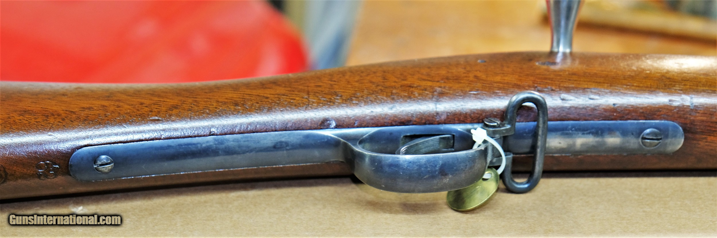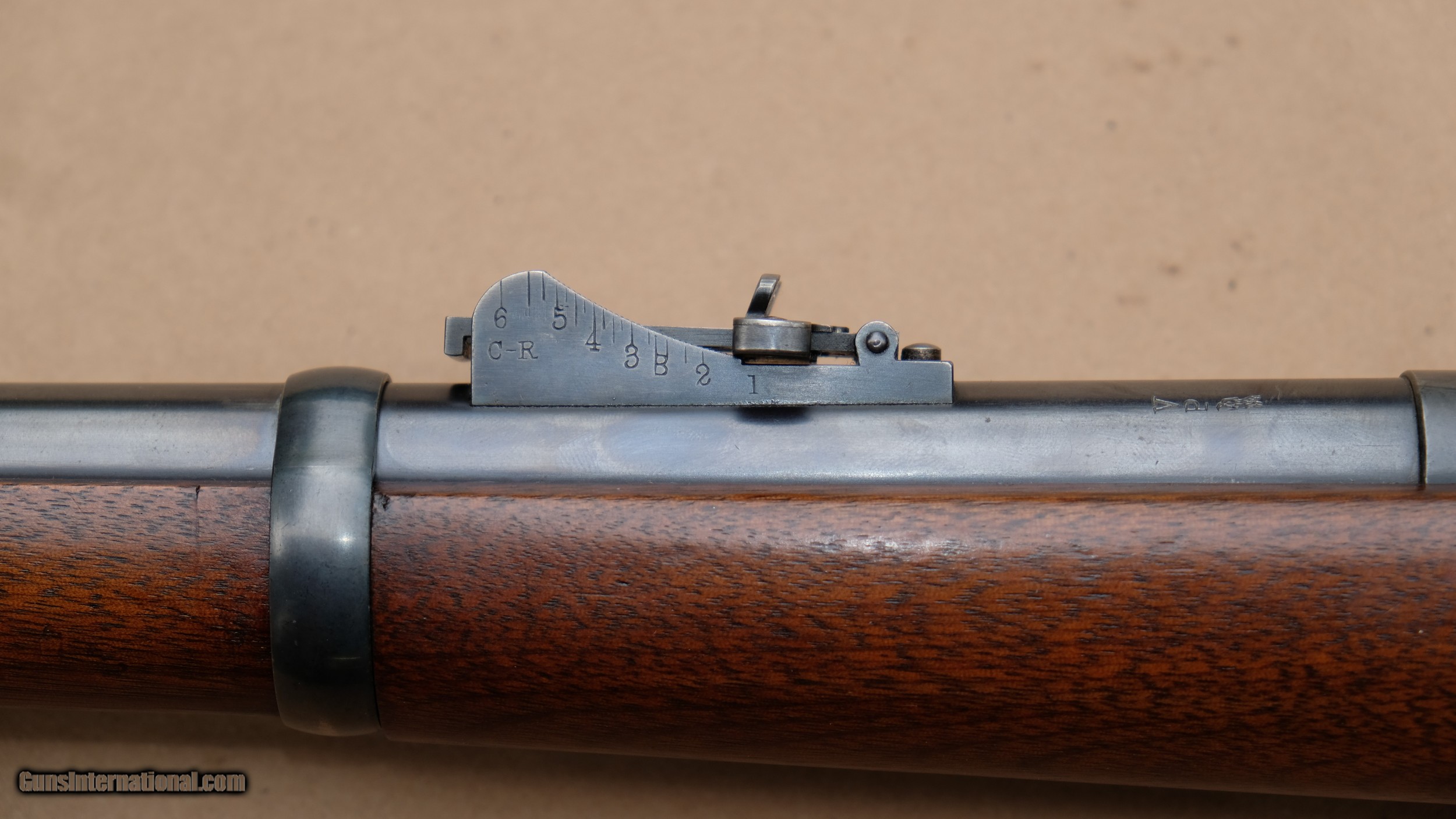 Description: The U.S. Rifle Model 1882, the Chaffee Reese, was one of the first bolt action rifles manufactured at Springfield Armory in 1884. Only a total of 753 were made for trials. The rifle has a seven round magazine that loads through the butt. A ratchet mechanism advances the cartridges with the action of the bolt. Unlike many examples, this rifle has its magazine assembly and it is in fine working order. The firearm is equipped with a cutoff to allow the arm to be used as a single shot while retaining a full magazine for emergencies. The majority of these rifles were heavily used in the west as they were trial rifles. This example is exceptional as shown by the many photographs. Of particular note is the special rear sight marked C-R, the pristine cartouche and the remaining finish on the rifle. The bolt is bright, the action case hardened in oil and the remainder of the arm rust blued. The only glitch is shown in the last photo. SOLD Antique: Yes Rifle Caliber: .45-70 Government |