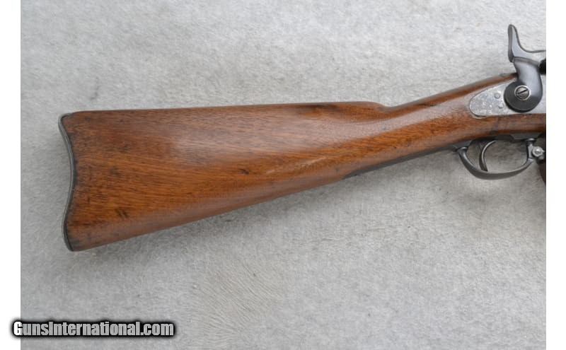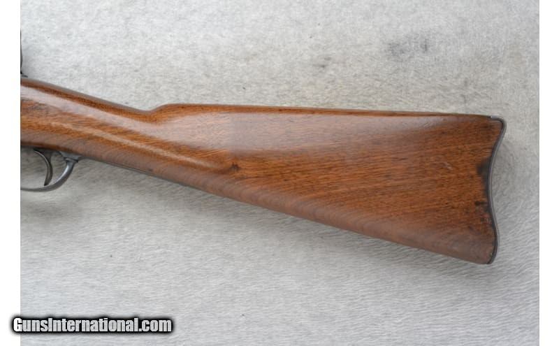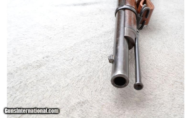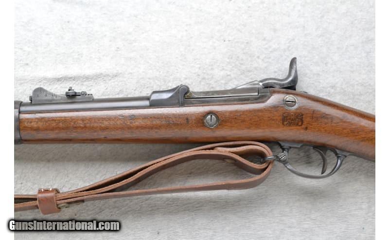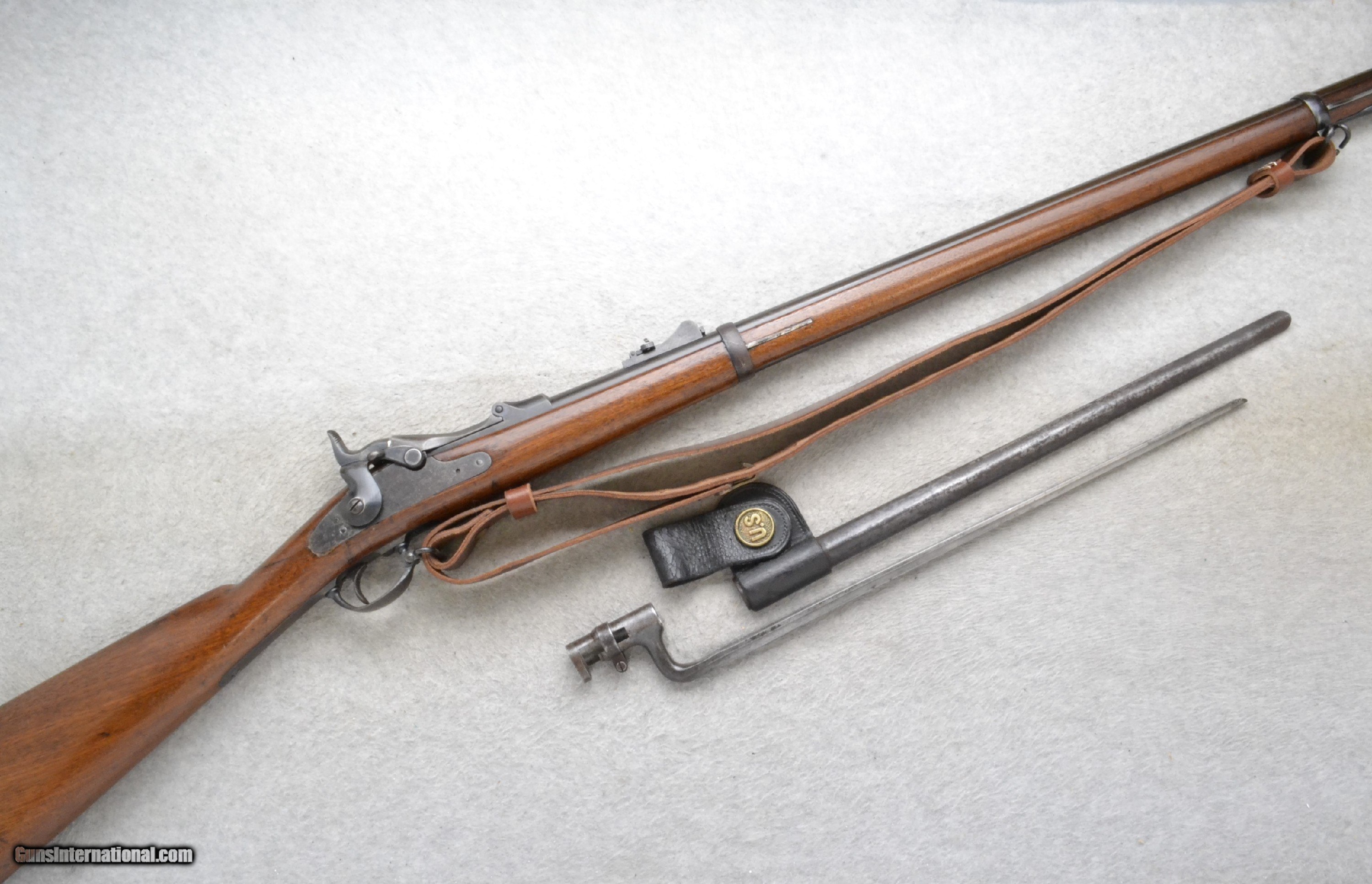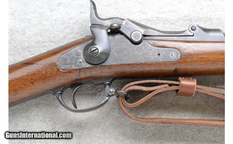 This Springfield Model 1873 is a right-hand trapdoor rifle in .45-70 Govt Cal. It has a 32" barrel with a blade front sight, an adjustable notch middle sight and fixed notch rear sight. The forearm is smooth Walnut in excellent condition. The butt stock is a smooth grip straight grip Walnut with a metal butt plate. Wood is stamped 1898. SN 74462. .45-70 Government