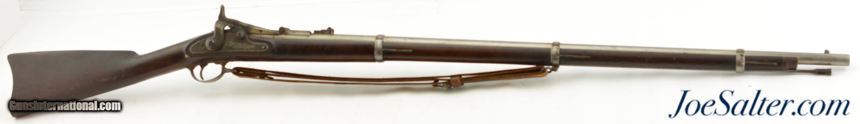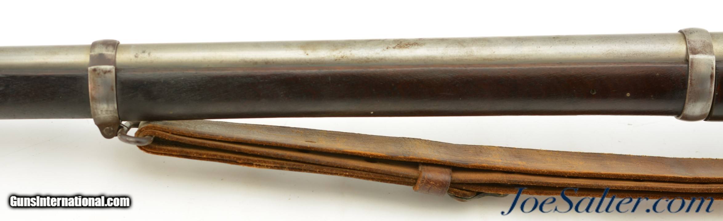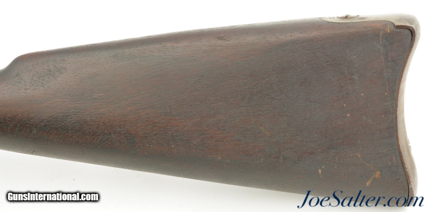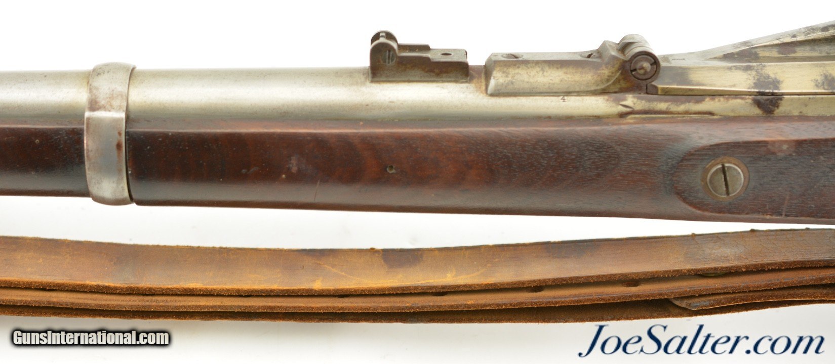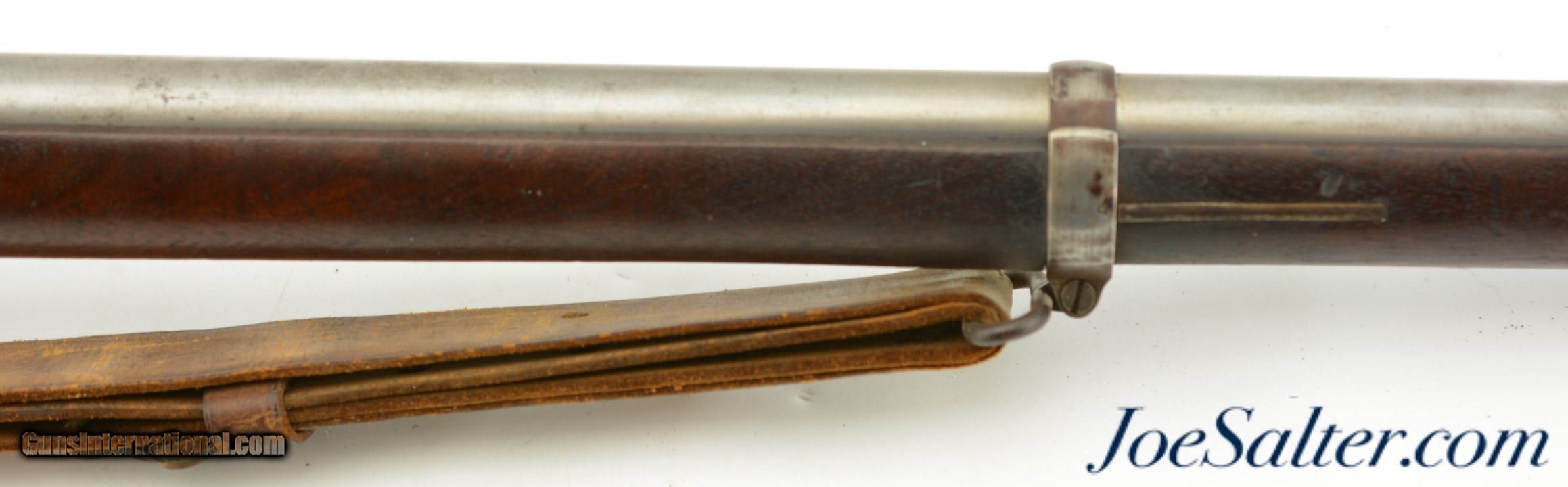 NSN, .50 CF, 36 5/8" barrel with a fine, bright bore that has some traces of minor freckling within the grooves. This rifle was built on an 1864 dated musket and has a mostly pewter gray patina throughout, with some areas of mild freckling in spots along the barrel. The breechblock has spots of old surface oxidation that was cleaned at some point, leaving the metal with a mottled gray and plum-brown patina, but traces of the original dark finish remain on protected areas. The walnut stock is in very good condition with minor surface scratches and blemishes scattered throughout the original military oil finish. The "HSH" cartouche is still crisp and clear on the left side of the stock (Henry S. Hill, Springfield Inspector). The rifle comes with an original metal ramrod and also has an old leather sling installed. This is a nice 2nd Allin Conversion, and is in very good condition overall. Antique;