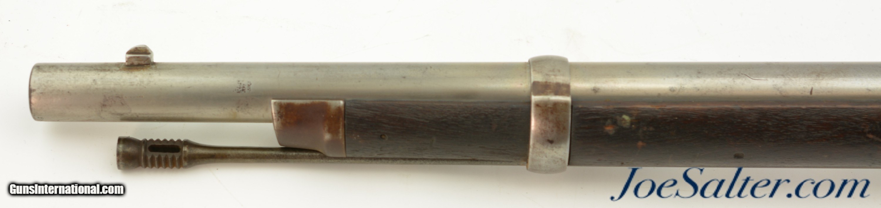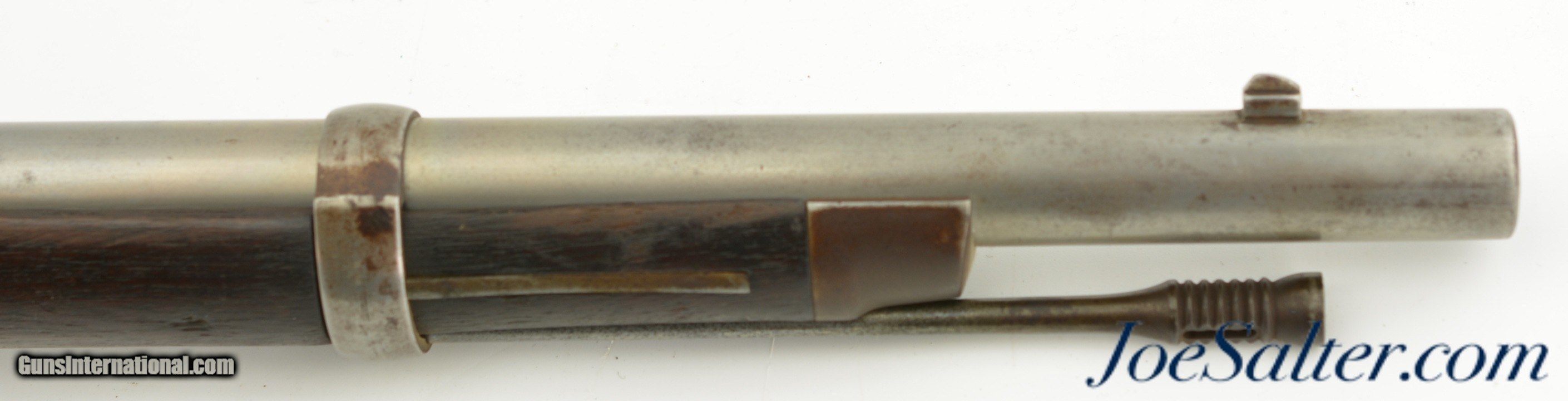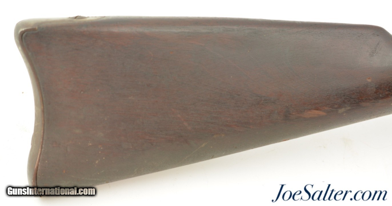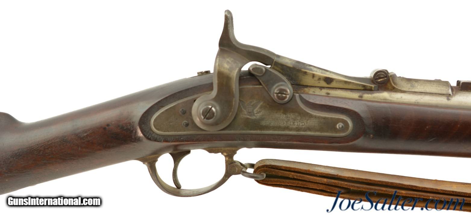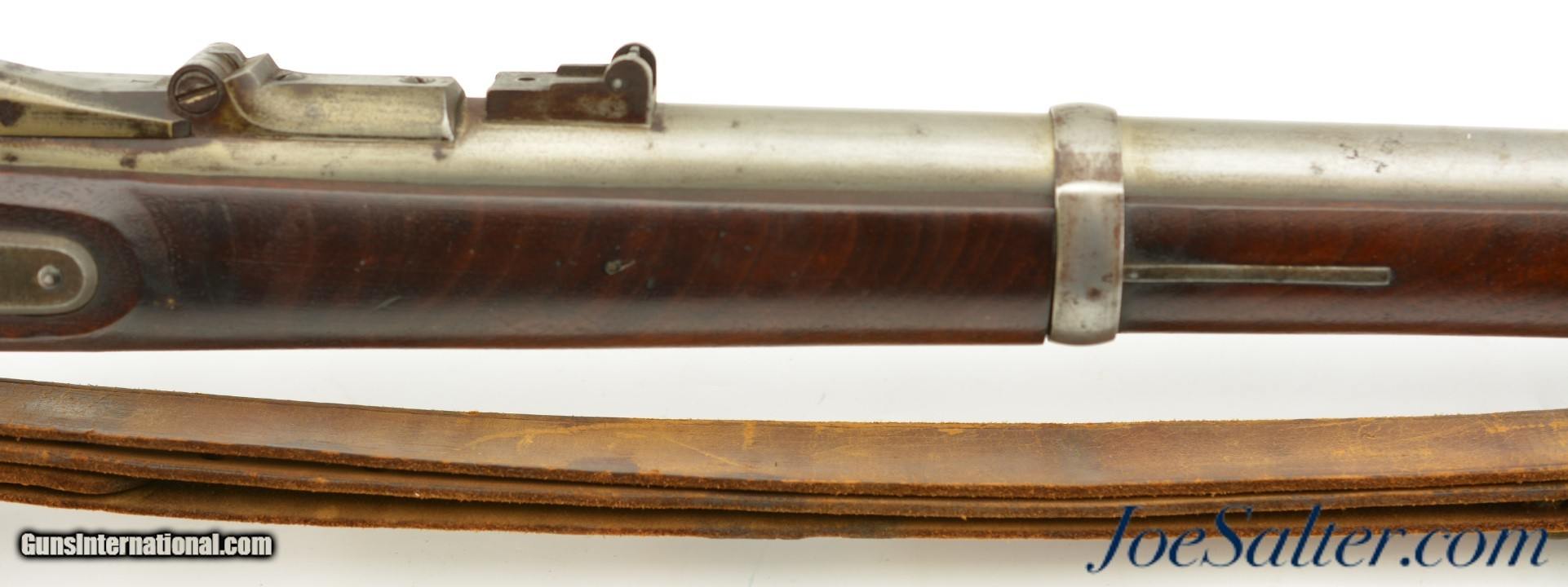 NSN, .50 CF, 36 5/8" barrel with a fine, bright bore that has some traces of minor freckling within the grooves. This rifle was built on an 1864 dated musket and has a mostly pewter gray patina throughout, with some areas of mild freckling in spots along the barrel. The breechblock has spots of old surface oxidation that was cleaned at some point, leaving the metal with a mottled gray and plum-brown patina, but traces of the original dark finish remain on protected areas. The walnut stock is in very good condition with minor surface scratches and blemishes scattered throughout the original military oil finish. The "HSH" cartouche is still crisp and clear on the left side of the stock (Henry S. Hill, Springfield Inspector). The rifle comes with an original metal ramrod and also has an old leather sling installed. This is a nice 2nd Allin Conversion, and is in very good condition overall. Antique;