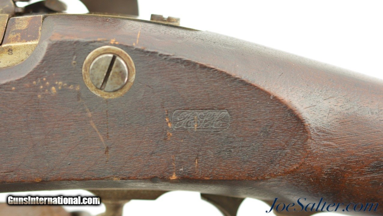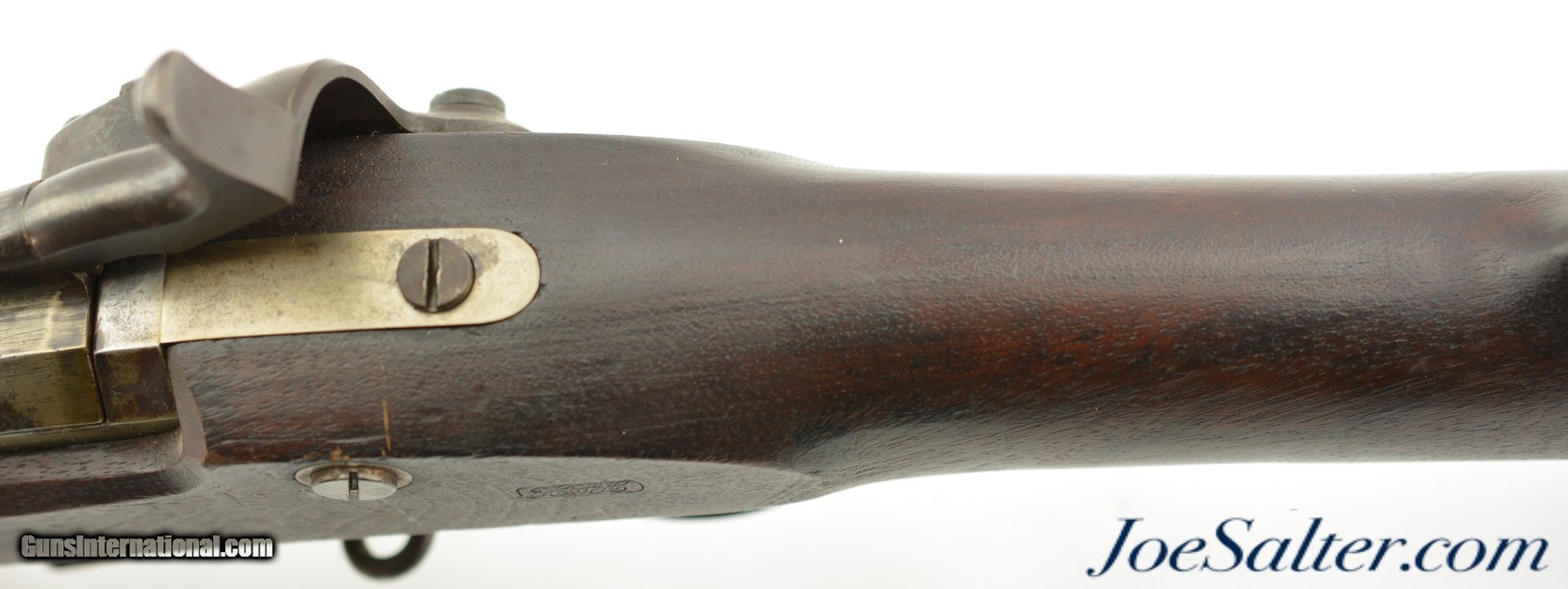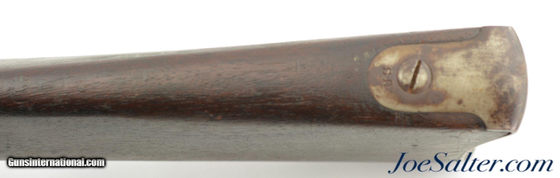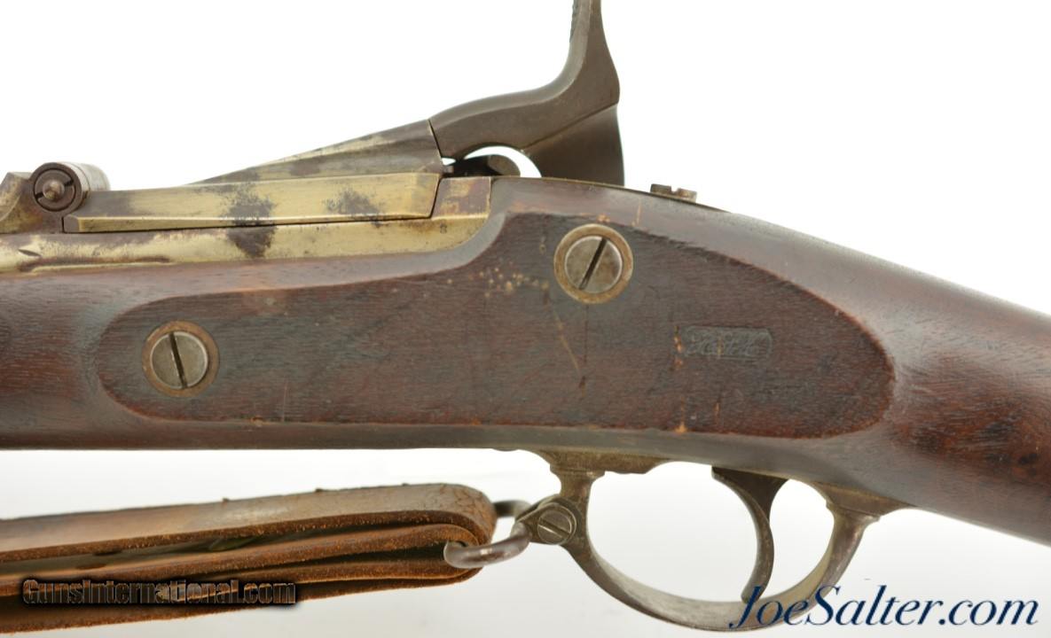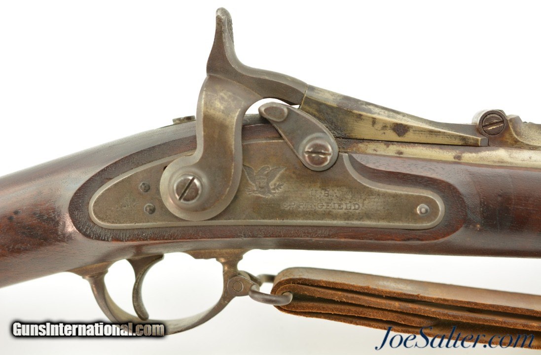 NSN, .50 CF, 36 5/8" barrel with a fine, bright bore that has some traces of minor freckling within the grooves. This rifle was built on an 1864 dated musket and has a mostly pewter gray patina throughout, with some areas of mild freckling in spots along the barrel. The breechblock has spots of old surface oxidation that was cleaned at some point, leaving the metal with a mottled gray and plum-brown patina, but traces of the original dark finish remain on protected areas. The walnut stock is in very good condition with minor surface scratches and blemishes scattered throughout the original military oil finish. The "HSH" cartouche is still crisp and clear on the left side of the stock (Henry S. Hill, Springfield Inspector). The rifle comes with an original metal ramrod and also has an old leather sling installed. This is a nice 2nd Allin Conversion, and is in very good condition overall. Antique;