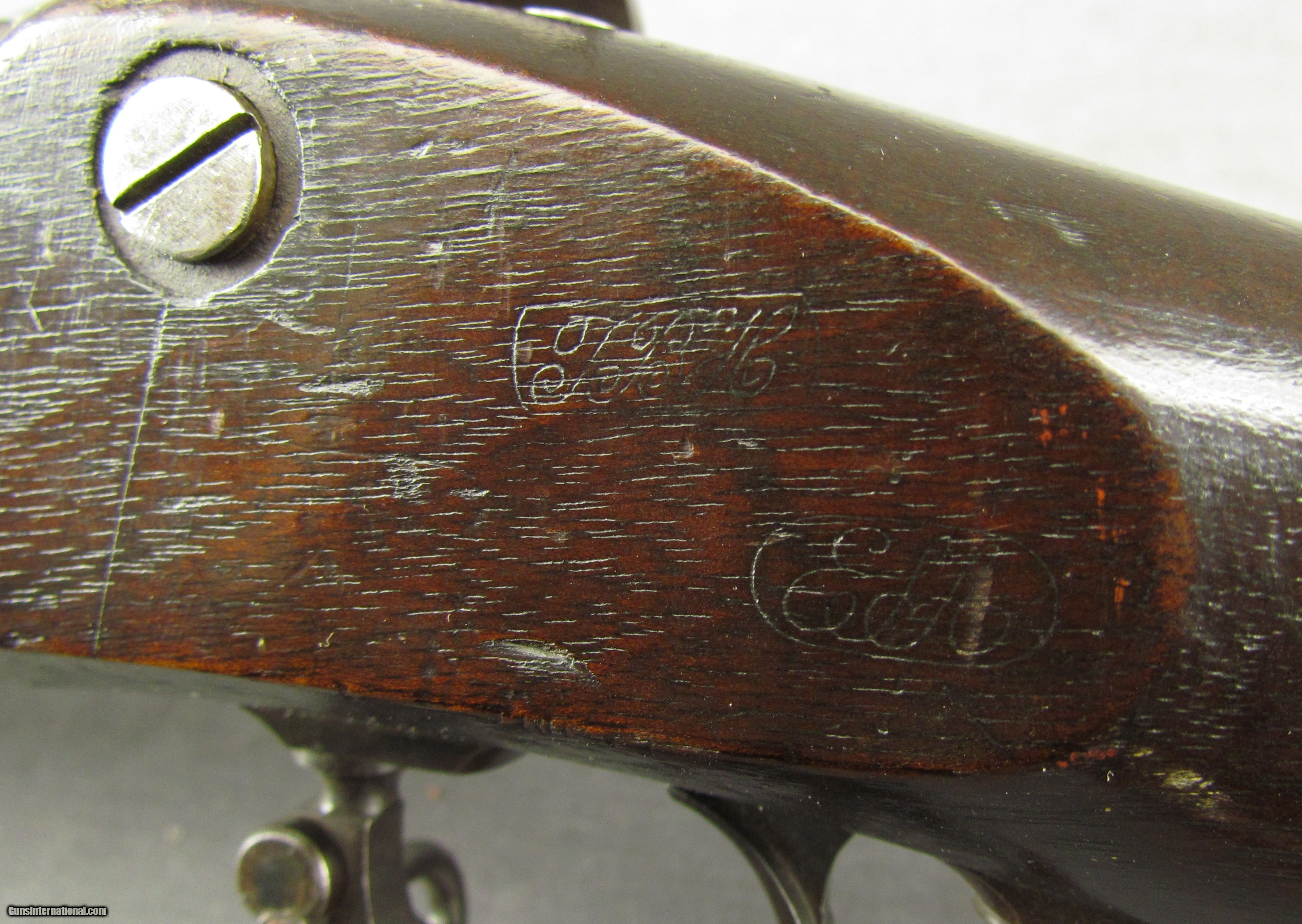 Description: NSN, .50-70, 32 1/2" barrel with a fine, bright bore that has mild freckling within the grooves, and a few spots of dark pitting about midway down. This rifle has an 1863 dated lockplate with the metal having an overall pewter gray patina with scattered spots of freckling, mainly near the muzzle, and on the receiver and lock. The breech block lock-up is firm while the action is tight and functions flawlessly; the hammer is held secure at both half-cock and full-cock. The walnut stock has an added oil finish over unsanded wood with numerous minor surface marks and handling blemishes; the inspector cartouches are slightly softened, but still fully legible. The rifle comes with a correct metal ramrod, and is in about fine condition overall. Antiqu SOLD Antique: Yes Manufacturer: Spfld Model: 1870 Caliber Info: .50-70 Gauge Info: .50-70 |