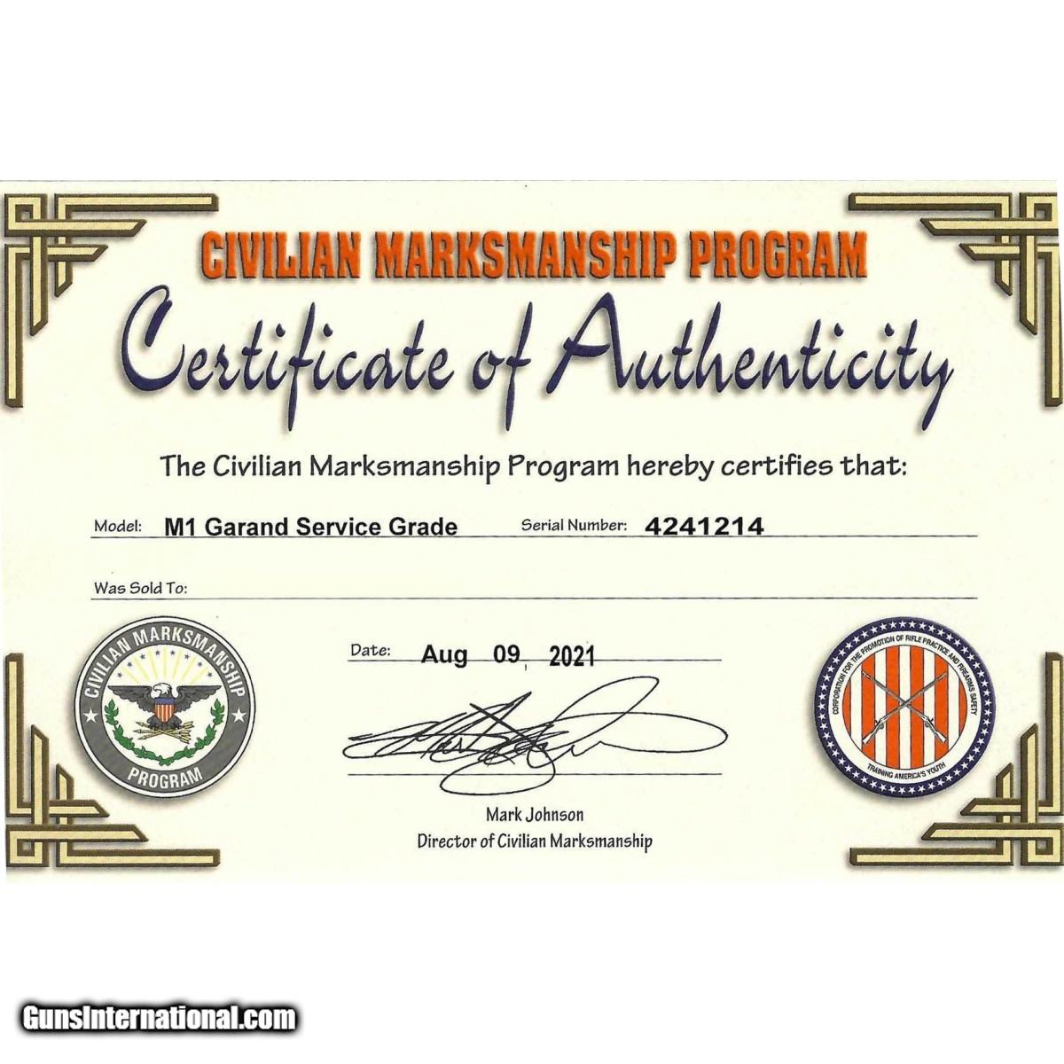 Description: " SN: 6097553. Made in 1957 at Springfield Armory in 30.06 with a ""6-52"" dated National Match barrel. Bore has shiny and strong rifling. Springfield M1 Garand converted to a National Match rifle through the use of a National Match Op-Rod, barrel, rear sight, and glass bedded stock. Rifle has S-B10 bolt, ""P O"" marked Poppet valve gas cylinder lock screw. Stock is in near perfect condition with the DOD eagle stamp present. Overall near perfect condition National Match M1 Garand with an excellent finish. Rifle comes with reproduction 1907 sling, CMP certificate of Authenticity, and shipping receipt from the CMP. SOLD Curio/Relic: Yes |