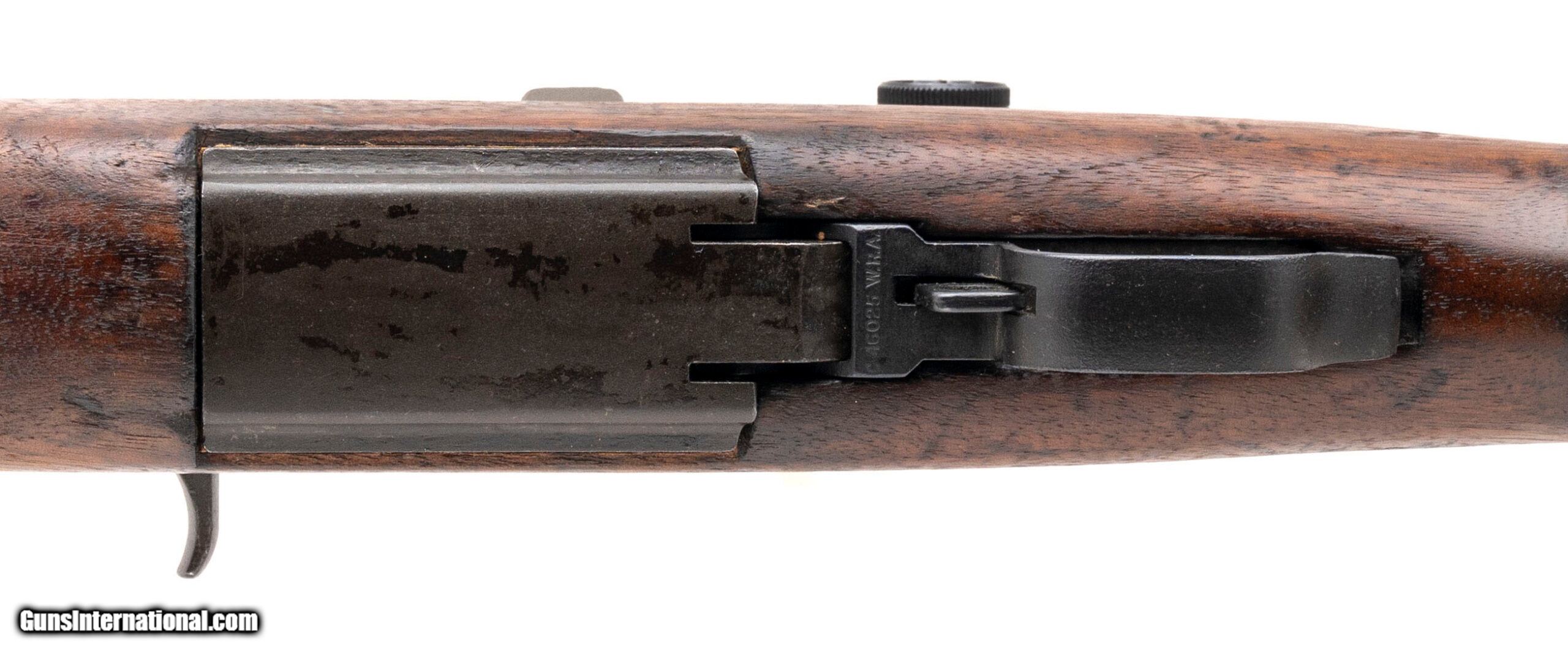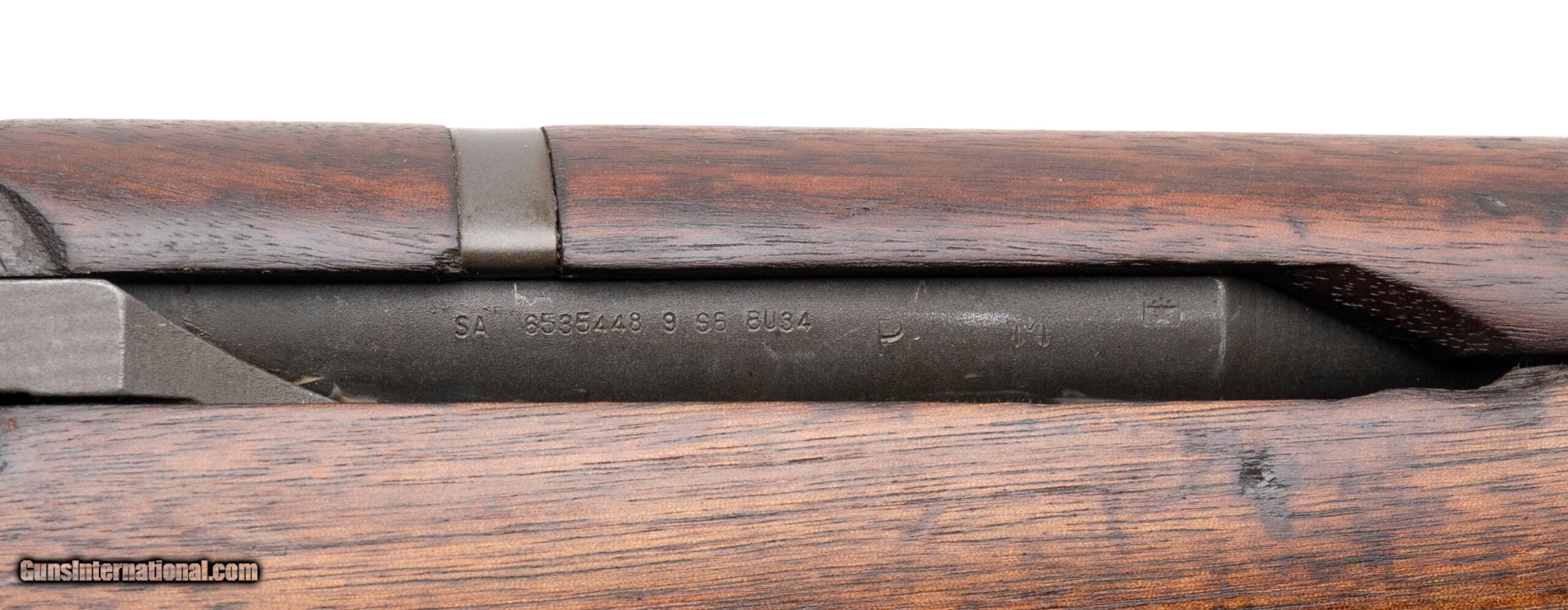 Description: "Serial No. 312703, made August of 1941, .30-06, 24" round barrel marked “SA 9-56." Bore is bright and shiny with strong rifling. Op-rod has been cut; internal components are “SA" marked, except for the trigger guard, which is marked “W.R.A." Stock shows light scratches and handling marks, with a faint “S.A." cartouche on the right side and a circle “P" behind the trigger guard. Action is smooth and functions correctly. A solid example of a well-maintained service rifle. SOLD Curio/Relic: Yes |