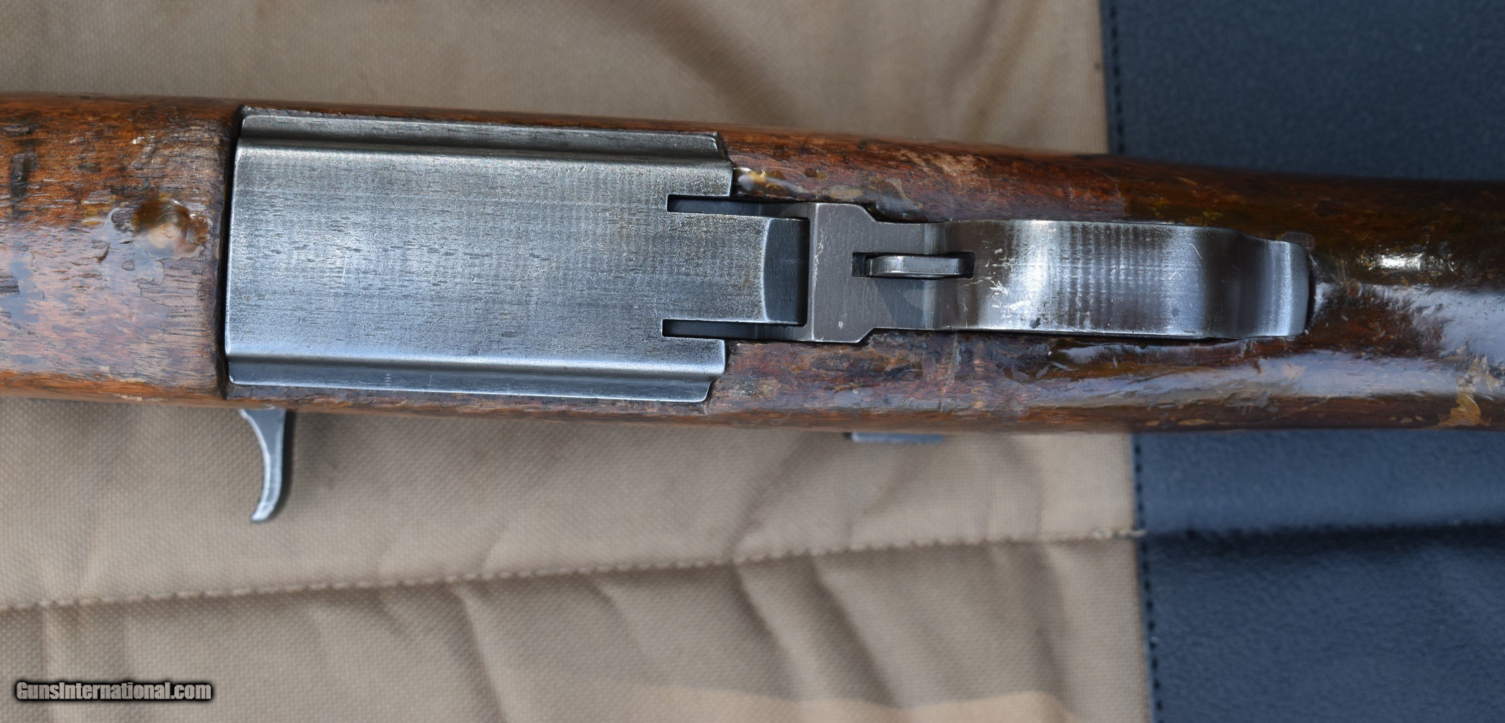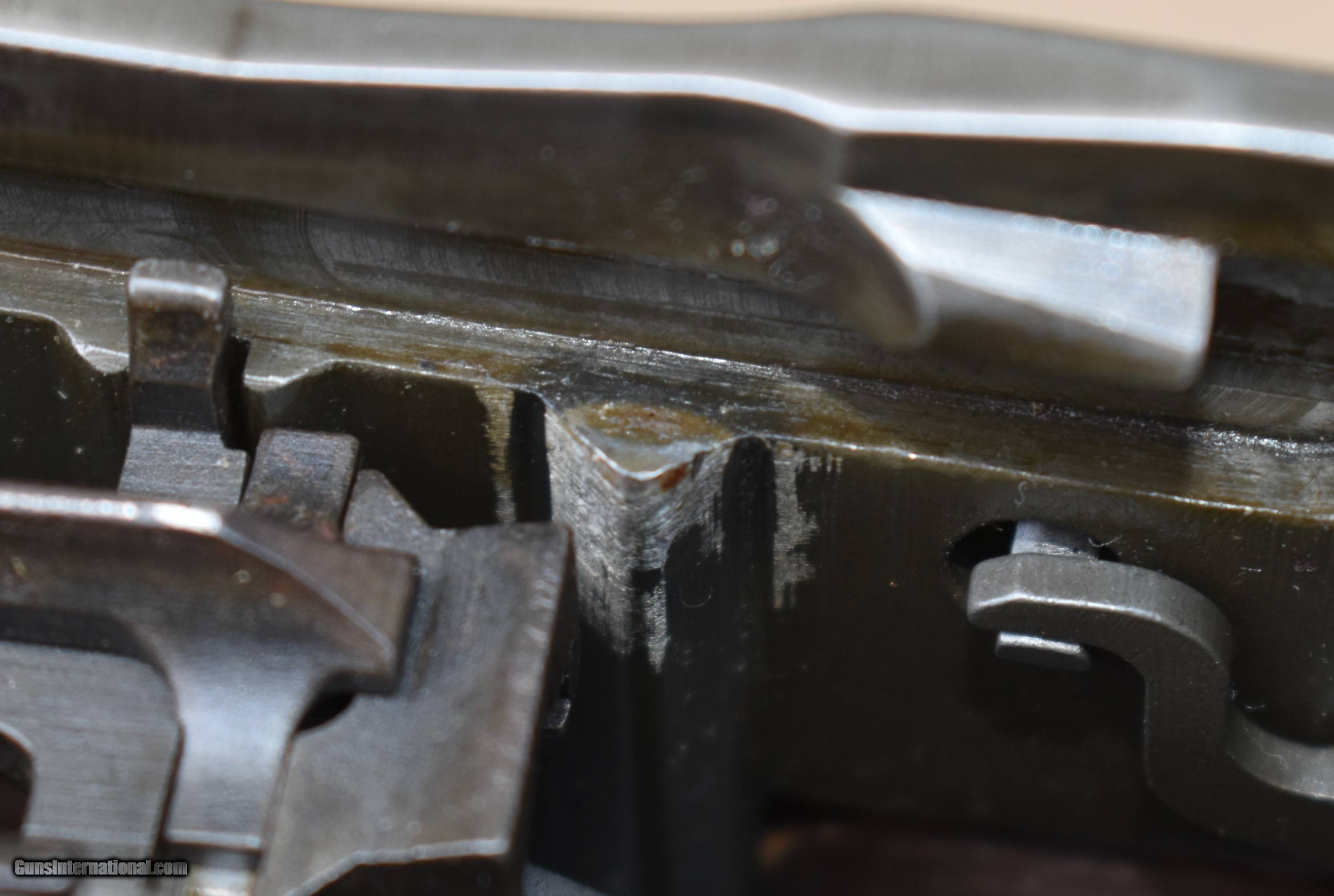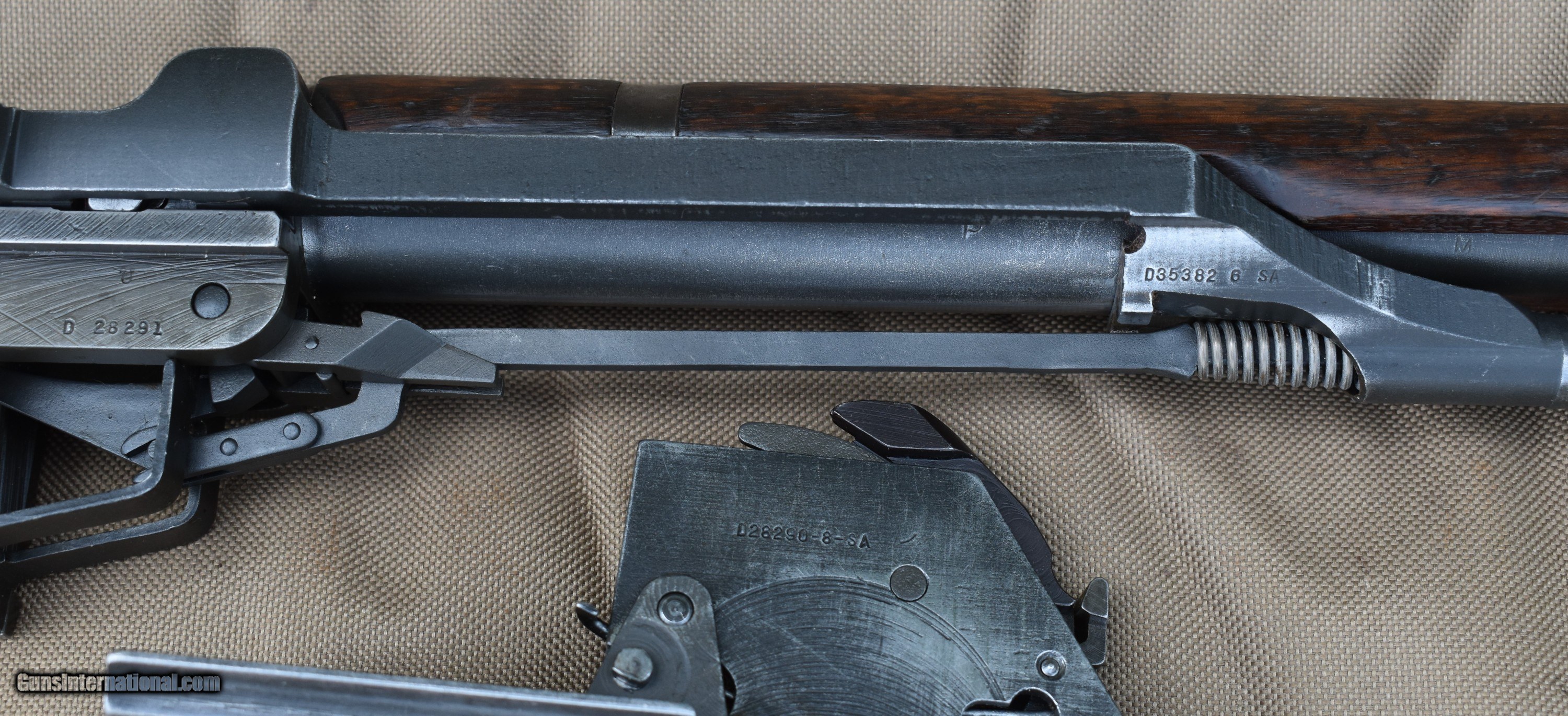 Description: Here is a nice Springfield M1 Garand original built in Feb 1939. 4 digit serial number 8108. Has been converted to gas port. The receiver has little to no finish. It does have the 7th round modification, in the white. It was never refinished after the modification was completed. According to a reliable source in the M1 world, there are a few examples of the 7th mod in the white existing. Not often seen and was most likely modified early in the program, possibly late 1940. Here is the breakdown: Serial number: 8108, February 1939 Barrel: SA 3-55, ME=3, TE=5, bright bore Bolt: D28287-12SA Heat lot S-A1(diamond) Op Rod: D35382 6 SA cut Type 2 lockbar rear sight Trigger guard: milled Trigger housing: D28290-8-SA Hammer: C46008-1 Safety: SA Follower: 11 Bullet guide: milled Follower Rod: Long fork Follower Arm: Single bevel Gas cylinder lock: chamfered Gas plug: T Gas cylinder: wide base Stock: DAS cartouche, circle P no serifs, Heavy shellac FREE SHIPPING IN THE LOWER 48. Must ship to a FFL or C&R. Payments: Check, MO, Bank check, all held to clear. $2450 SOLD |