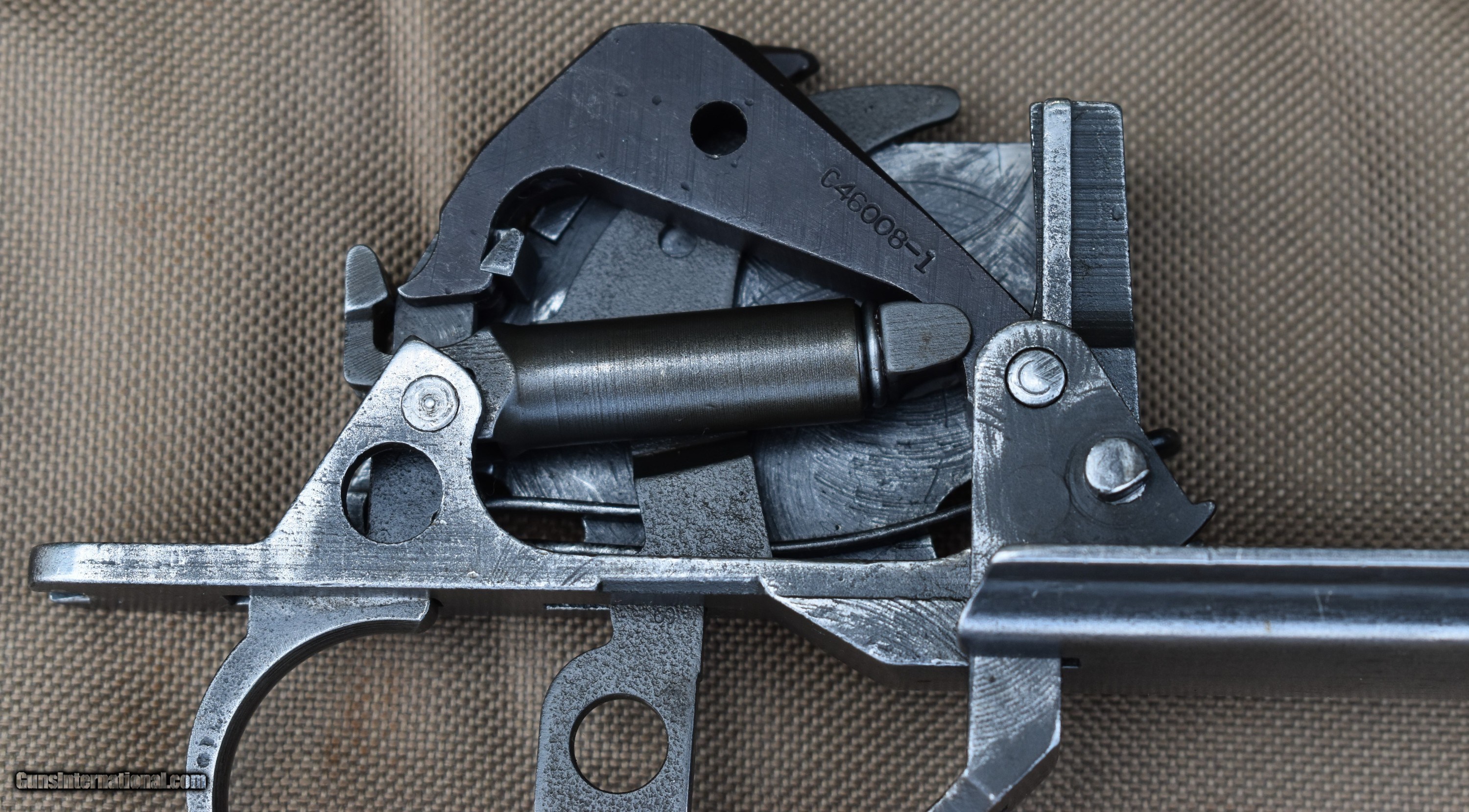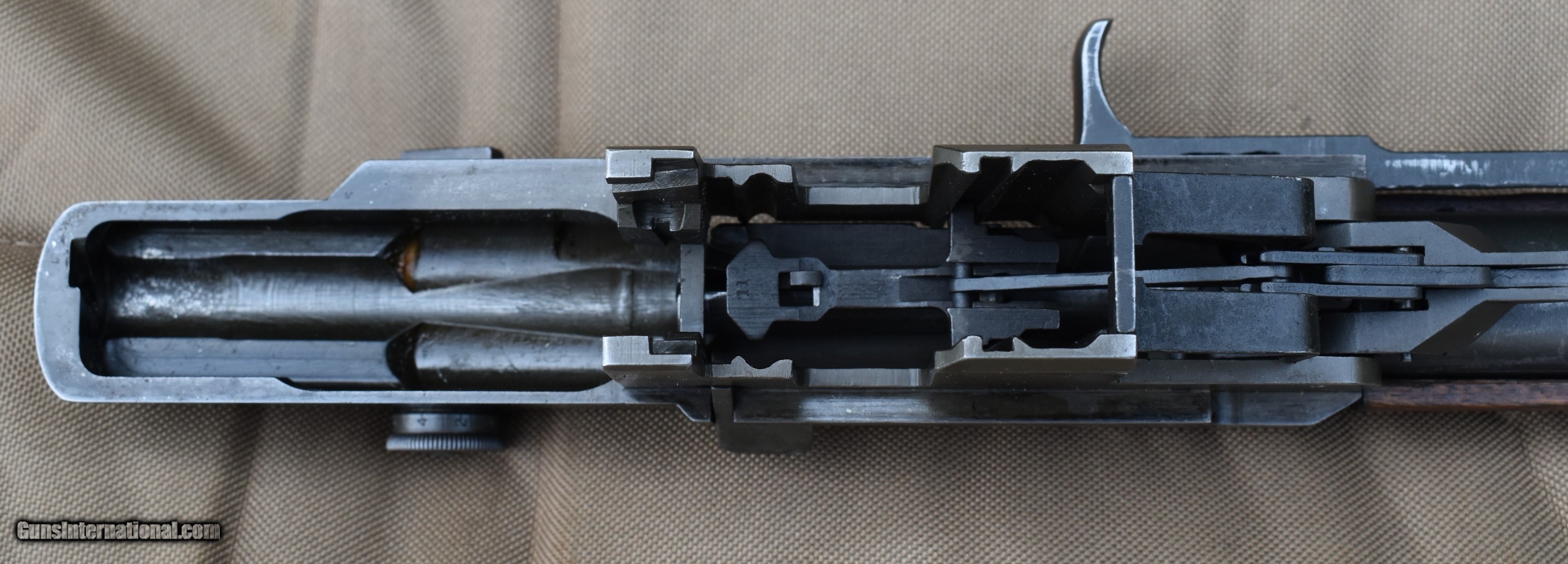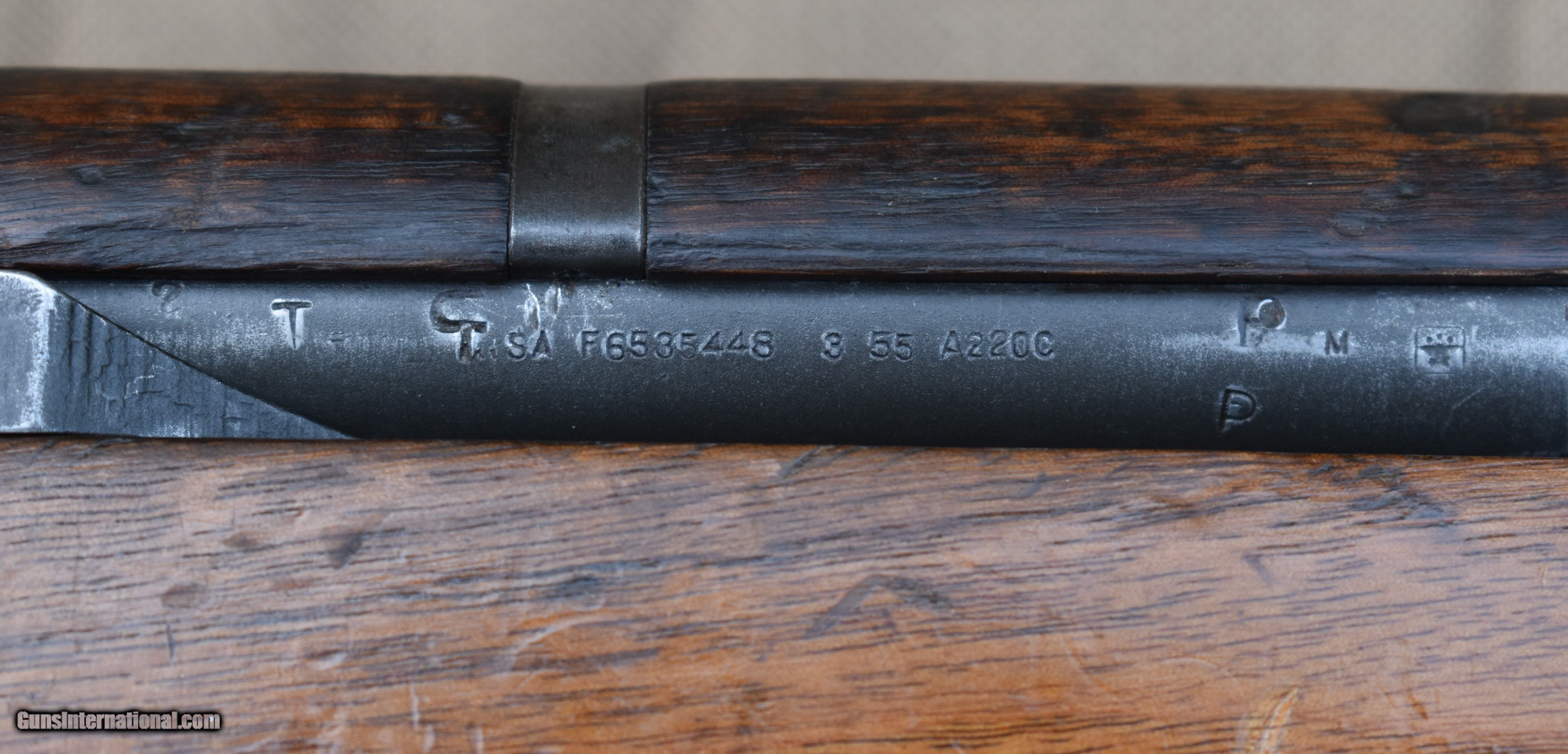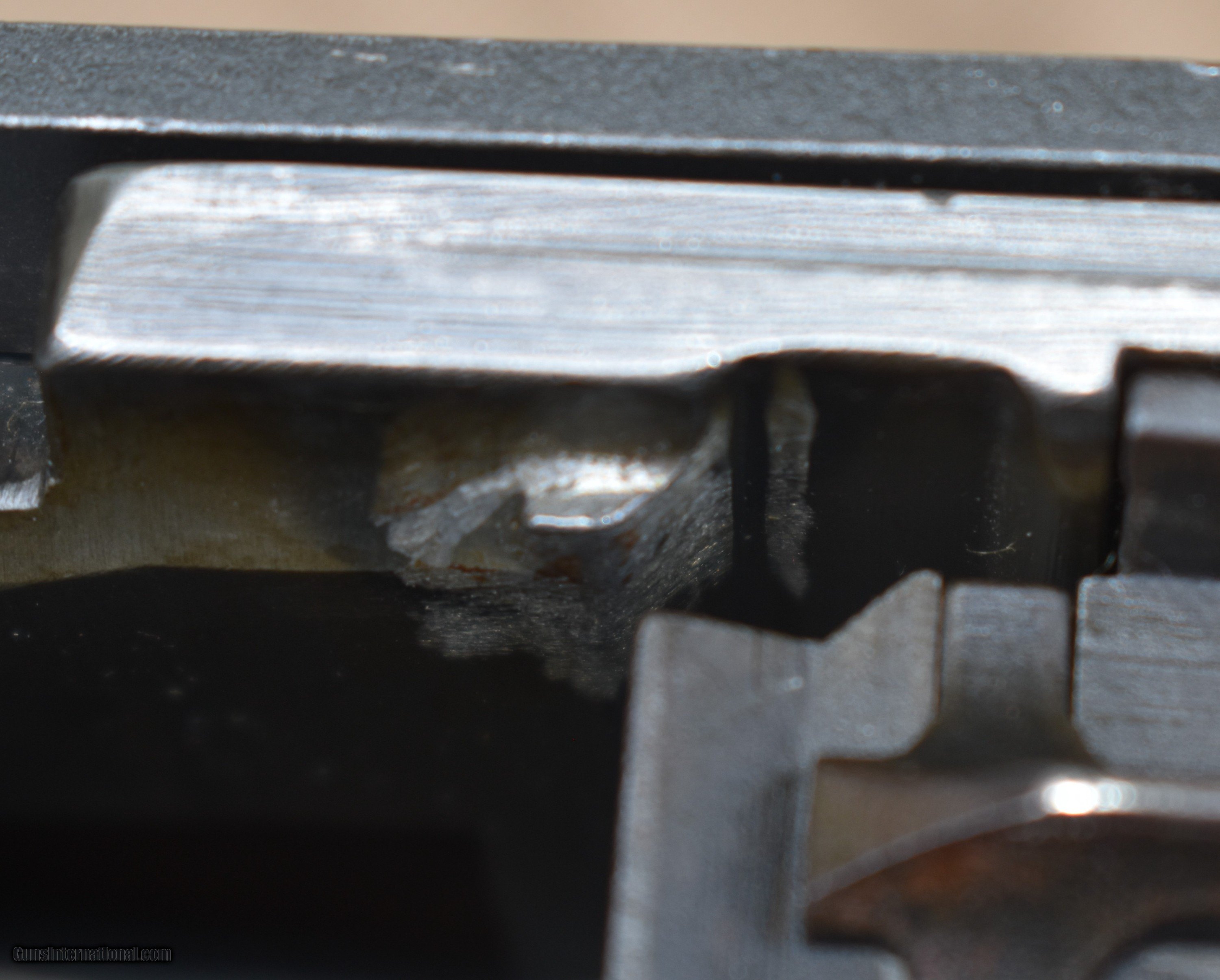 Description: Here is a nice Springfield M1 Garand original built in Feb 1939. 4 digit serial number 8108. Has been converted to gas port. The receiver has little to no finish. It does have the 7th round modification, in the white. It was never refinished after the modification was completed. According to a reliable source in the M1 world, there are a few examples of the 7th mod in the white existing. Not often seen and was most likely modified early in the program, possibly late 1940. Here is the breakdown: Serial number: 8108, February 1939 Barrel: SA 3-55, ME=3, TE=5, bright bore Bolt: D28287-12SA Heat lot S-A1(diamond) Op Rod: D35382 6 SA cut Type 2 lockbar rear sight Trigger guard: milled Trigger housing: D28290-8-SA Hammer: C46008-1 Safety: SA Follower: 11 Bullet guide: milled Follower Rod: Long fork Follower Arm: Single bevel Gas cylinder lock: chamfered Gas plug: T Gas cylinder: wide base Stock: DAS cartouche, circle P no serifs, Heavy shellac FREE SHIPPING IN THE LOWER 48. Must ship to a FFL or C&R. Payments: Check, MO, Bank check, all held to clear. $2450 SOLD |