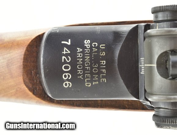 Description: Springfield M1 Garand .30-06 caliber rifle. Early 742XXX serial number M1 Garand. Refurbished with a 1950 dated barrel. Bore is excellent. Excellent overall.