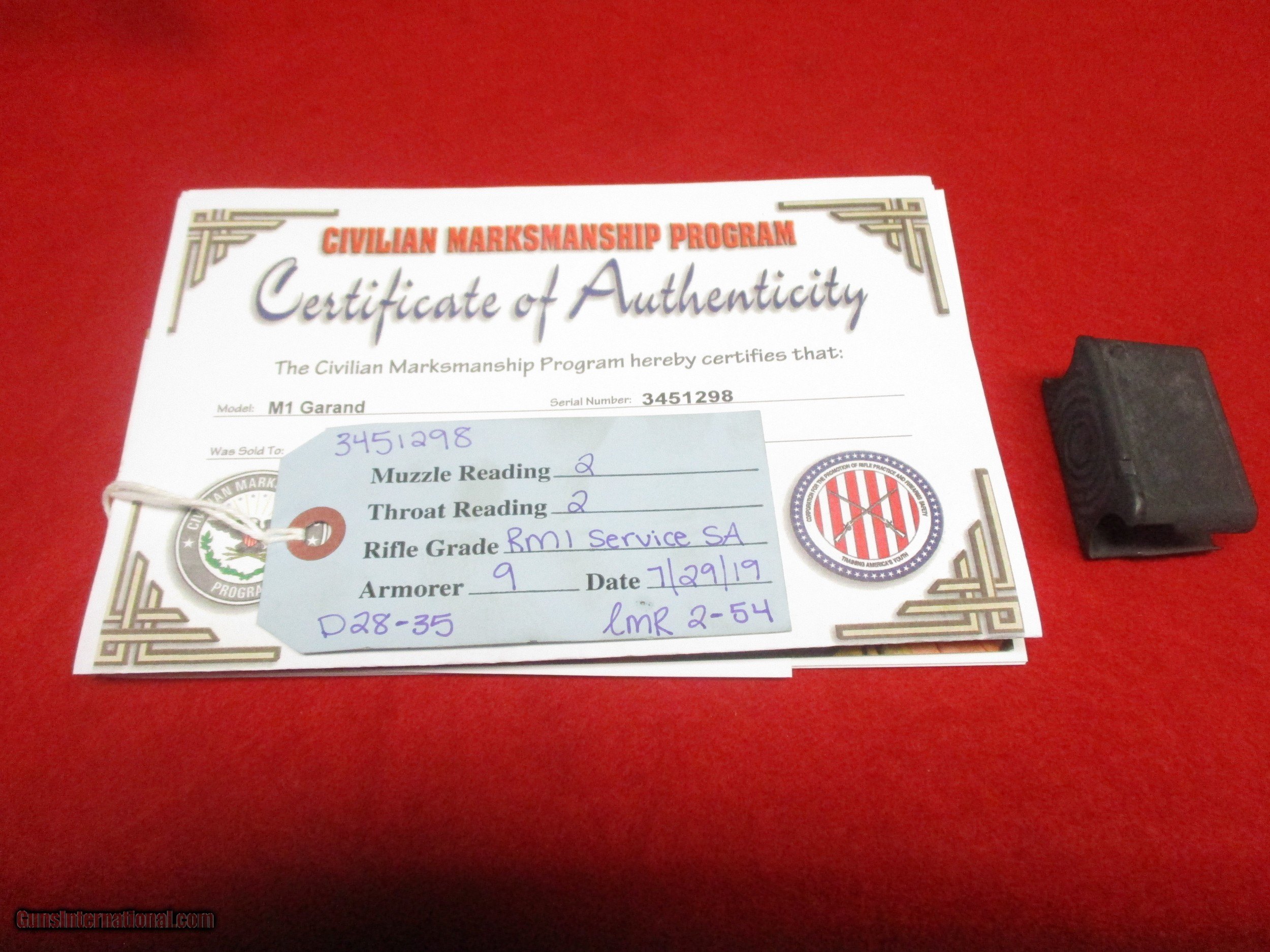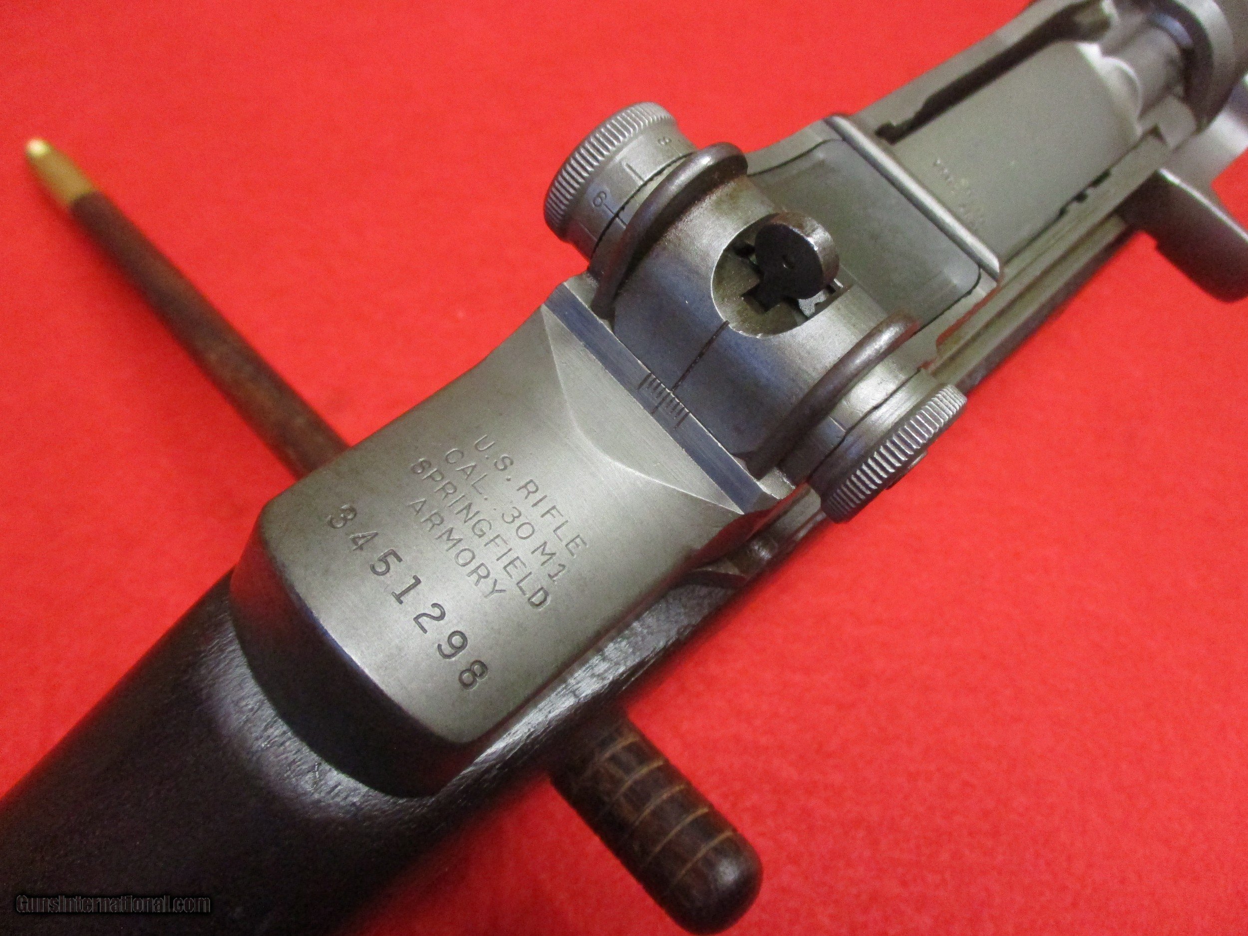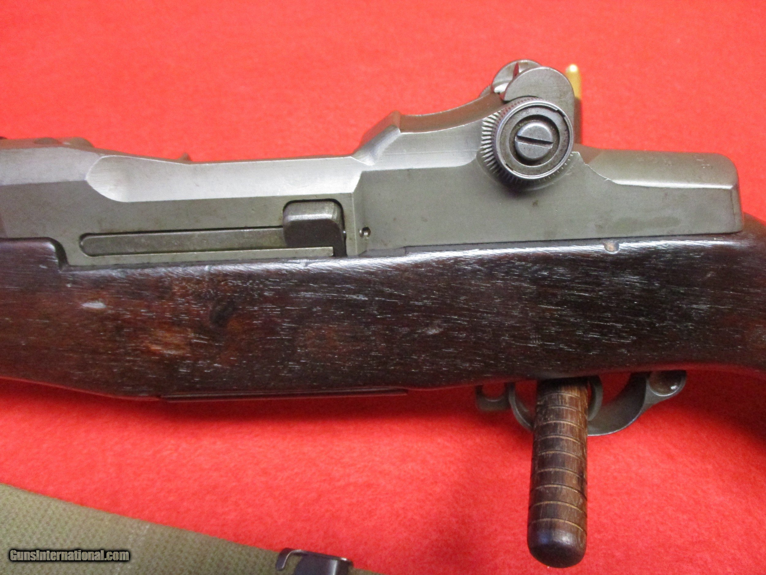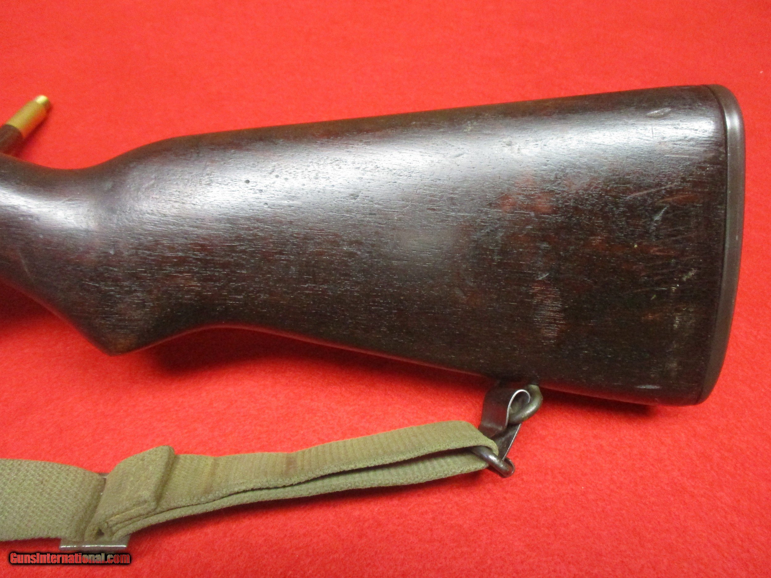 Description: The M1 is one of the most important firearms ever produced. It served faithfully from World War Two (as the standard issue rifle) all the way into early Vietnam (in the sniper role). This is a Springfield-built M1 sold through the Civilian Marksmanship Program (CMP). It was originally built at the Springfield Arsenal in February of 1945. Post-WW2, it was rebuilt either by HRA or IHC with a Line Material-supplied barrel made in February of 1954. Many M1 Garands were rebuilt after WW2. This gun is in good to excellent condition. The blue CMP tag indicates the rifle is in “Service Grade” condition. It also states the muzzle tightness as 2 while the throat as 2. Looking down the bore of the rifle, there is no rust or pitting. It will shoot extremely well. The stock appears to be original to the era and has some small dings in it, and a bur on the right side. It has the P-stamp in the wood as it should. The trigger group is of Winchester (W.R.A.) manufacture but uses a Springfield built safety and hammer. The bolt and charging handle/operating were made by Springfield as well. Many people like to modify these rifles for competition shooting. A word on handloading ammunition for this rifle. Normally, only 150gr bullets should be used in a standard issue M1. This is done to preserve the operating rod. Extensive use of heavy bullets in an unmodified Garand will result in the operated bending requiring replacement. In order to use match 168gr loads or heavier bullets, a Schuster gas plug must be fitted. For 220gr round nose ammo, adjust the plug so that the fired cases eject no more than five feet away. If they are ejecting something like twenty feet away, your operating rod is in danger. Hornady .30-caliber 225gr spitzers will usually be too long to fit and require single-loading into the chamber. These gas plugs work well, and I enjoy shooting my personal M1 Garand equipped as such. One important characteristic of the gun is the name Garand. It is named after its inventor after all. Today, most people pronounce it “Guh-rand”, the last part coming out like “grand” or “rand” (like Remington-Rand). This is not how Mr. Garand pronounced his own last name. The correct pronunciation is “Gare-rind” with the first part sounding like “dare” (“I dare you to…”) or “bear”, and the second part sounding like “wind” but with the rolling “r” sound instead of the “w”. Most people continue to pronounce the word as many always have (even in WW2) because of tradition but it’s nice to hear the correct pronunciation now and then. The rifle here comes with a CMP hard case, a certificate, and a sling. SOLD Manufacturer: Springfield Arsenal Model: U.S. Rifle, Caliber .30, M1 aka M1 Garand Serial Number: 3451298 Caliber Info: .30-06 Springfield, aka 7.62x63mm Bore: Rifled - 4-groove Condition: Used (military); CMP Service Grade Barrels: 24.0 inches (610mm) Action: Semi-auto Stock: Wood, storage space in butt, metal butt plate with flip open cover Fore End: Wood Butt Pad: Metal plate LOP: 13.25 inches (337mm) Finish: Parkerized Weight: 9.0 lbs. Sights: Peep rear sight, Blade front sight, Sight Radius 28.0 inches (710mm) Manufacture Date: February 1945 Extras: CMP paperwork, certificate, 1 en-bloc clip Case: CMP case |
