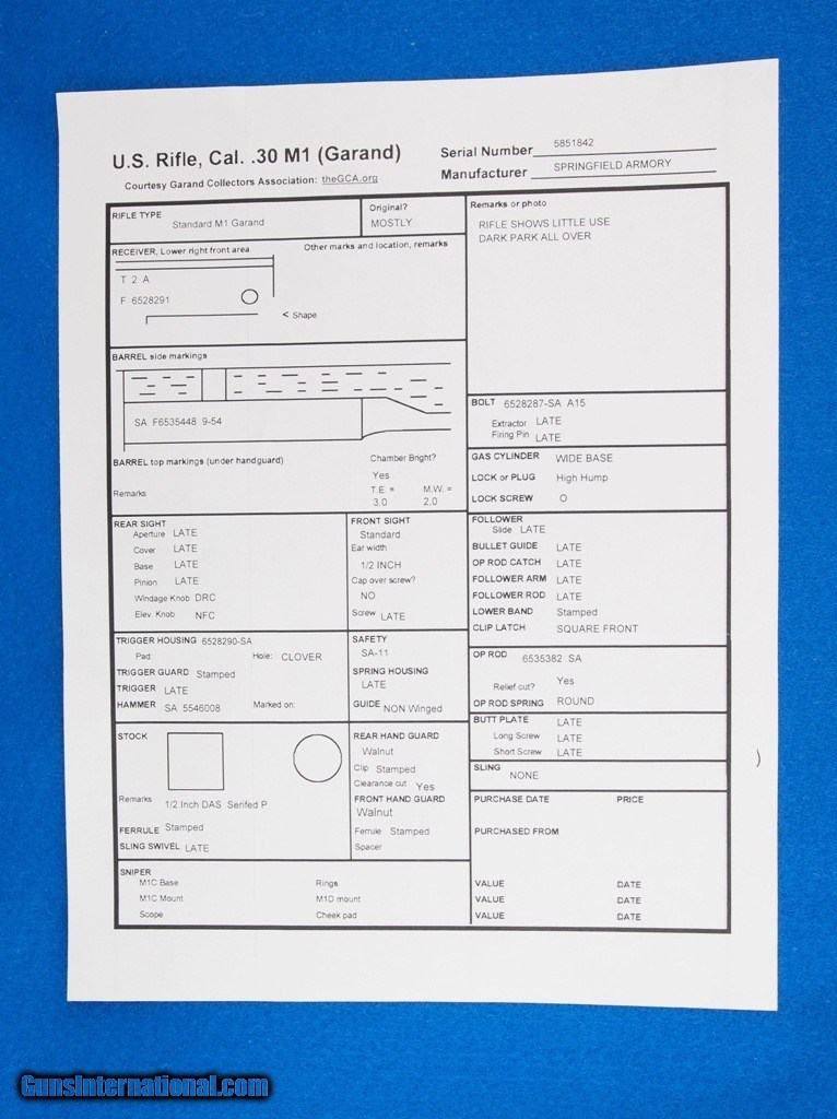 Description: Springfield M1 Garand MFG 1955 .30-06, Springfield Armory Serial 5851482. Standard 1955 rifle with SA marked parts. Stock has correct 1/2 inch DAS and serified P proof stamp. SA barrel has TE of 3.0 and MW of 2.0. Marked parts are SA. SA stock. Excellent correct condition rifle. Add 3% for Credit Card $35.00 Shipping SOLD |