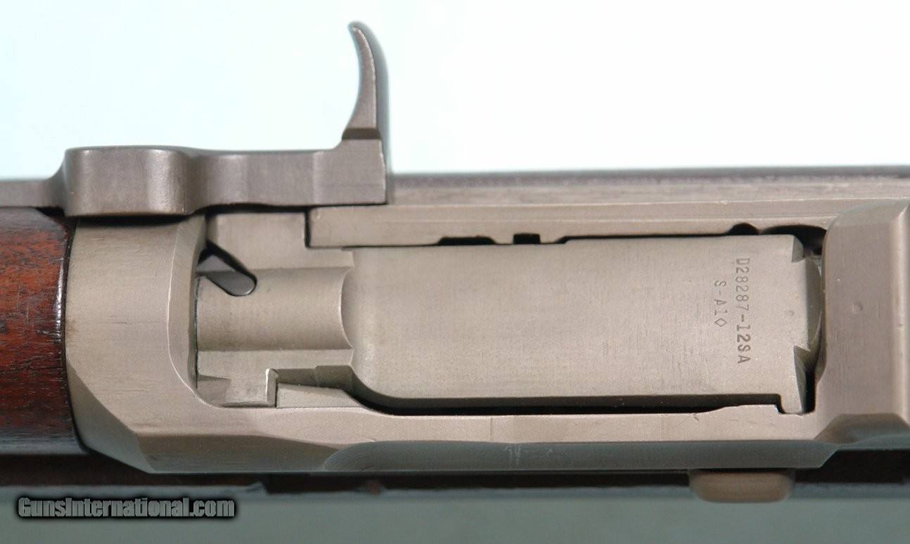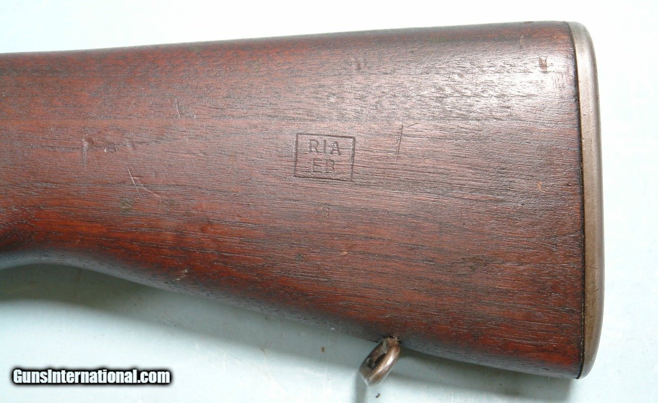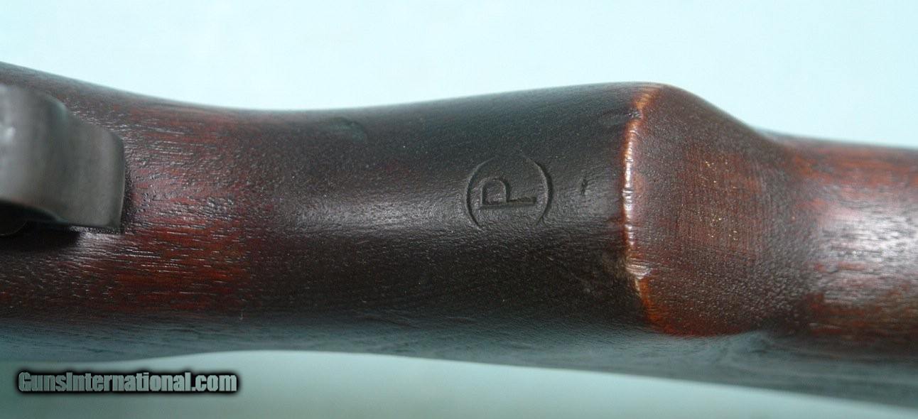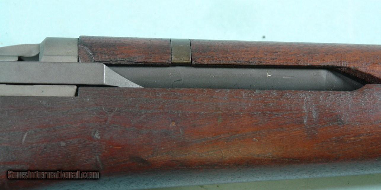 Description: 33046- WW2 WWII & KOREAN WAR SPRINGFIELD U.S. M1 OR M-1 GARAND .30-06 CAL. RIFLE. Original WW2 1944 production rifle serial numbered in the 2,xxx,xxx range with original 1944 barrel reworked in 1952 at Rock Island Arsenal and barrel proofed and dated “52” as well. All original rebuild with matching stock and handguard. Stock with Rock Island rectangular rebuild “RIA/EB” cartouche on butt and circle “P” proof on pistol grip behind guard. Excellent with 100% Parkerizing on metal and all the wood finish. Excellent bore and working order. Extra nice M1. $1750. Curio/Relic: Yes Rifle Caliber: .30-06 Springfield Price: $1,750.00 Contact Seller |