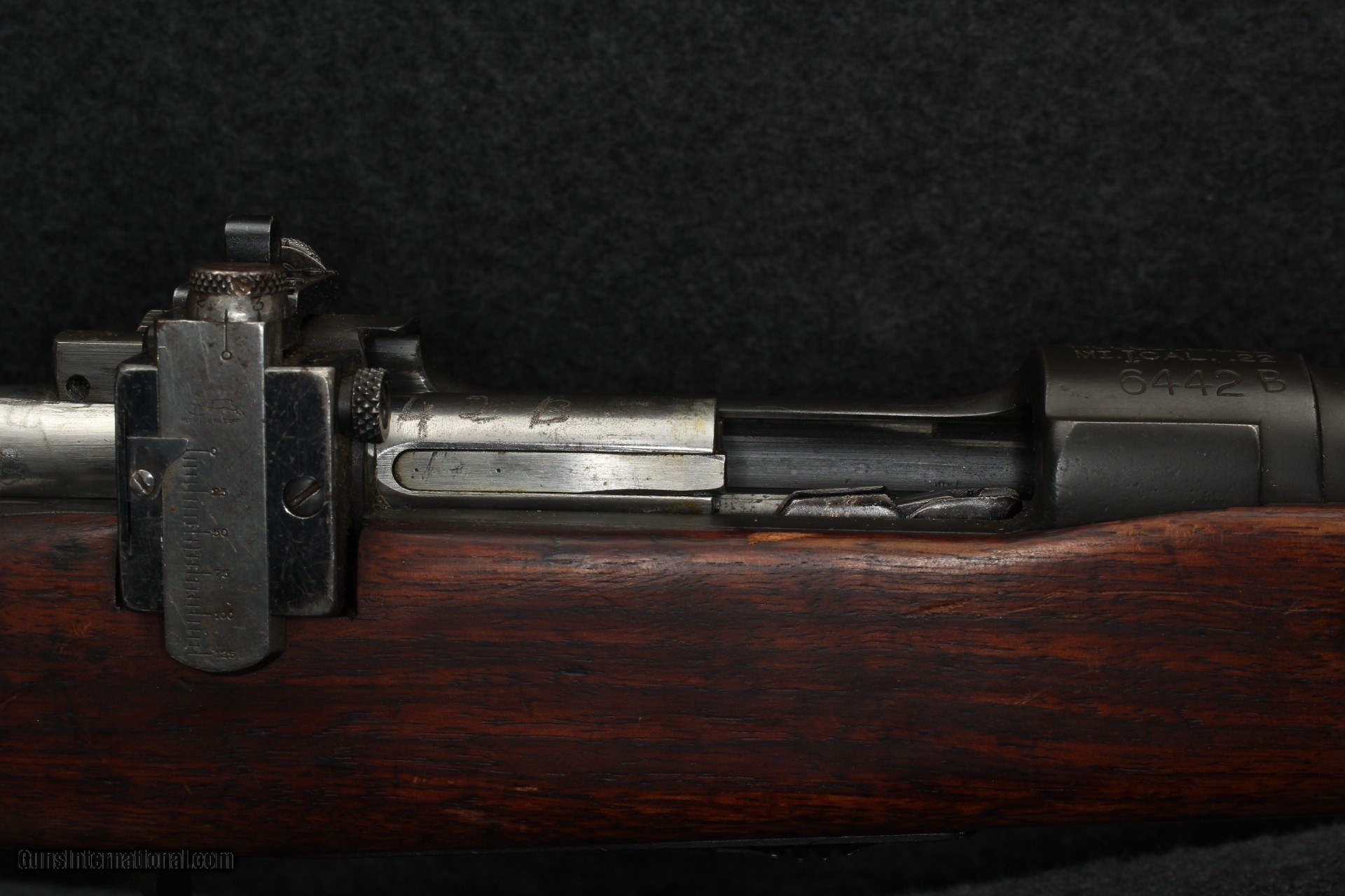 Description: 22lr, serial number 64XXB. Upgraded from M1 to M2 configuration. Has correct B in serial number, "II" instead of "2" marking and bolt is marked "M2" showing correct upgrades. Metal is parkerized, retains 85%. Bolt shows minor wear and correct electro pencil serial numbering. Bore is excellent. Correct Lyman 48 rear sight. Rear sight missing aperture. Correct front sight appears slightly bent. Barrel is marked "SA 5-26". Buttstock has minor cracks at lower and upper tangs. No cartouche remains visible. Correct front band and sling swivel. Correct rear sling swivel, buttplate and floorplate. Comes with 1 M2 marked correct magazine. More photos on request. Pleaes contact for shipping and insurance. Will ship direct to C&R holder. SOLD Curio/Relic: Yes Rifle Caliber: .22 Long Rifle |