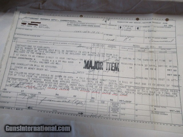 Description: Ser no 106xx, Barrel Date 1-42, 24" Barrel, 22 LR, Rifle looks unused, Comes with its shipping Box and paperwork from Letterkenny Ordnance Depot, Buyer pays 45.00 shipping Pa residents add 6% sales tax, Price is for check or money order, CC add 2% SOLD |