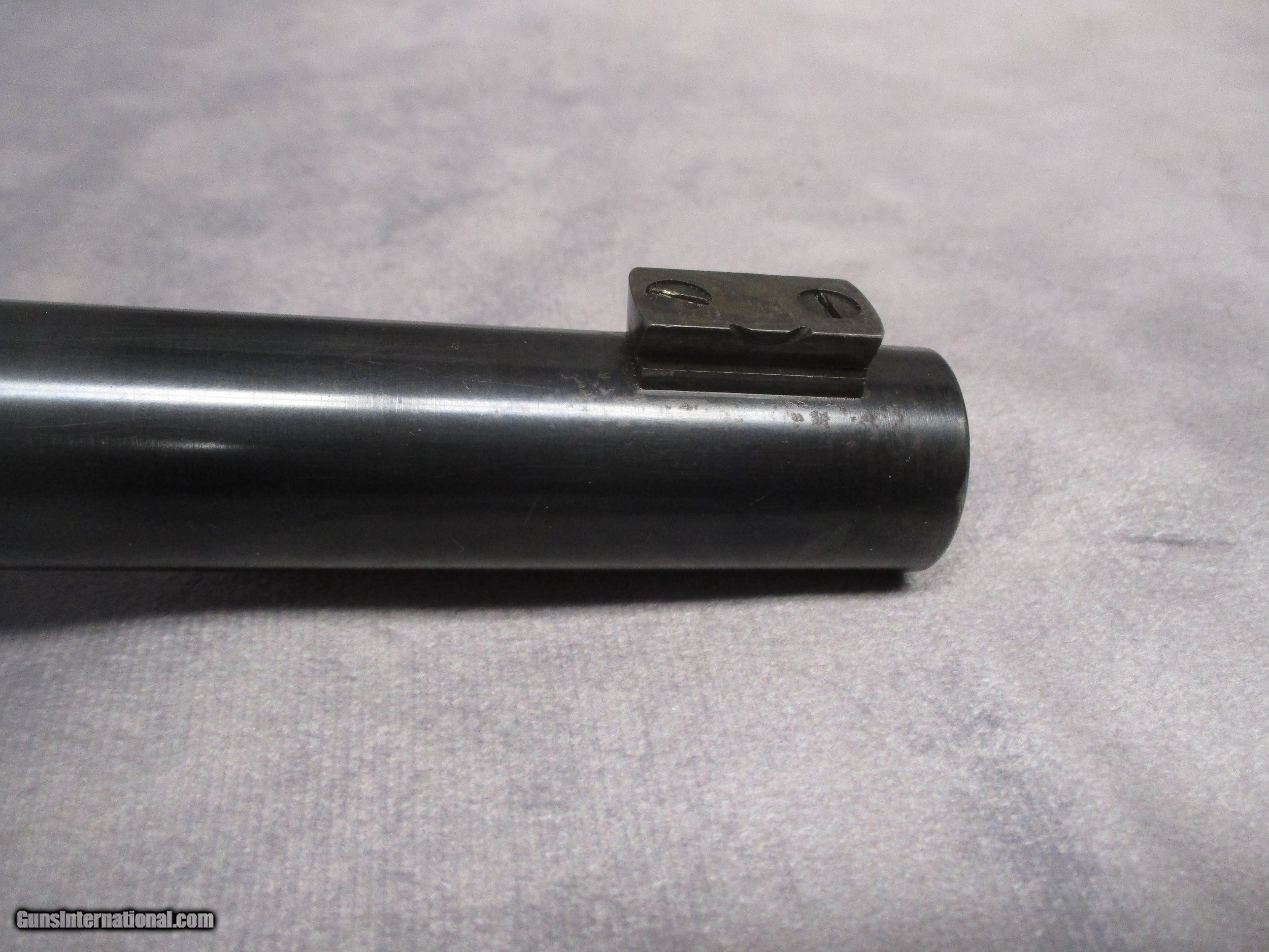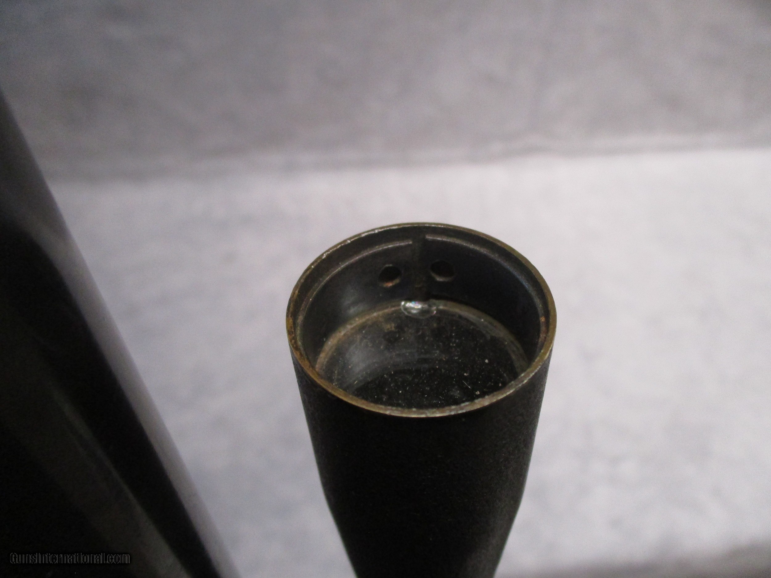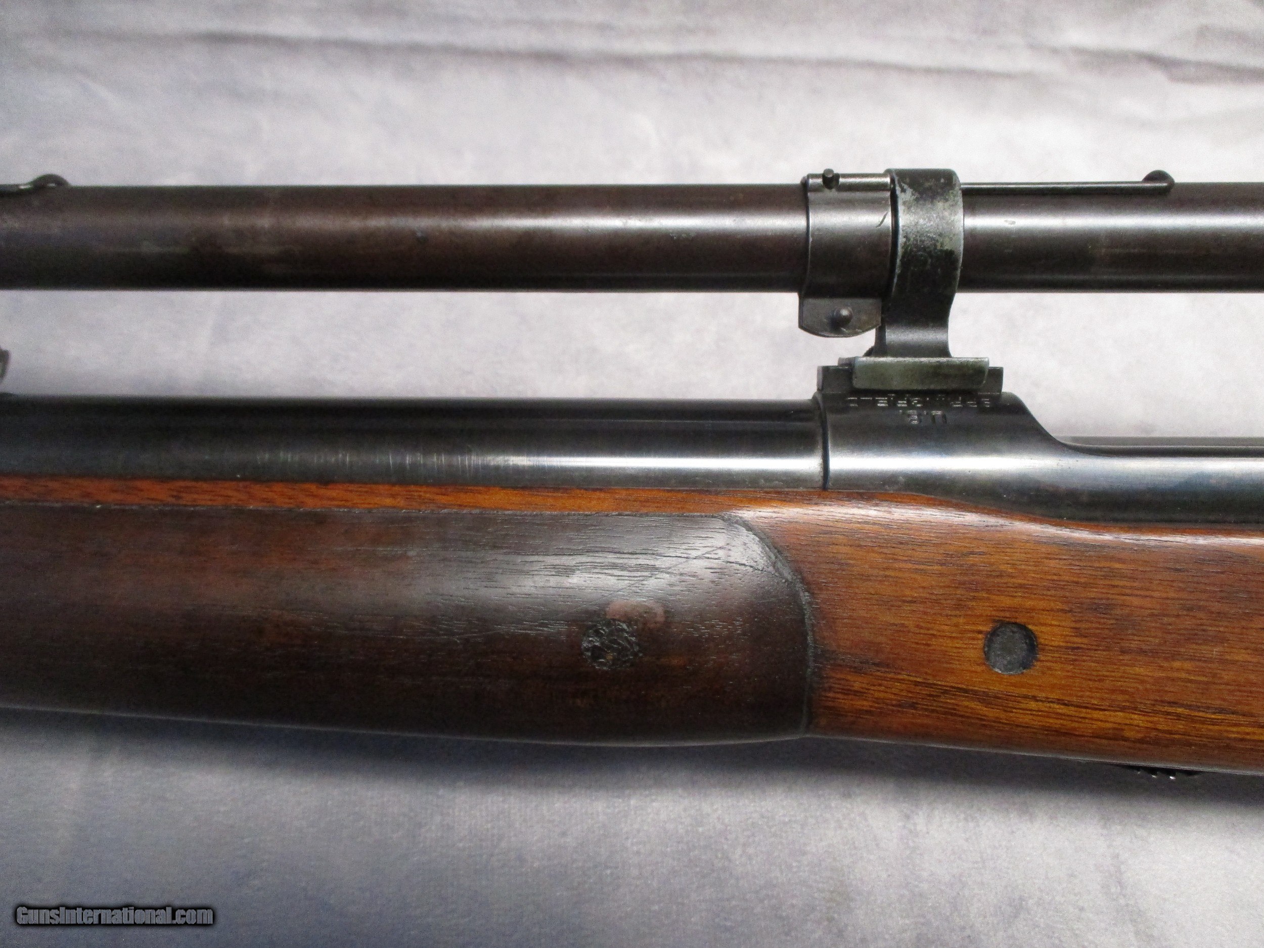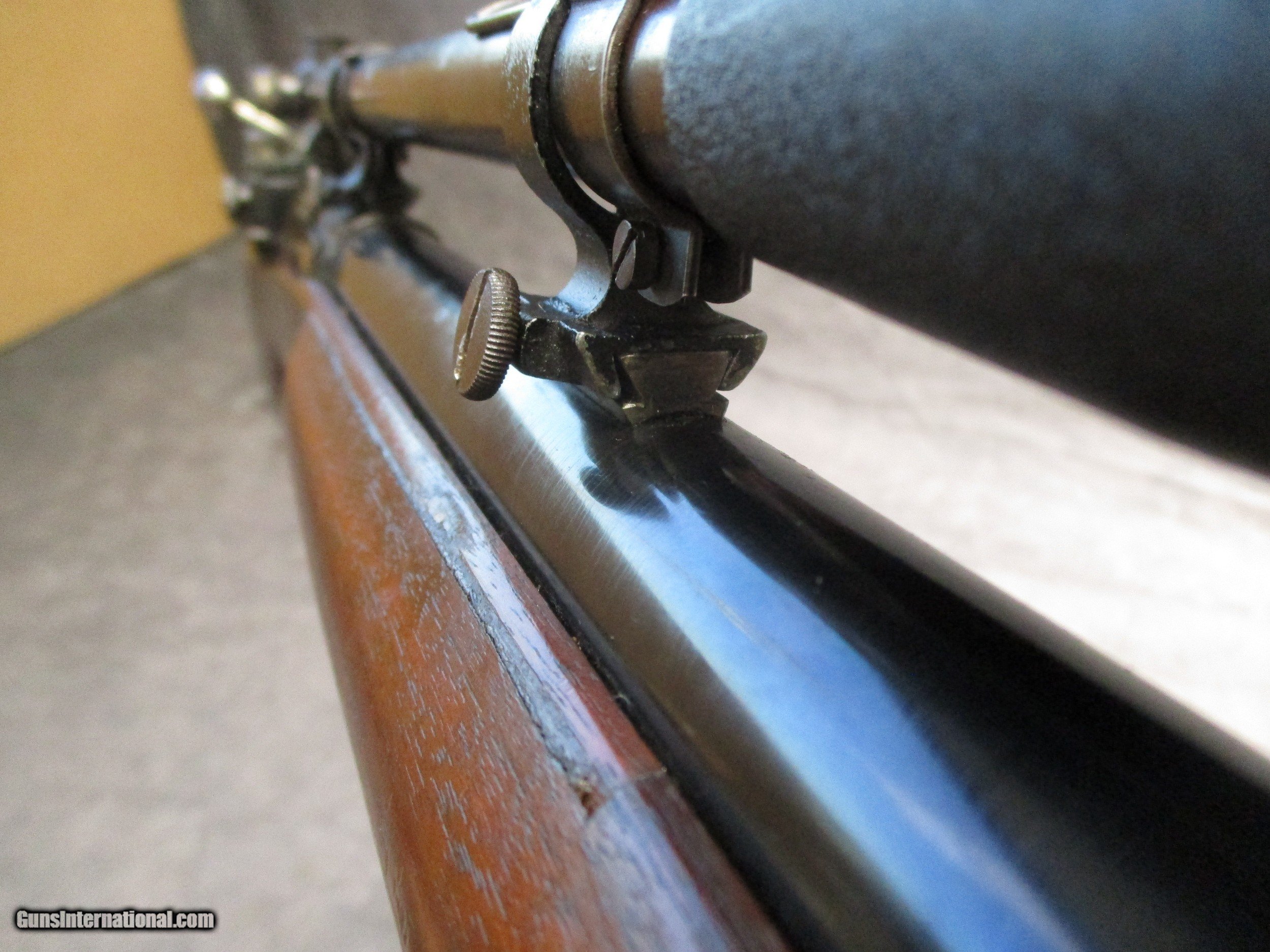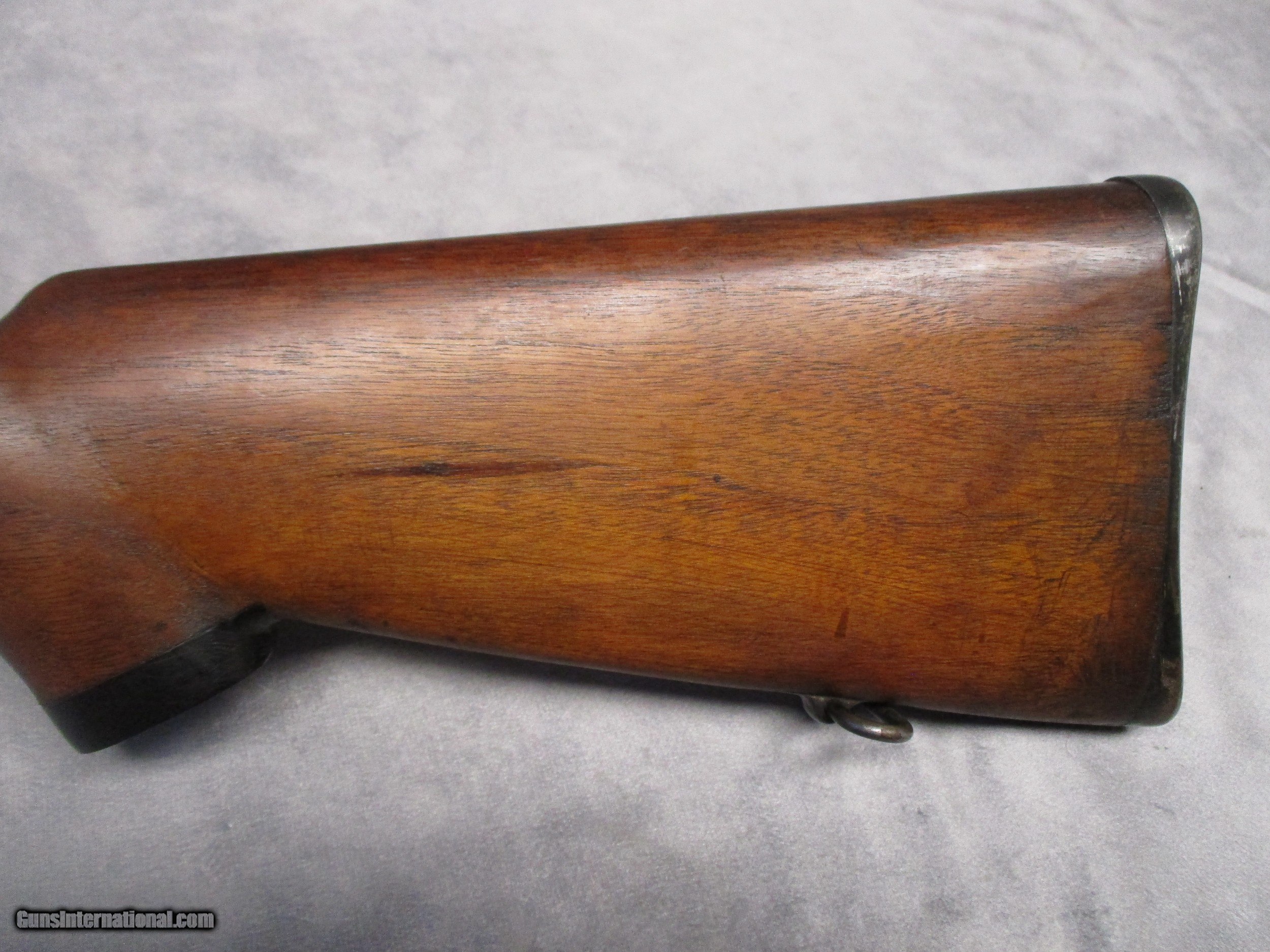 Description: This Springfield M2 was acquired from the J.M. Davis Arms Historical Museum located in Claremore, Oklahoma. It still has the metal brass identification tag attached. The museum ed off 1,200 of its more than 20,000 firearms. Due to the serial number it is a very early 1922 Springfield. Obviously, it was professionally modified for serious target/competition shooting due to its enhanced fore arm, heavy barrel, target sights, and a Mossberg M4 target scope. The M2 Rifle was created by the Springfield Arsenal in 1932 as a successor to the previous 1922M1 rifle. Compared to its predecessor, it featured a new bolt with adjustable headspace and a better extractor. The rear striker was fitted with a large round disk nut. The outer edges of the nut were serrated for grasping to cock the rifle manually. It also functioned as a gas deflector in the event of a ruptured case. On top of this, the trigger guard assembly and magazine mount were reworked, deleting the filler block in the magwell and installing a push button release. Officially, the rifle was marked “U.S. Springfield Armory, Cal .22, M2.” They were not drilled and tapped for scope mounts. The modified rifle shown here is in good condition overall. Unlike many modified M2 rifles, this one is still chambered for the .22 Long Rifle. Many others were converted to single shot rifles chambered for the .22 Hornet round. There is some light rust around the barrel near the muzzle, but for the rest of the barrel the bluing is in excellent shape. The bore is in pristine condition. The stock has fairly light handling wear. The front scope base is bent but still maintains a solid grip on the mount. The front lens of the scope has a slight chip in the lower left quadrant. Looking through the scope still gives a good picture however. As with all small diameter scopes, field of view is somewhat limited, but that did not stop them from being very popular back in the days of rimfire benchrest competition. SOLD Rifle Caliber: .22 Long Rifle Manufacturer: Springfield Armory Model: M2 Serial Number: 20241 Bore: Rifled Condition: Good Barrel Type: Round, 0.90 inches (23 mm) diameter edge to edge at muzzle Action: Bolt Action Triggers: Single Stock: Walnut Fore End: Walnut – benchrest forearm Butt Pad: Metal plate LOP: 14.0 inches (356 mm) Finish: Blued Sights: Mossberg M4 4x scope Case: Plastic hard case |