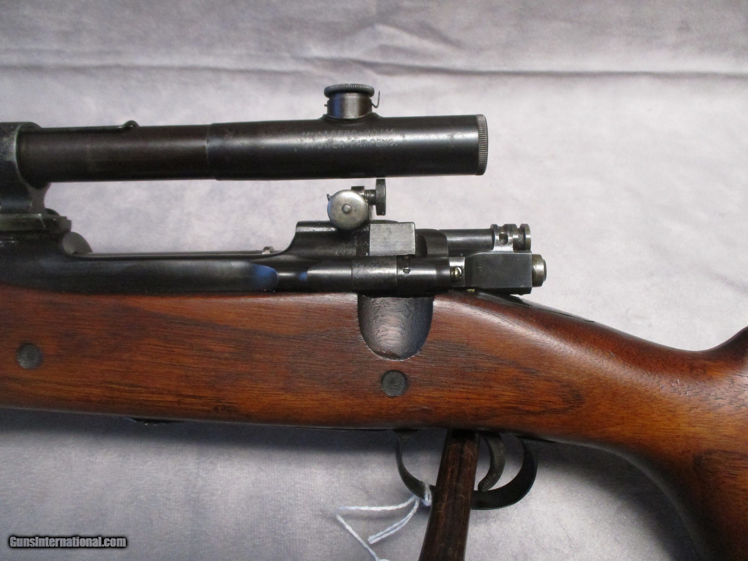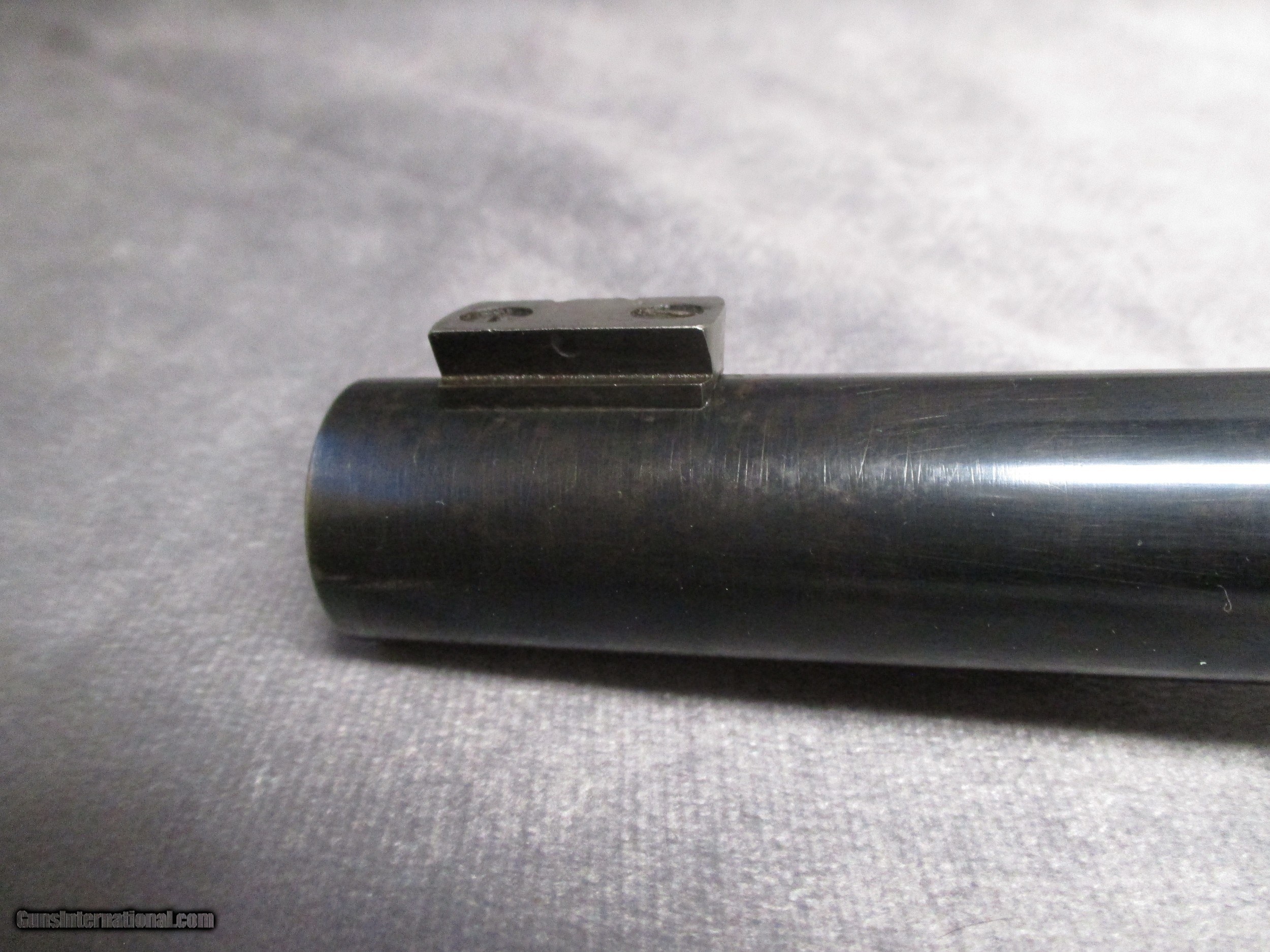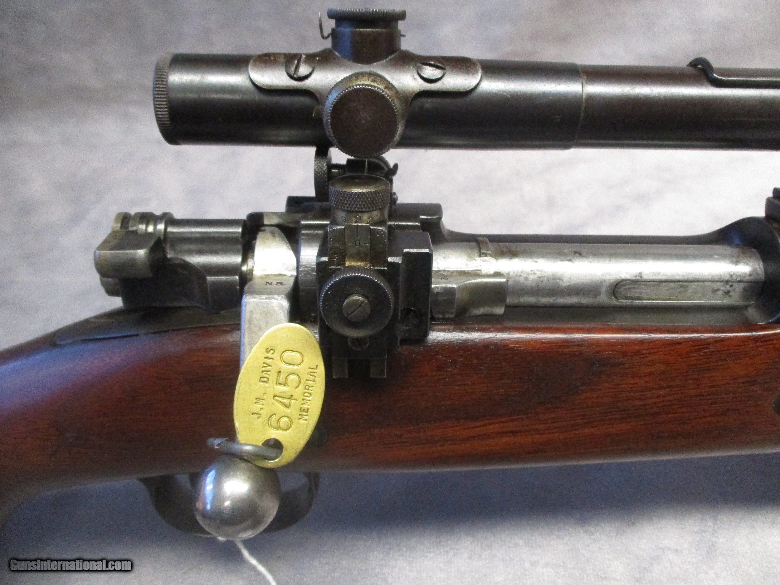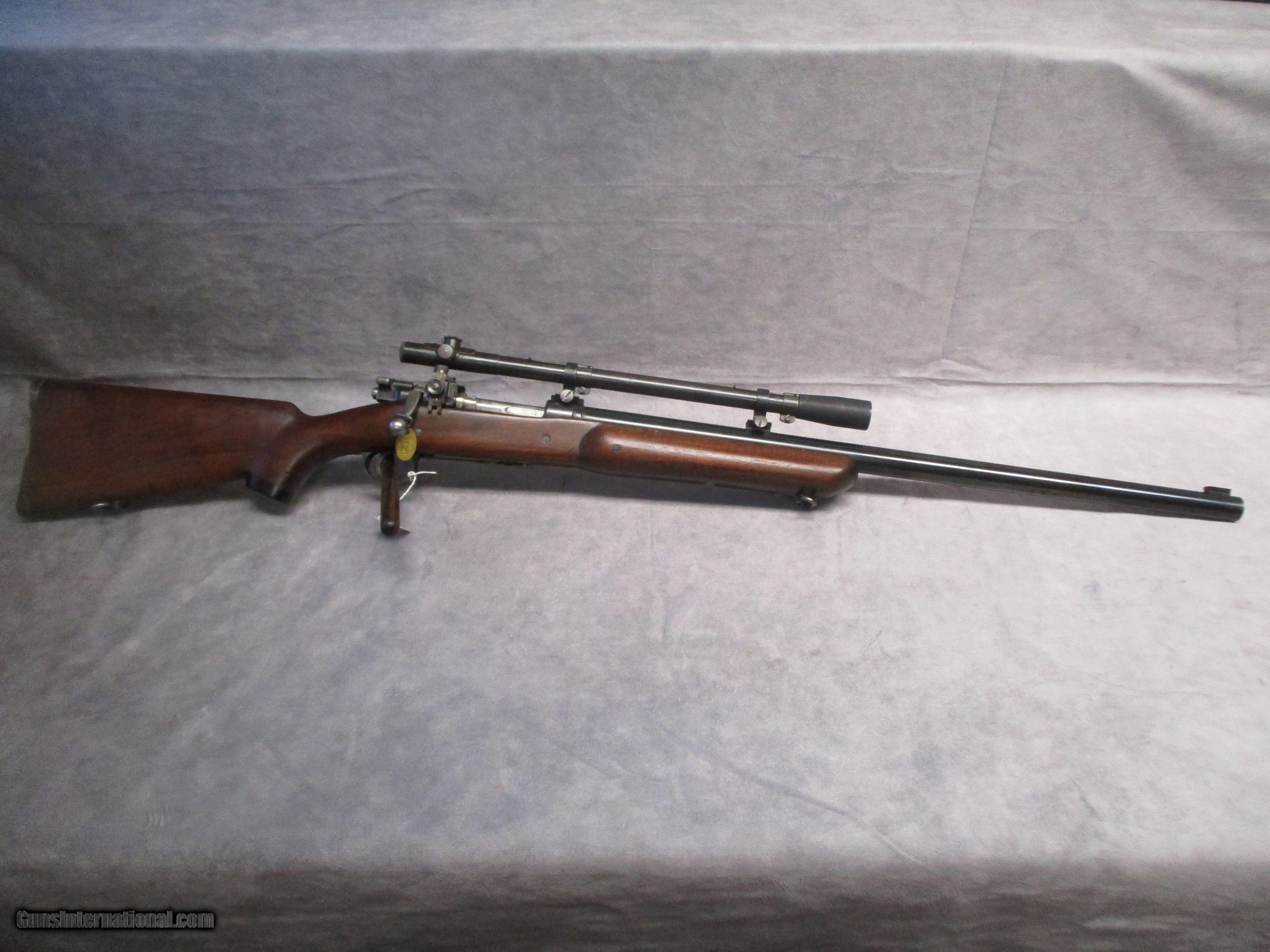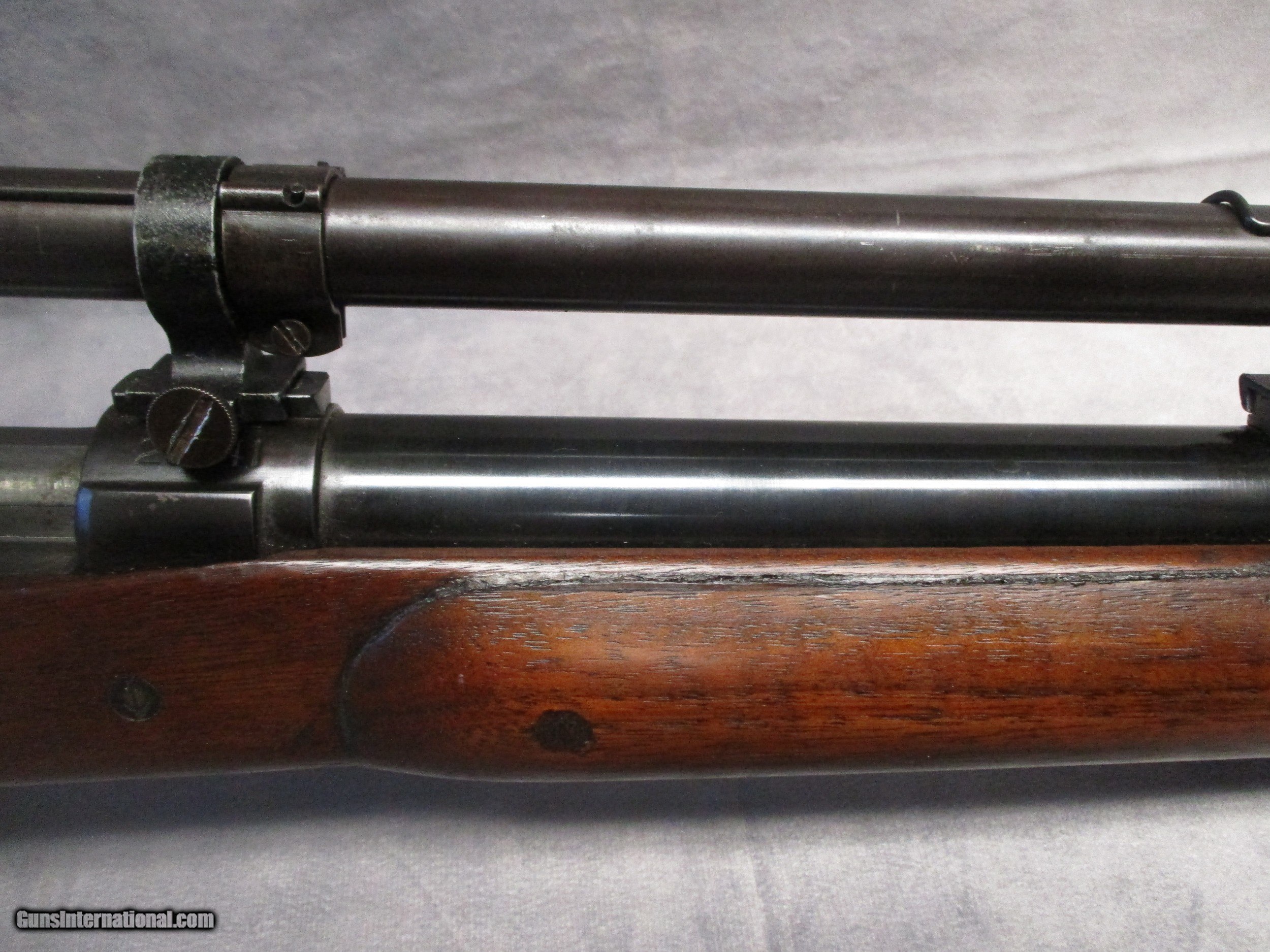 Description: This Springfield M2 was acquired from the J.M. Davis Arms Historical Museum located in Claremore, Oklahoma. It still has the metal brass identification tag attached. The museum ed off 1,200 of its more than 20,000 firearms. Due to the serial number it is a very early 1922 Springfield. Obviously, it was professionally modified for serious target/competition shooting due to its enhanced fore arm, heavy barrel, target sights, and a Mossberg M4 target scope. The M2 Rifle was created by the Springfield Arsenal in 1932 as a successor to the previous 1922M1 rifle. Compared to its predecessor, it featured a new bolt with adjustable headspace and a better extractor. The rear striker was fitted with a large round disk nut. The outer edges of the nut were serrated for grasping to cock the rifle manually. It also functioned as a gas deflector in the event of a ruptured case. On top of this, the trigger guard assembly and magazine mount were reworked, deleting the filler block in the magwell and installing a push button release. Officially, the rifle was marked “U.S. Springfield Armory, Cal .22, M2.” They were not drilled and tapped for scope mounts. The modified rifle shown here is in good condition overall. Unlike many modified M2 rifles, this one is still chambered for the .22 Long Rifle. Many others were converted to single shot rifles chambered for the .22 Hornet round. There is some light rust around the barrel near the muzzle, but for the rest of the barrel the bluing is in excellent shape. The bore is in pristine condition. The stock has fairly light handling wear. The front scope base is bent but still maintains a solid grip on the mount. The front lens of the scope has a slight chip in the lower left quadrant. Looking through the scope still gives a good picture however. As with all small diameter scopes, field of view is somewhat limited, but that did not stop them from being very popular back in the days of rimfire benchrest competition. SOLD Rifle Caliber: .22 Long Rifle Manufacturer: Springfield Armory Model: M2 Serial Number: 20241 Bore: Rifled Condition: Good Barrel Type: Round, 0.90 inches (23 mm) diameter edge to edge at muzzle Action: Bolt Action Triggers: Single Stock: Walnut Fore End: Walnut – benchrest forearm Butt Pad: Metal plate LOP: 14.0 inches (356 mm) Finish: Blued Sights: Mossberg M4 4x scope Case: Plastic hard case |