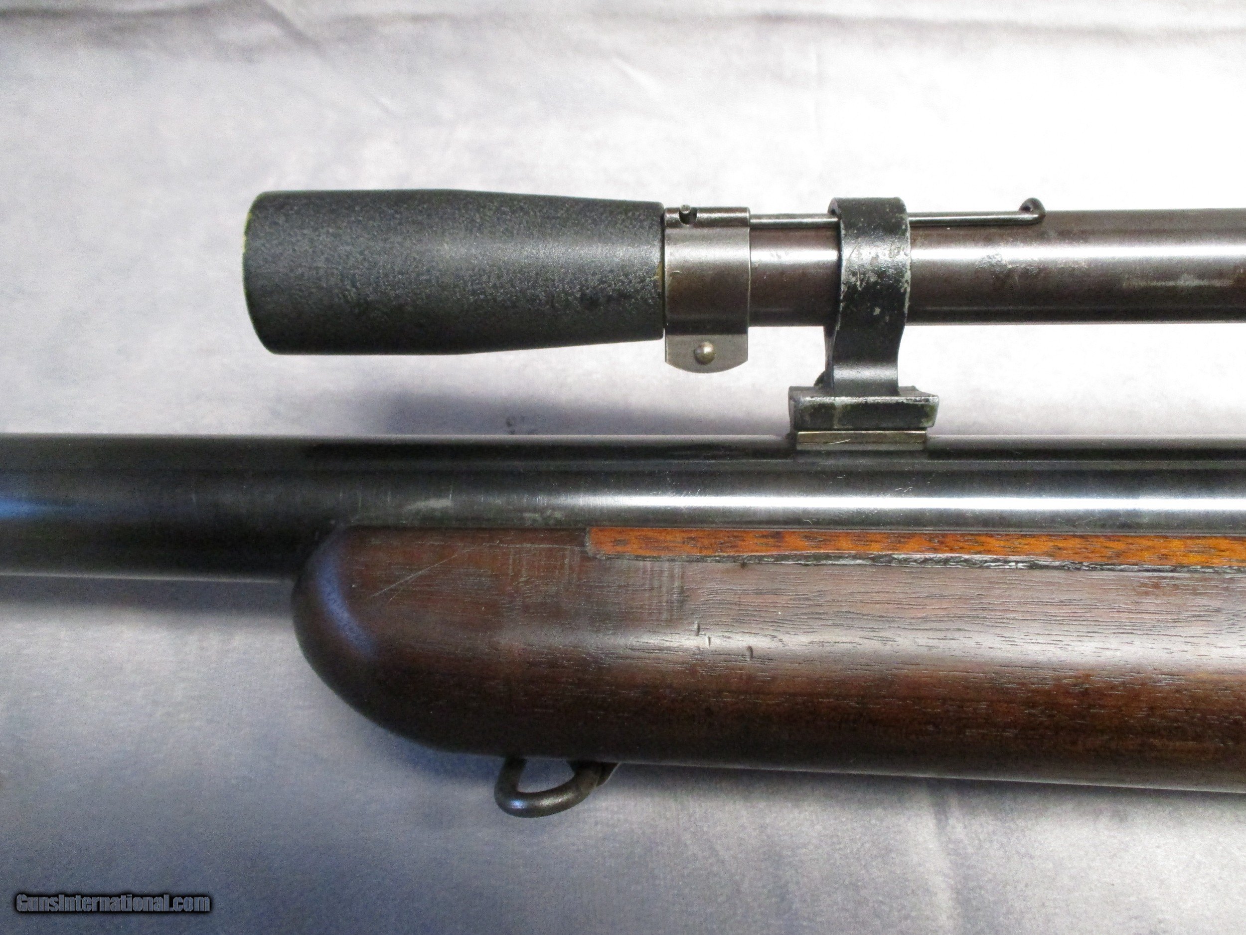 Description: This Springfield M2 was acquired from the J.M. Davis Arms Historical Museum located in Claremore, Oklahoma. It still has the metal brass identification tag attached. The museum ed off 1,200 of its more than 20,000 firearms. Due to the serial number it is a late production M2. Obviously, it was professionally modified for serious target/competition shooting due to its enhanced fore arm, heavy barrel, target sights, and a Mossberg M4 target scope. The M2 Rifle was created by the Springfield Arsenal in 1932 as a successor to the previous 1922M1 rifle. Compared to its predecessor, it featured a new bolt with adjustable headspace and a better extractor. The rear striker was fitted with a large round disk nut. The outer edges of the nut were serrated for grasping to cock the rifle manually. It also functioned as a gas deflector in the event of a ruptured case. On top of this, the trigger guard assembly and magazine mount were reworked, deleting the filler block in the magwell and installing a push button release. Officially, the rifle was marked “U.S. Springfield Armory, Cal .22, M2.” They were not drilled and tapped for scope mounts. The modified rifle shown here is in good condition overall. Unlike many modified M2 rifles, this one is still chambered for the .22 Long Rifle. Many others were converted to single shot rifles chambered for the .22 Hornet round. There is some light rust around the barrel near the muzzle, but for the rest of the barrel the bluing is in excellent shape. The bore is in pristine condition. The stock has fairly light handling wear. The front scope base is bent but still maintains a solid grip on the mount. The front lens of the scope has a slight chip in the lower left quadrant. Looking through the scope still gives a good picture however. As with all small diameter scopes, field of view is somewhat limited, but that did not stop them from being very popular back in the days of rimfire benchrest competition. SOLD Rifle Caliber: .22 Long Rifle Manufacturer: Springfield Arsenal Model: M2 Serial Number: 20241 Bore: Rifled Condition: Good to Excellent Barrel Type: Heavy, 0.90 inches (23 mm) OD Action: Bolt Action Triggers: Single Stock: Wood, pistol grip type Fore End: Wood - Bench rest width Butt Pad: Metal plate LOP: 14.0 inches (356 mm) Finish: Blued Weight: 13.0 lbs. Sights: Mossberg M4 4x scope |