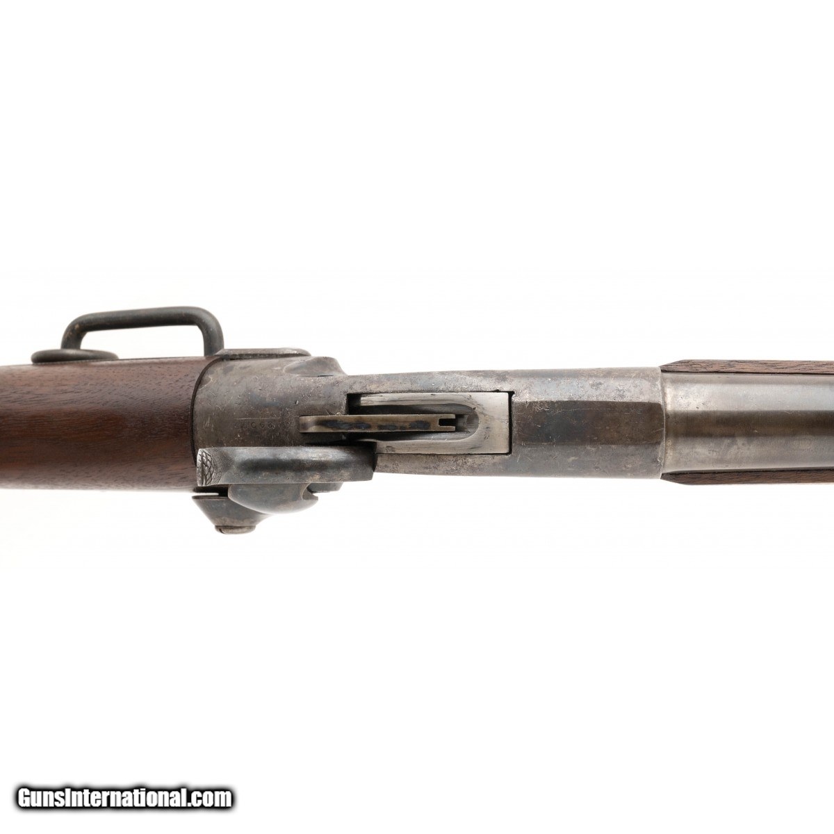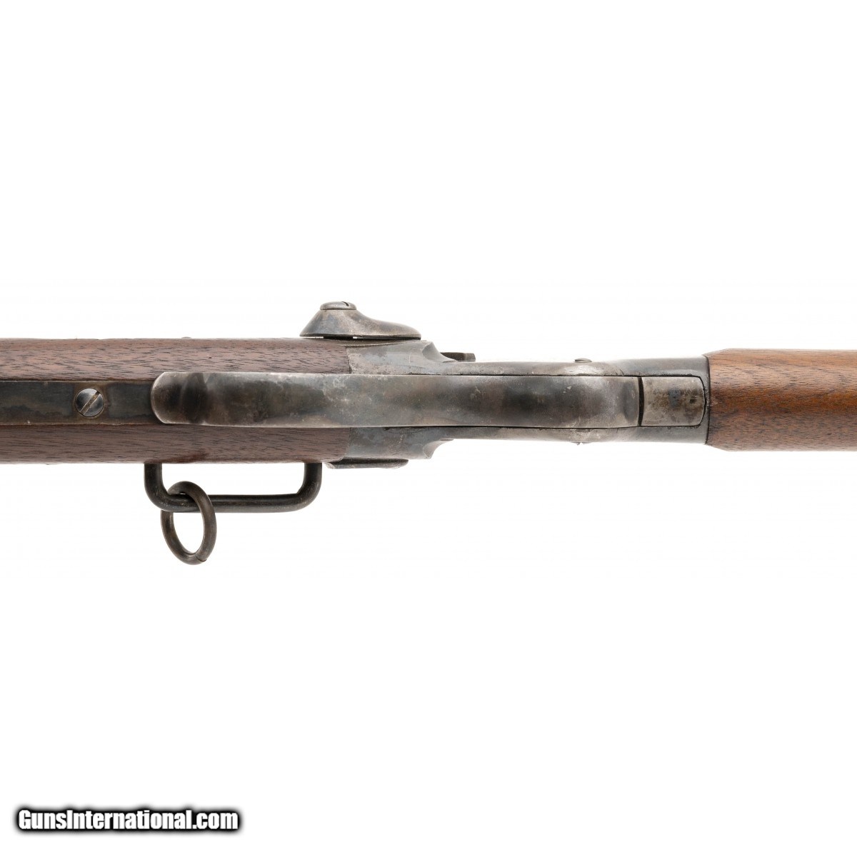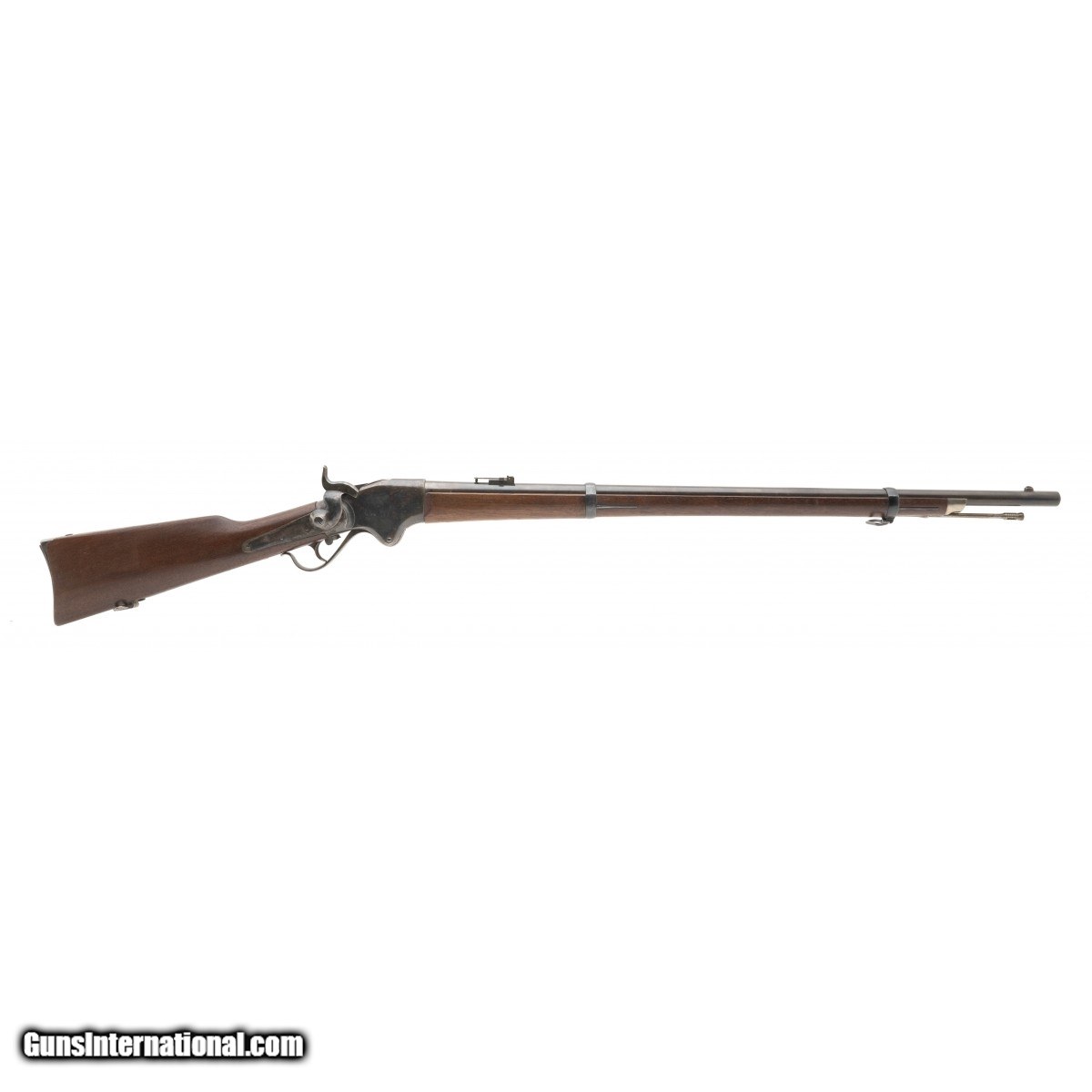 Description: "Serial number 29095. Made in the late 1860s. 50 caliber with a 32 ½" barrel. This gun as in beautiful condition. The barrel has most of the blue and frame has most of the case colors. Wood is excellent with a nice sharp ESA cartouche. There were just over 1100 guns that were converted at the Springfield Arsenal in 1871. Very fine Spencer Infantry Rifle modified by Springfield Arsenal! SOLD Antique: Yes |