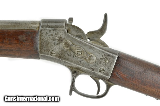 U.S. Model 1871 Springfield Armory Rolling Block .50-70 Rifle. The metal has a gray patina, smooth not rusted. The wood has marks and wear, overall very good. The bore is near excellent, bright with strong rifling. Very faint cartouche on left side of wrist. Good-very good overall condition.