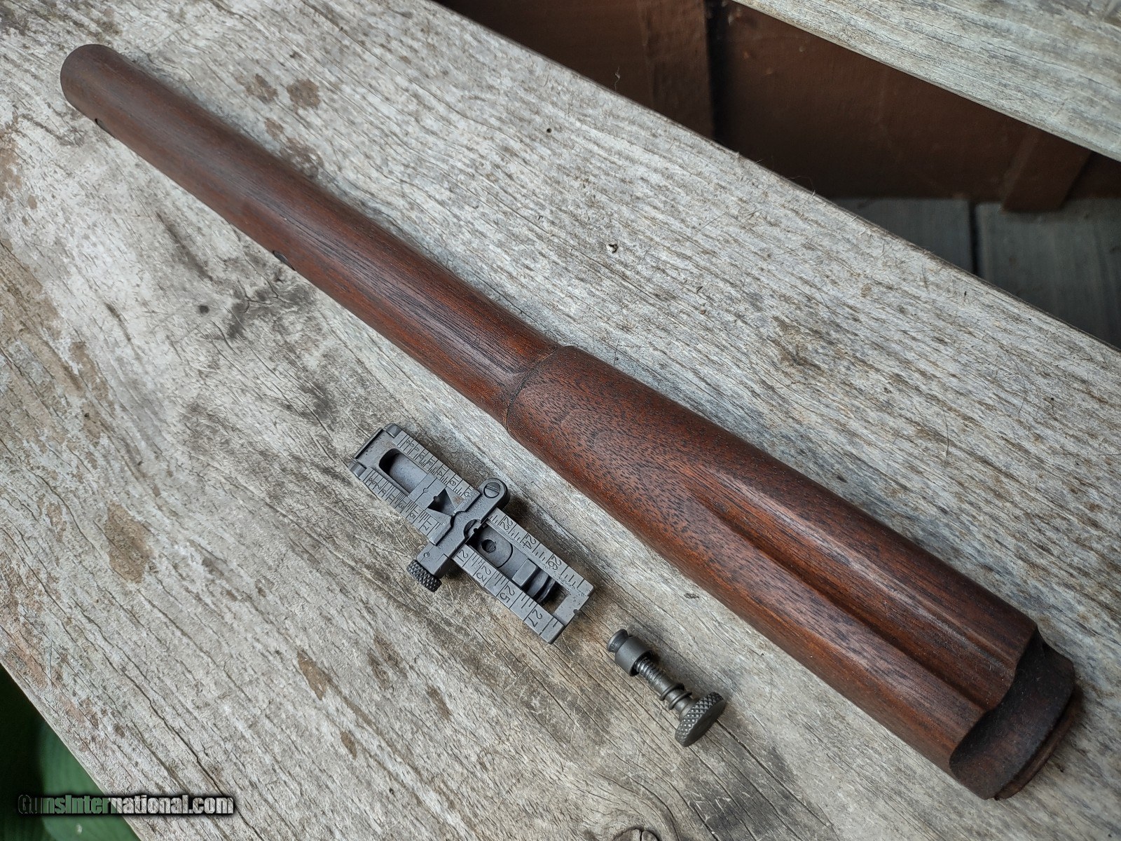 Description: 1903 Springfield rifle with a high number Rock Island receiver built by James River Armory. I bought this rifle from James River with new Criterion barrel and new “C” stock. Malcolm 6X scope with MVA Winchester type mounts with the mounting blocks set on the barrel and fixed rear sight base. This is the early U.S. Marine set-up where the receiver is not drilled and tapped. The rifle remains in excellent condition with hardly a scratch in the wood and bright shiny bore. The stock is marked with a D.A.L. cartouche. Also included is a matching handguard uncut for scope mounting blocks and the 1903 rear sight so the rifle can be switched to the iron sight configuration. Comes with James River and other documents. Additional pictures upon request. If you do not want the scope, mounts, and handguard deduct $400. Shipping to your FFL dealer $85 from a private seller. SOLD Rifle Caliber: .30-06 Springfield |