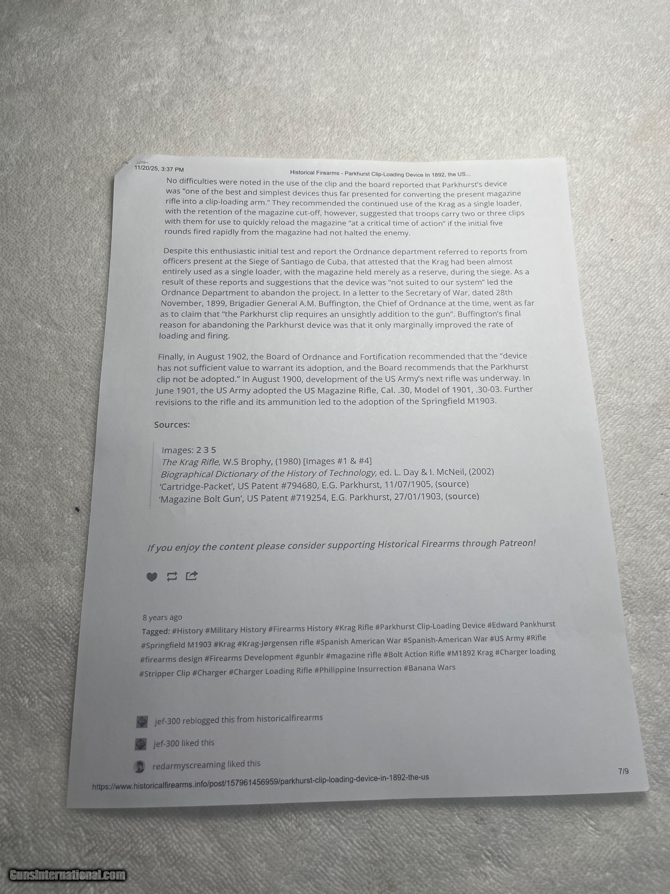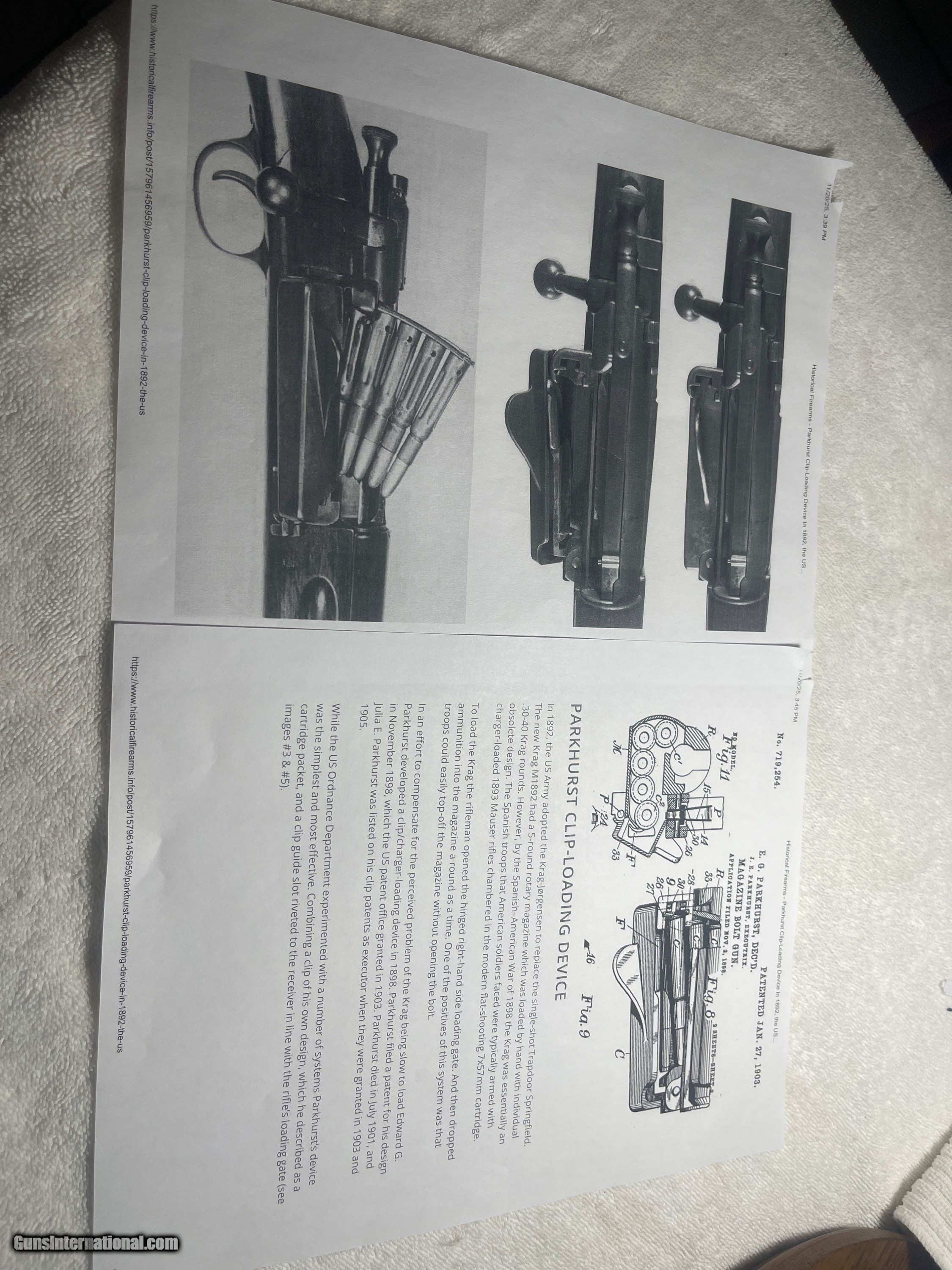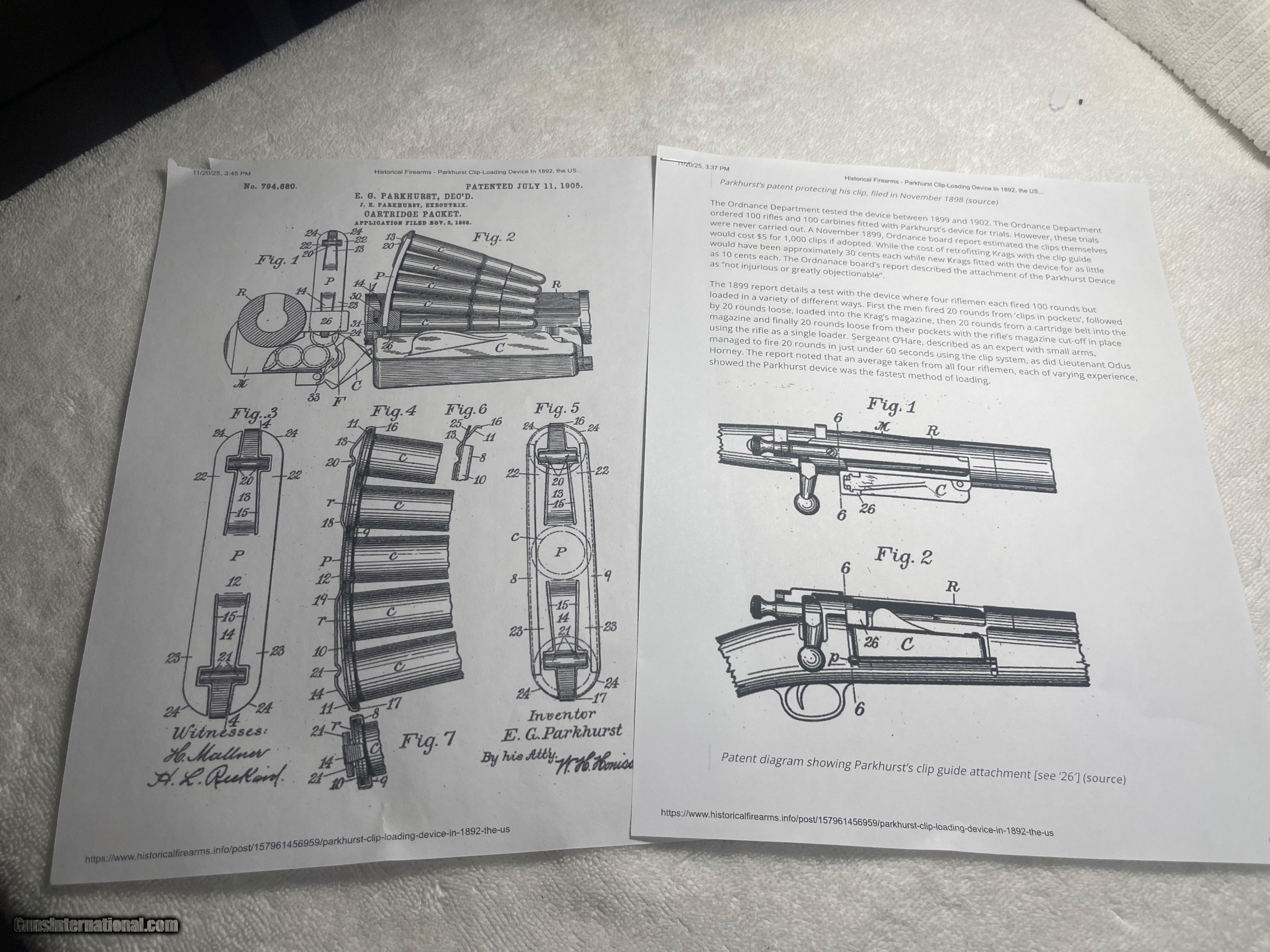 EXTREMELEY RARE U.S. MDL. 1899 SPRINGFIELD TEST KRAG JORGENSEN CARBINE ONE OF LESS THAN 100 MADE WITH CARBINE WITH PARKHURST STRIPPER CLIP PATENT.