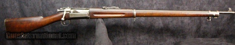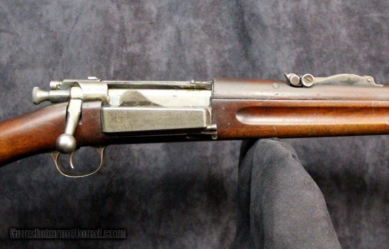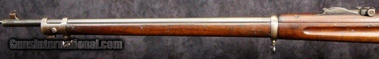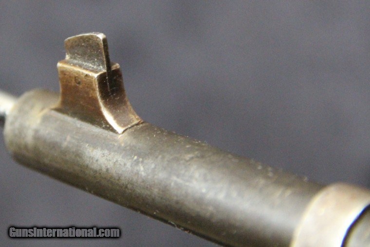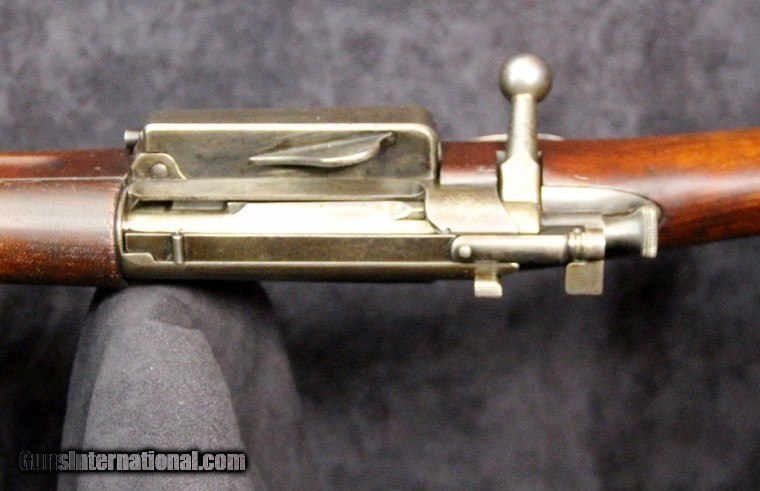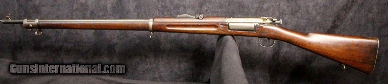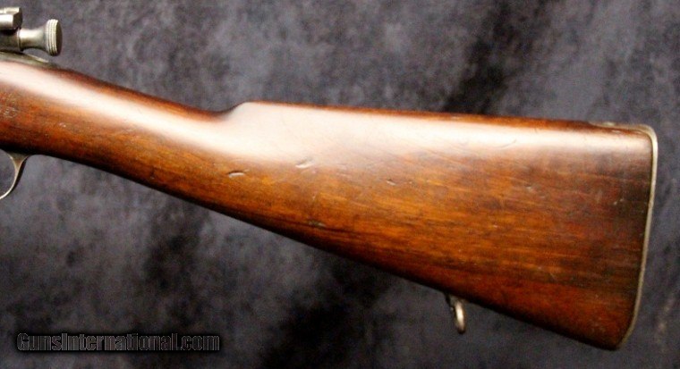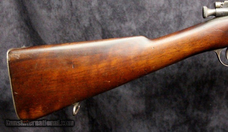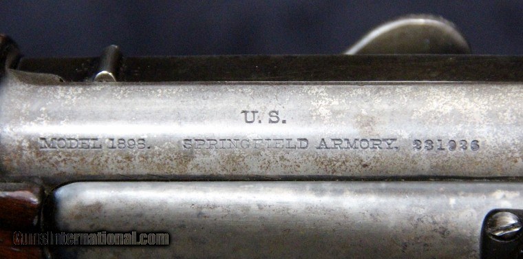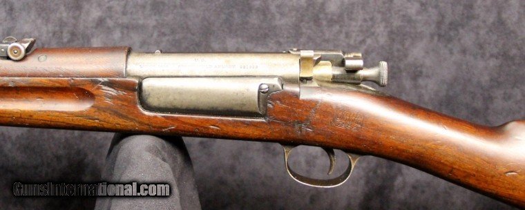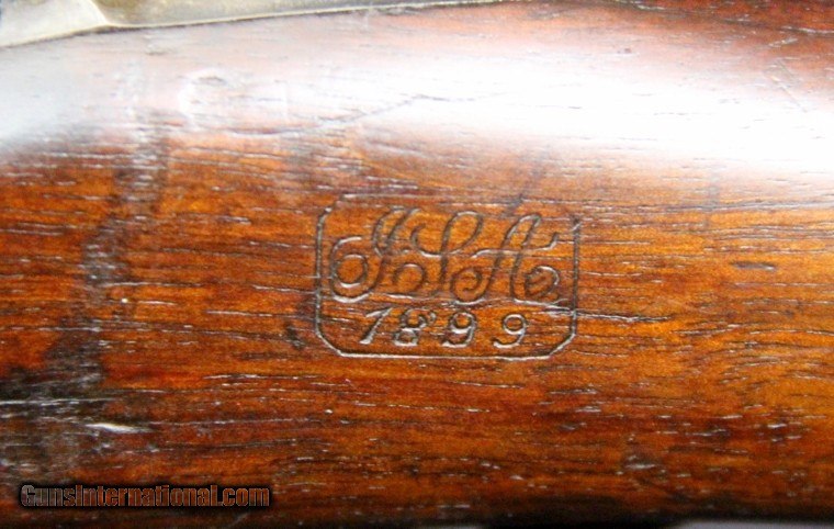 Description: .30-40, #231026, 30 1/2 inch barrel, blue finish, walnut full military stock, 1898 sight, 1899 cartouche, 1899-1900. Condition: very good bore, 95% barrel blue thinning, receiver mottled silver-plum, dogs hair cracks where receiver meets the stock behind magazine on both sides, barrel bands show 50% blue, butt plate mottled silver blue with troop and rack marks, excellent mechanically, excellent marks. SOLD Curio/Relic: Yes |
