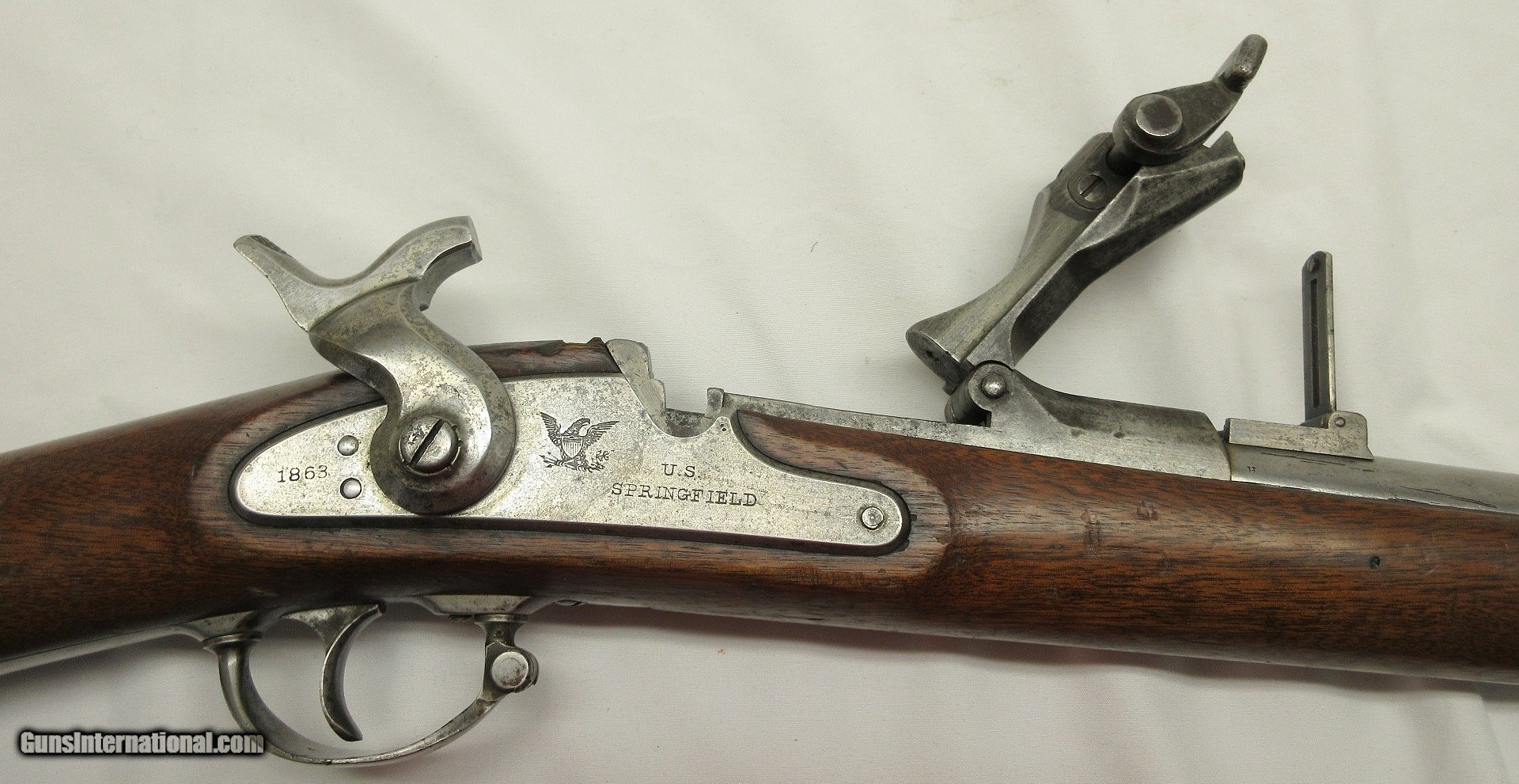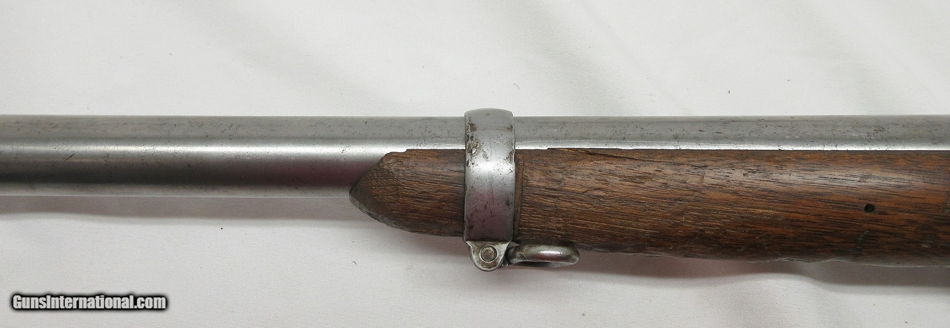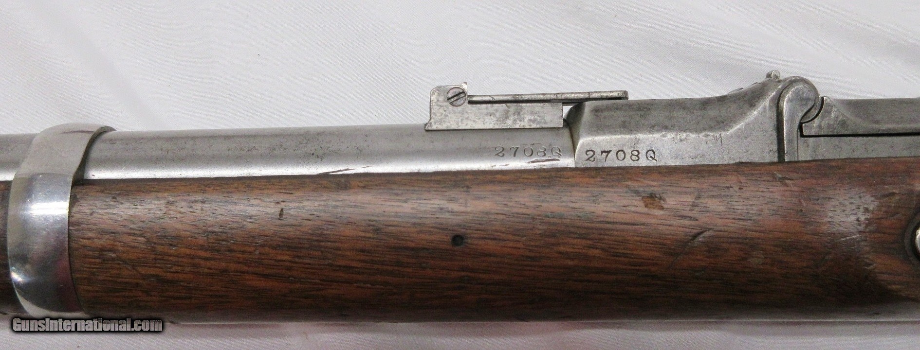 Description: STK# P-36-95 Allen Conversion – M1870 – 50-70 Trapdoor –Stk# P-36-95 This M1870 Allen Conversion .50-70 trapdoor has a 35-5/8” tapered round barrel, fixed front sight and original ladder rear sight. Bore is very dark, with only faint rifling, remaining and deep pitting throughout. The P grade walnut stock has some scattered usage marks and faint inspector’s proof mark can be seen. Metal components have developed mottled gray patina, consisting of standard iron mounts including barrel bands with stacking swivel. The breech block is stamped with the standard “U.S. Model 1870" over crossed arrows, an eagle head and “US” markings. The lock plate bears the spread eagle, "U.S. SPRINGFIELD 1863". Standard factory wood to metal fit. The metal ramrod is missing. Length of pull is 14-1/2”, Overall 52”, weight: 8.02 lbs. Condition: Fair. Manufactured by Springfield Armory. Note: There are carvings in the left side of the stock adjacent to the trapdoor, and on the left side of the stock. SOLD: AS-IS Our stock number is P-36-95. Will ship to anywhere in the United States. Buyer pays freight and insurance. SOLD Antique: Yes Manufacturer: Springfield Armory Model: M1870 Condition: Fair Bore Condition: Dark with faint rifling and deep pitting throughout Barrels: One Barrel Type: Tapered Round Triggers: 1 Weight: 8.2 lbs Sights: fixed front/ Original ladder rear Manufacture Date: 1870 Item Location: OR - Oregon |