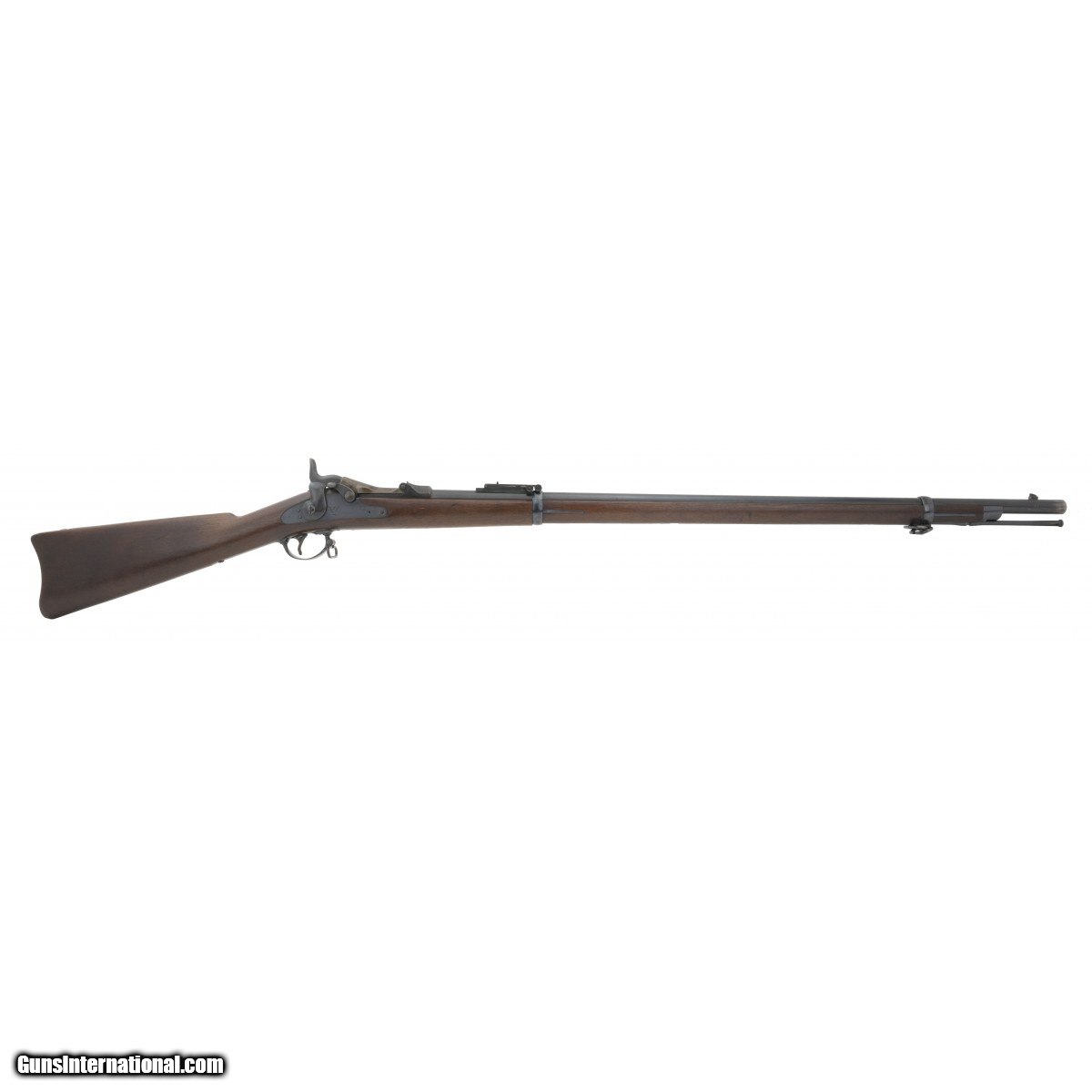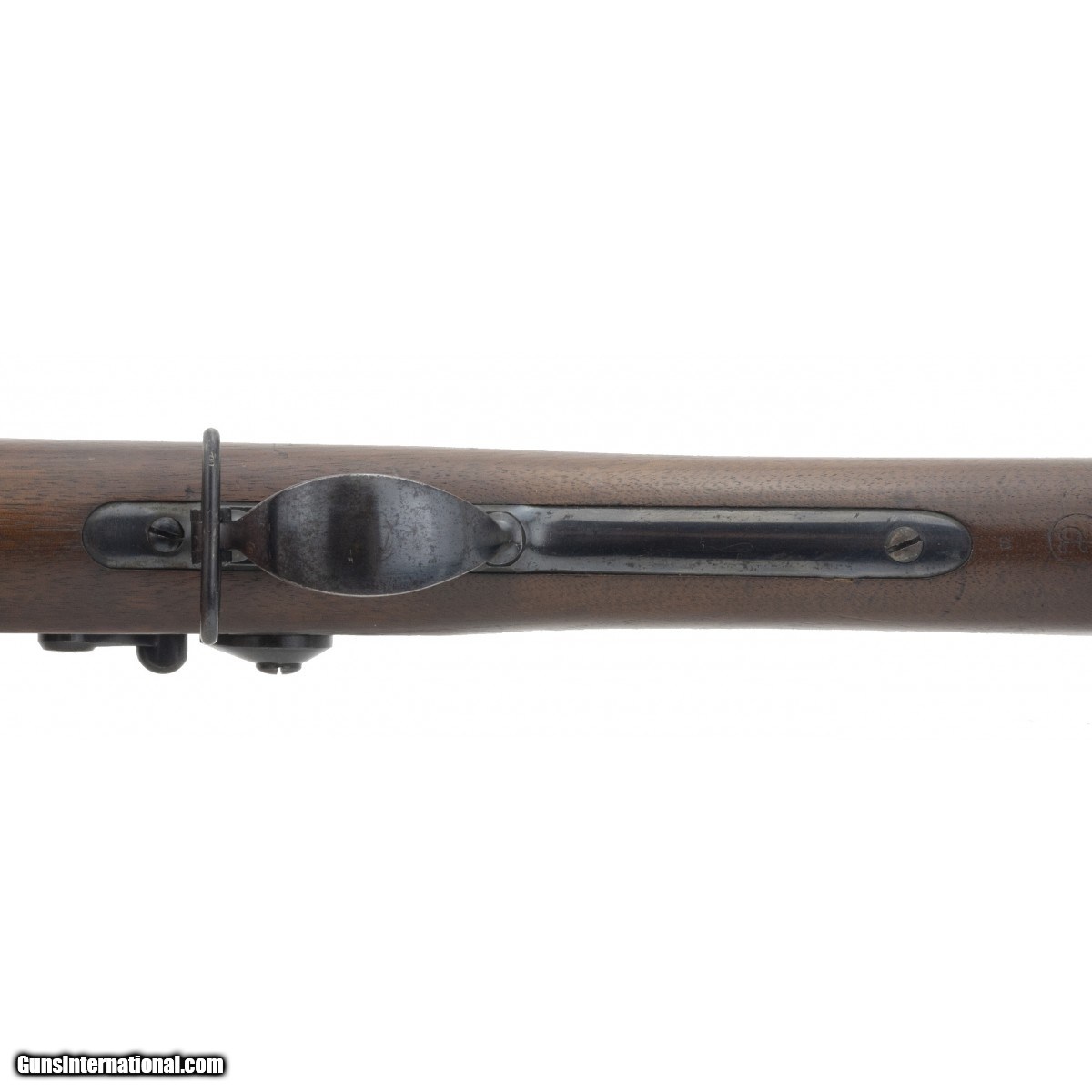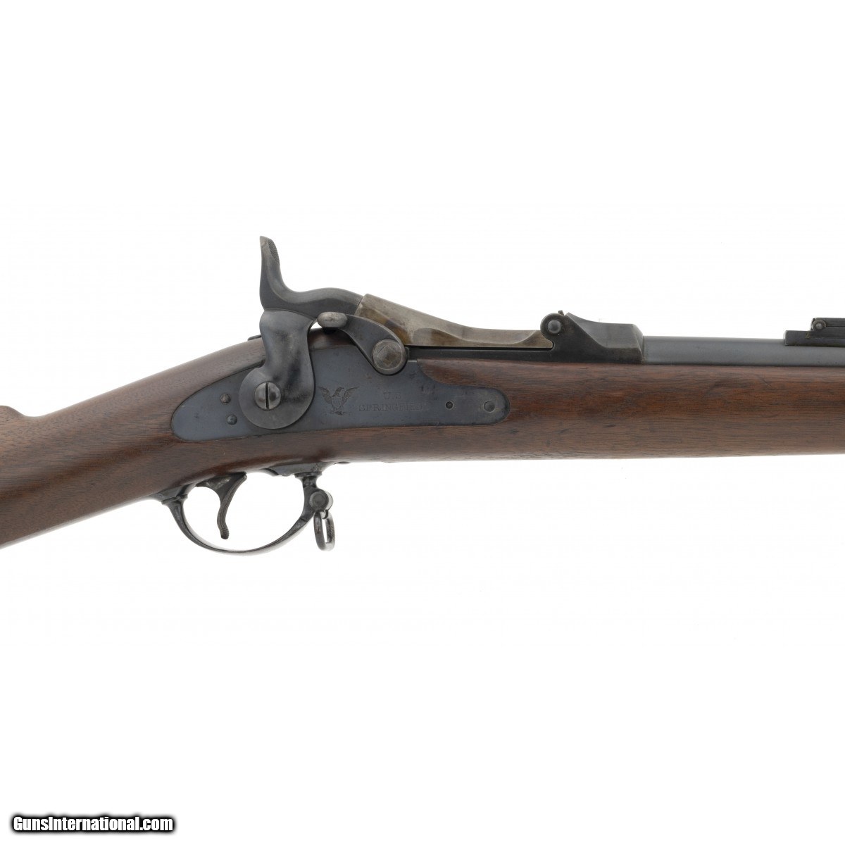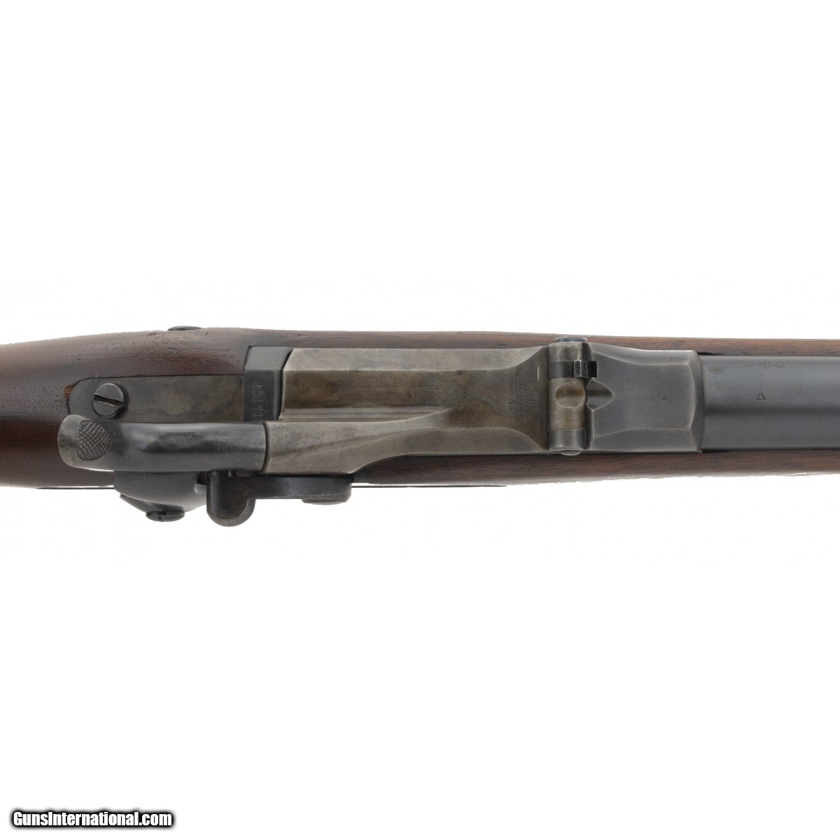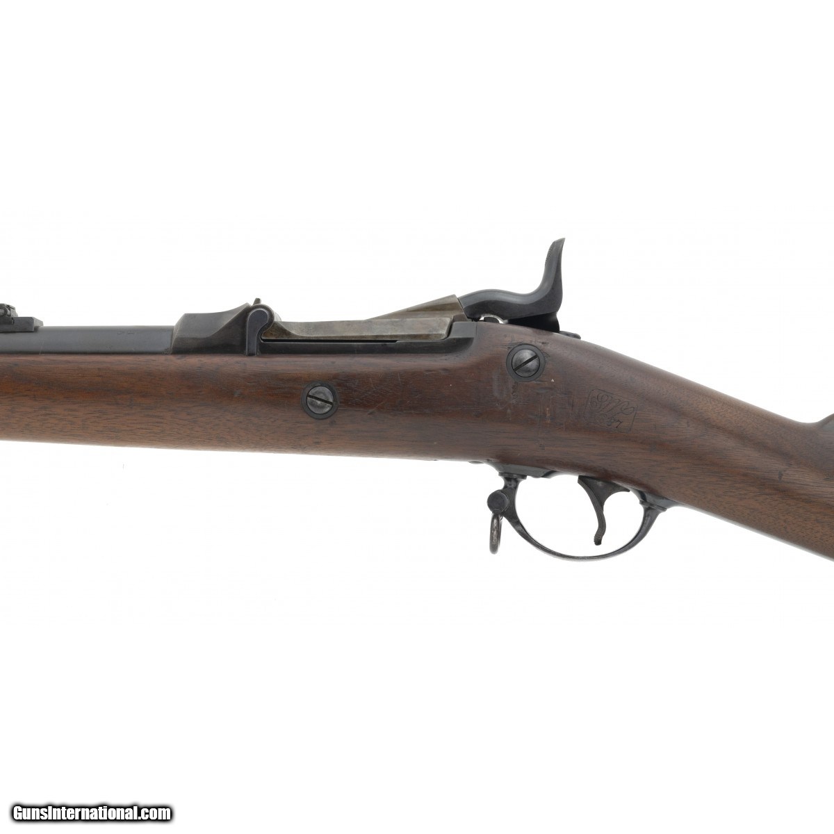 Description: " This U.S. Model 1884 trapdoor 45 Government centerfire caliber (45-70) is ready for your collection. The 32 5/8"" round barrel has an excellent bore with bright, strong rifling. All metal has approx. 98% blue. The breechblock and tang have good case colors. The stock is very fine with no cracks or chips, a strong SWP/1887 cartouche and firing proof, and a few scattered storage dents and dings. The action functions correctly. This excellent Model 1884 is fit for the finest collection! SOLD Antique: Yes |