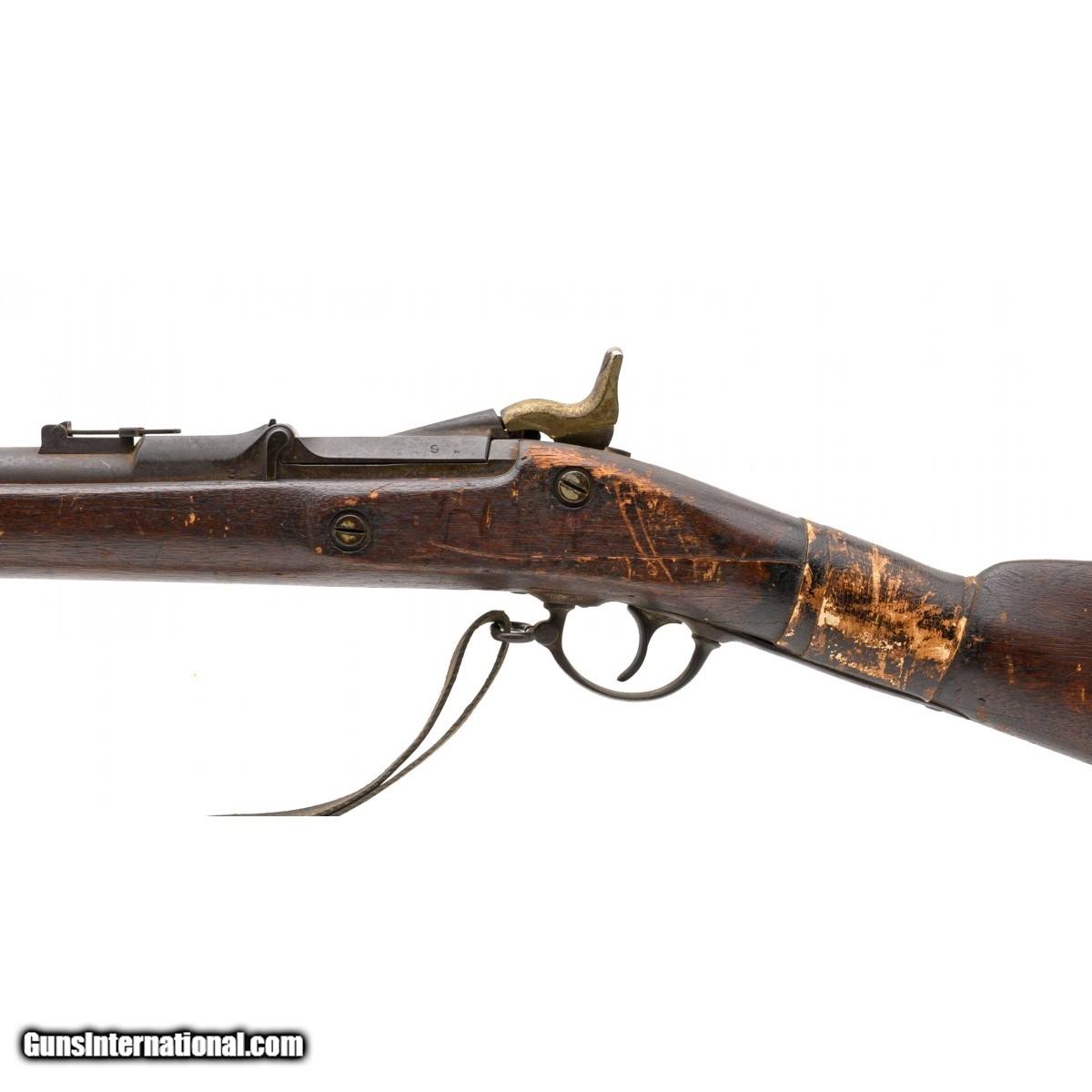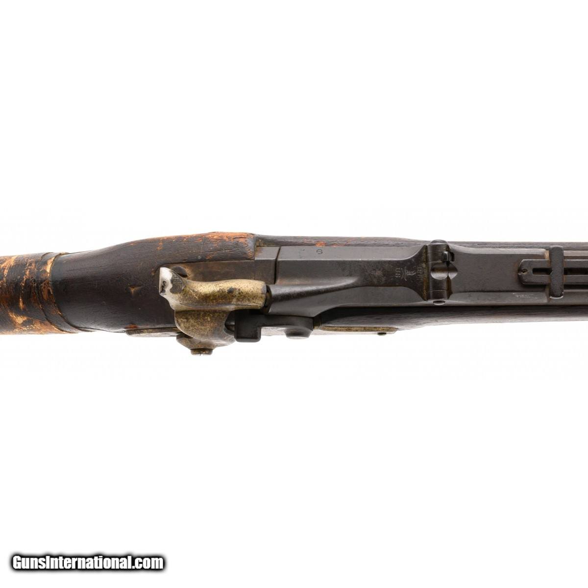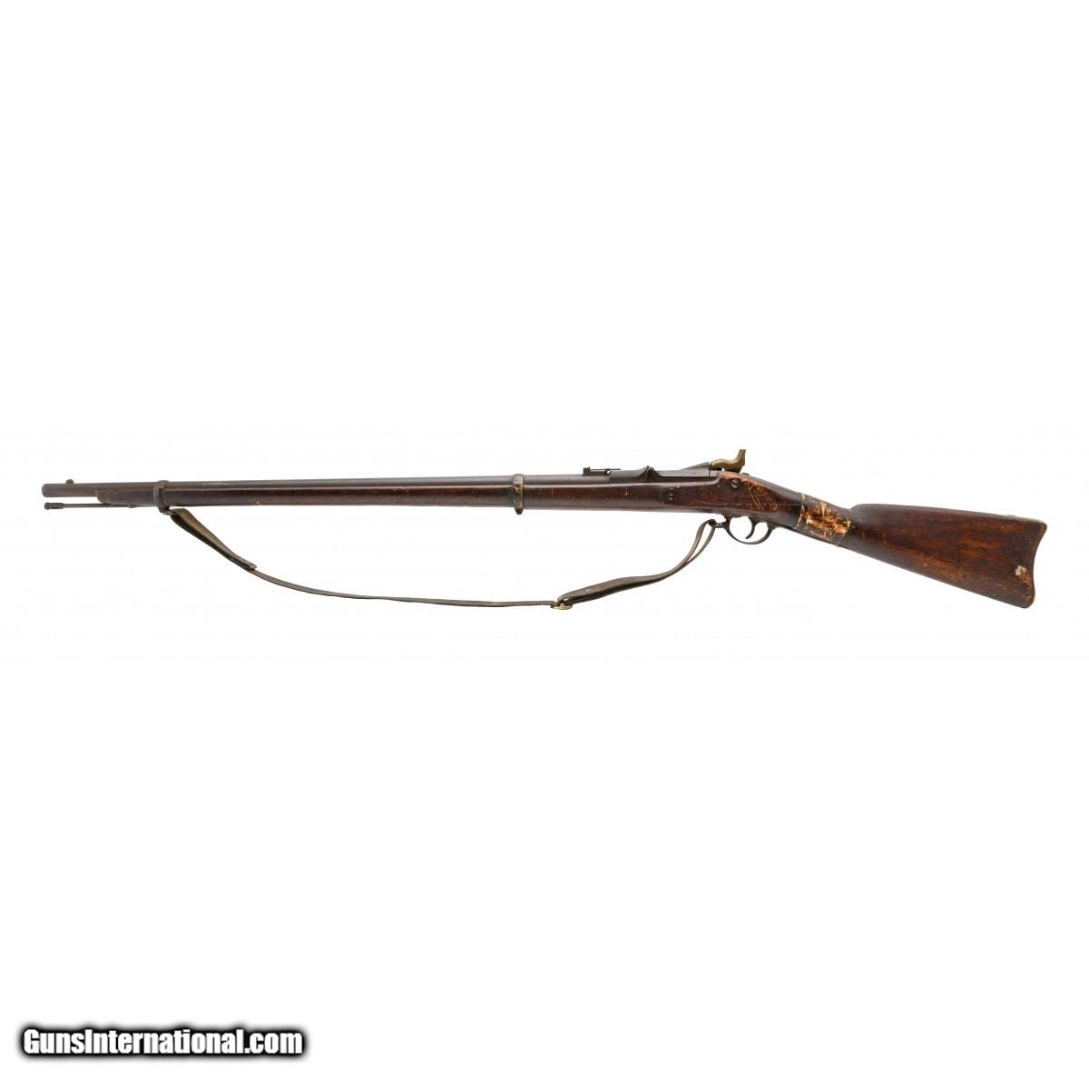 Description: " SN: 31261. Made circa early 1870's. 50-70 Govt. with a 32.5"" barrel. Bore is dull with moderate rifling. U.S. breech loading rifle. Rifle has a dark brown patina noted throughout. U.S. markings are noted on the breech block and top of butt plate. Stock shows handling wear throughout with chips, scratches and dings noted. A crack is noted on both sides of the wrist with leather wrapped around the wrist. Rifle comes with sling. Overall fair condition. (Consignment) SOLD Antique: Yes |