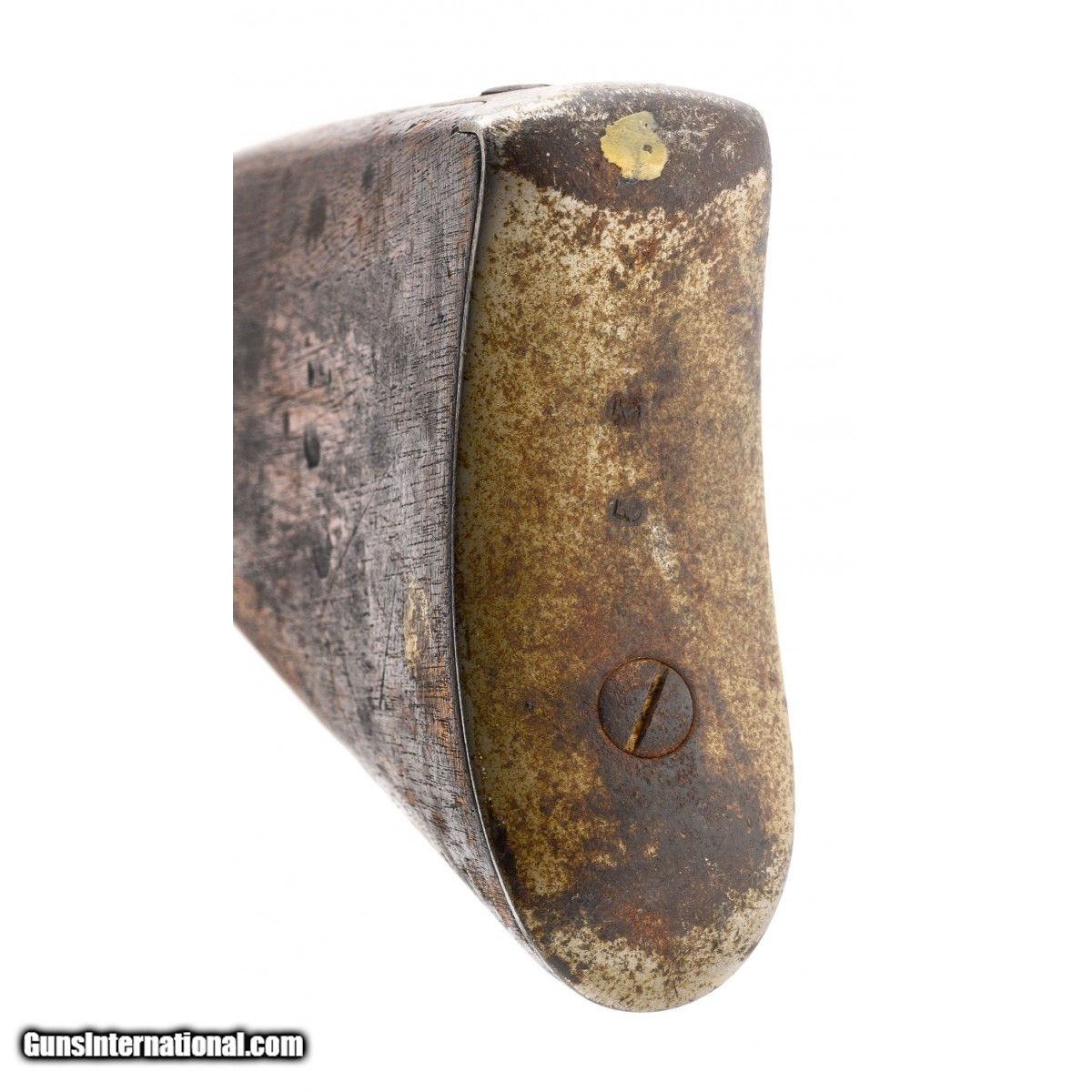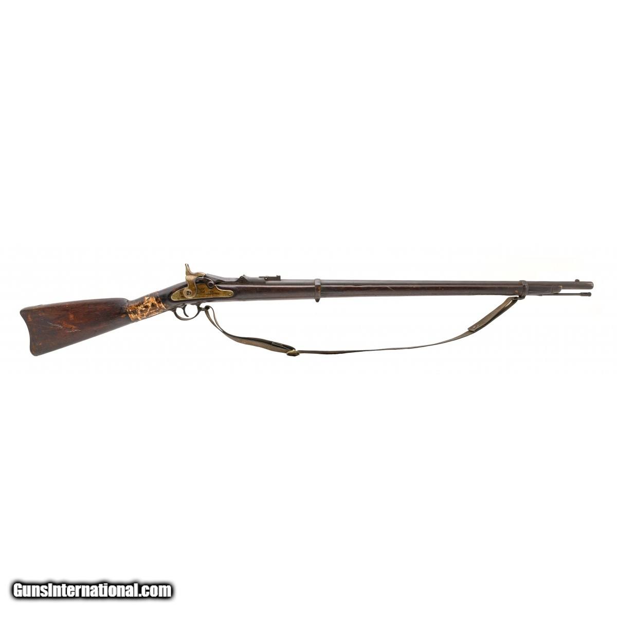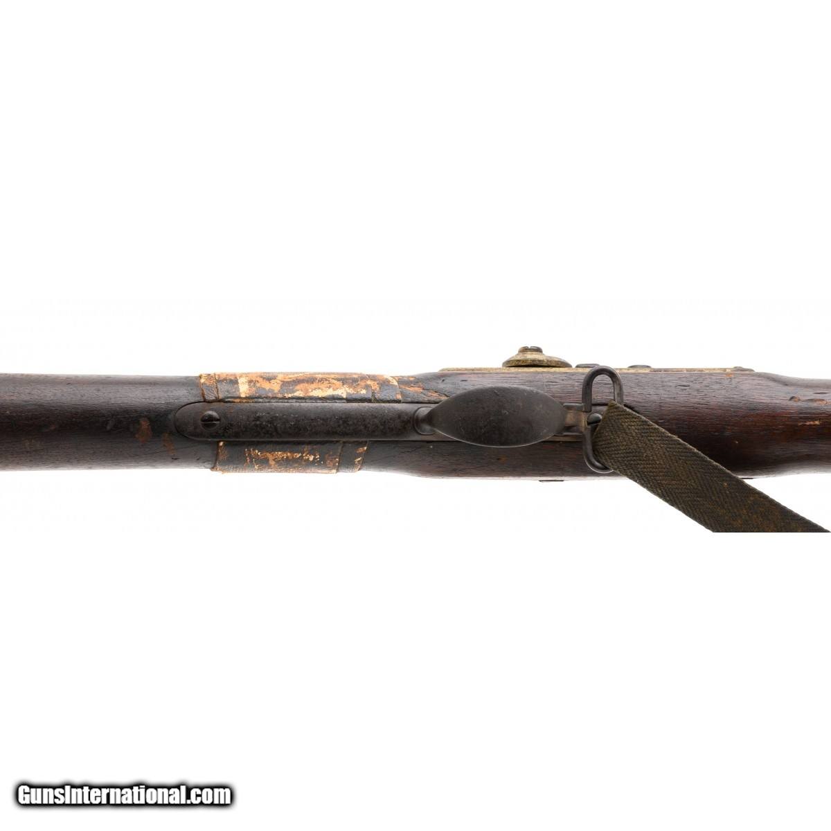 Description: " SN: 31261. Made circa early 1870's. 50-70 Govt. with a 32.5"" barrel. Bore is dull with moderate rifling. U.S. breech loading rifle. Rifle has a dark brown patina noted throughout. U.S. markings are noted on the breech block and top of butt plate. Stock shows handling wear throughout with chips, scratches and dings noted. A crack is noted on both sides of the wrist with leather wrapped around the wrist. Rifle comes with sling. Overall fair condition. (Consignment) SOLD Antique: Yes |