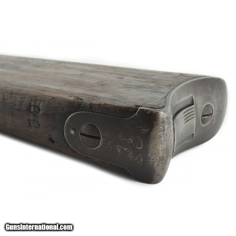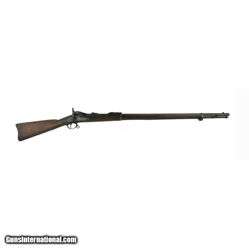 Description: " Rare Springfield Model 1880 .45-70 Trapdoor Rifle with Experimental Triangular Bayonet. Rare gun with only 1001 of these made. This gun has a rare triangular captive ramrod bayonet. The military eventually went with a very similar system for the Model 1888. Gun is with a round bayonet. This gun has a dark brownish gray patina on the metal. The wood shows wear and a repaired split on the last two inches of the stock forward of the barrel band. SOLD |