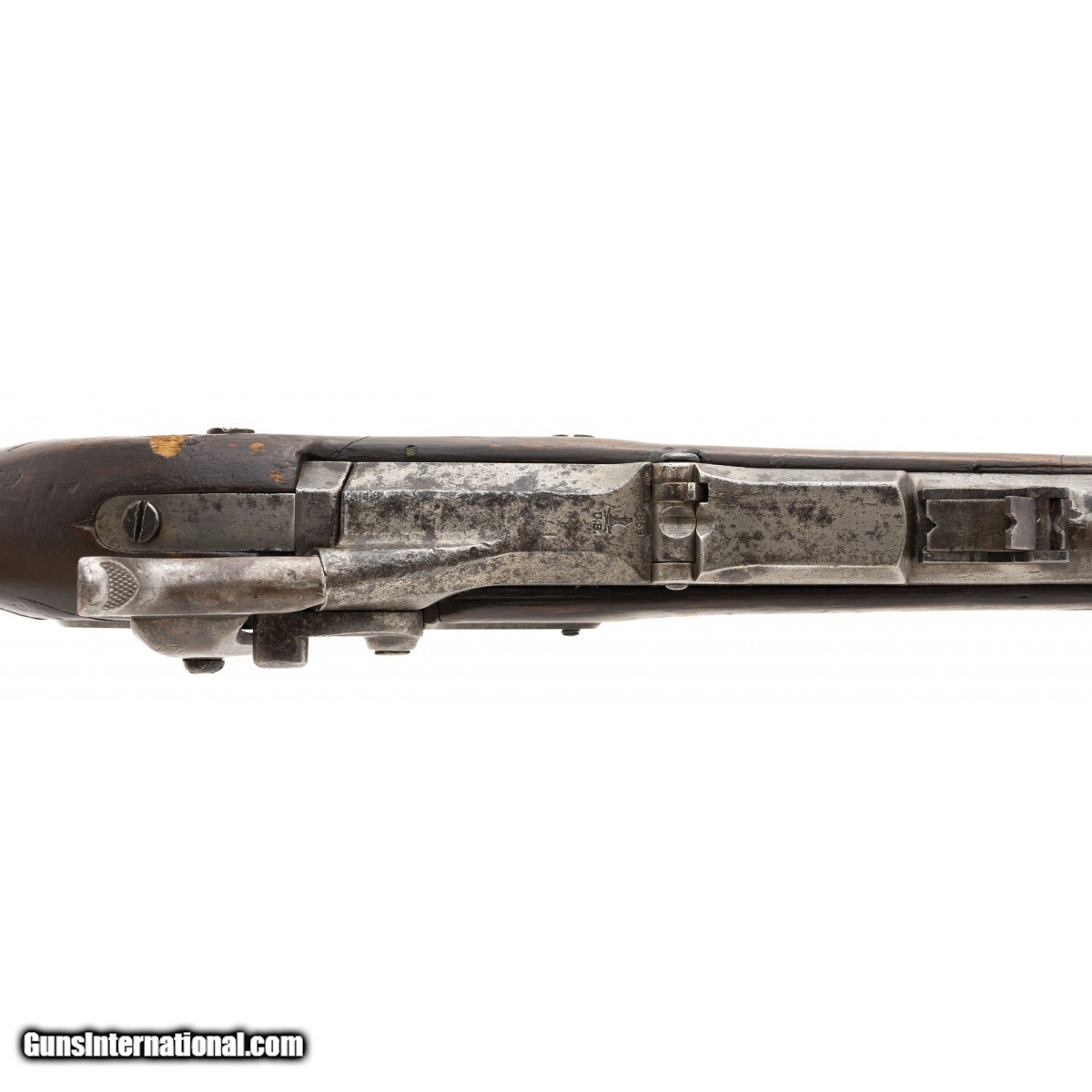 Single shot US military rifle. Breechblock is marked 1869. Stock has multible repaired cracks around the wrist. Action works. Bore has shallow rifling with pitting. Reasonably priced.