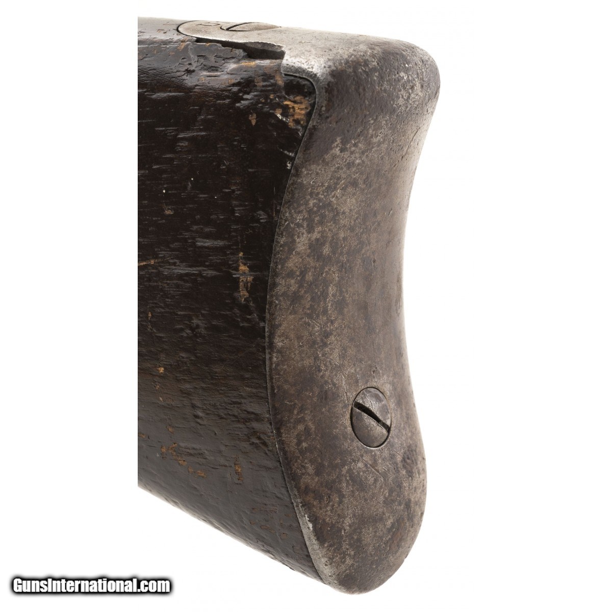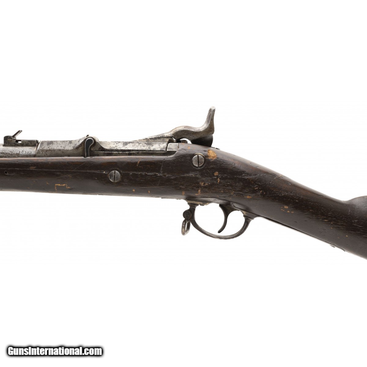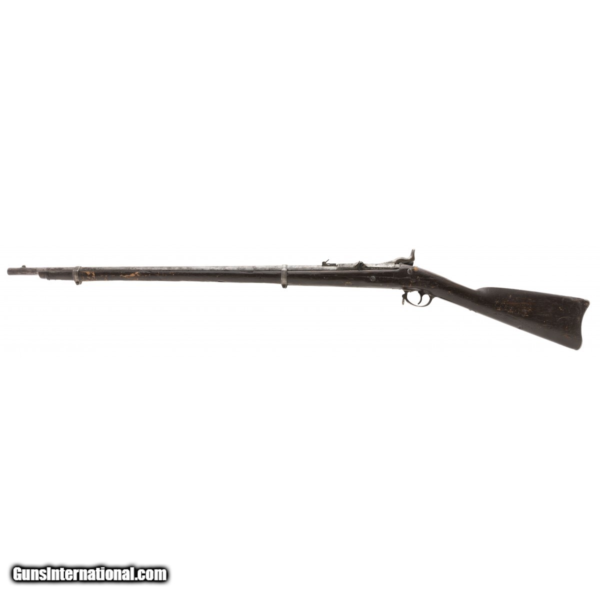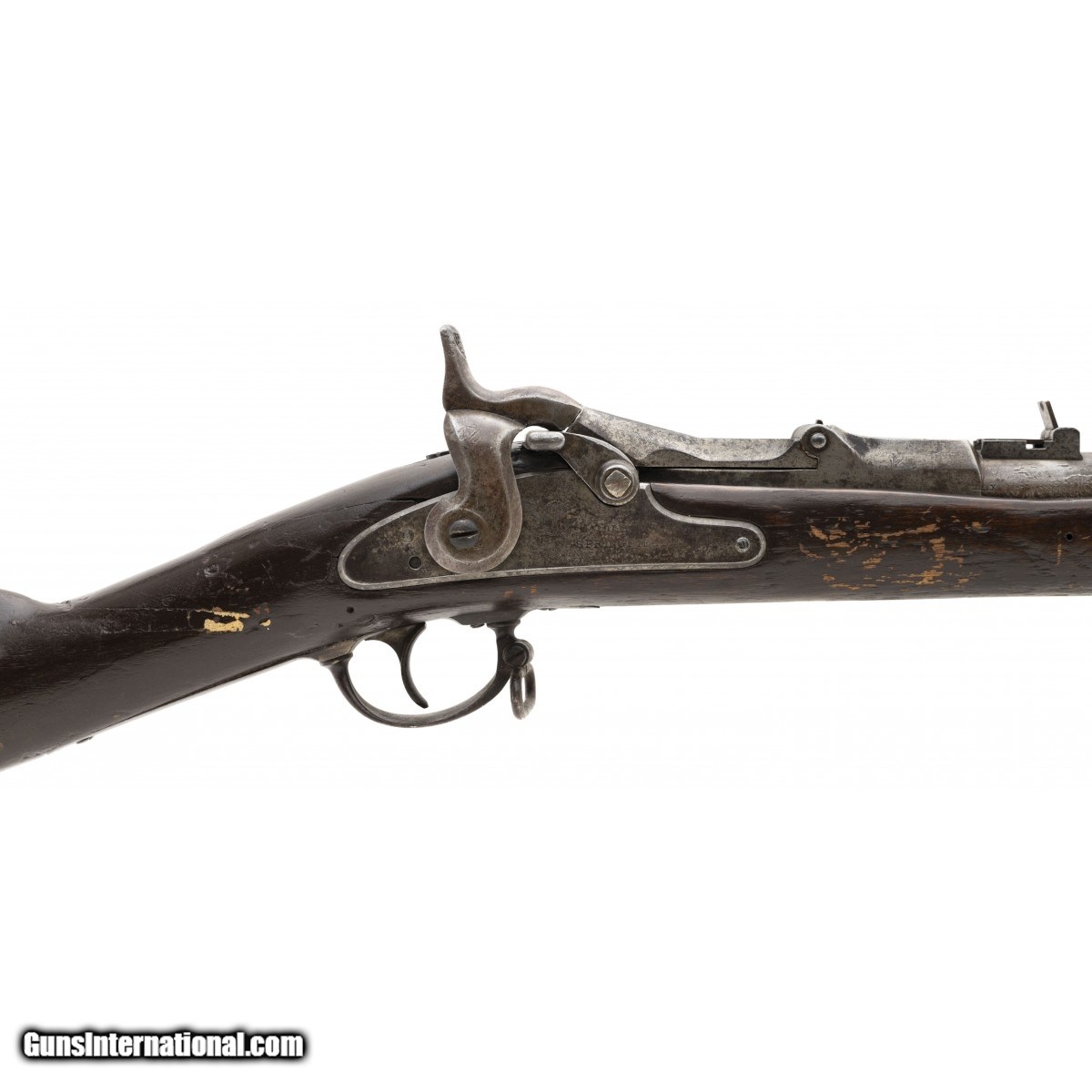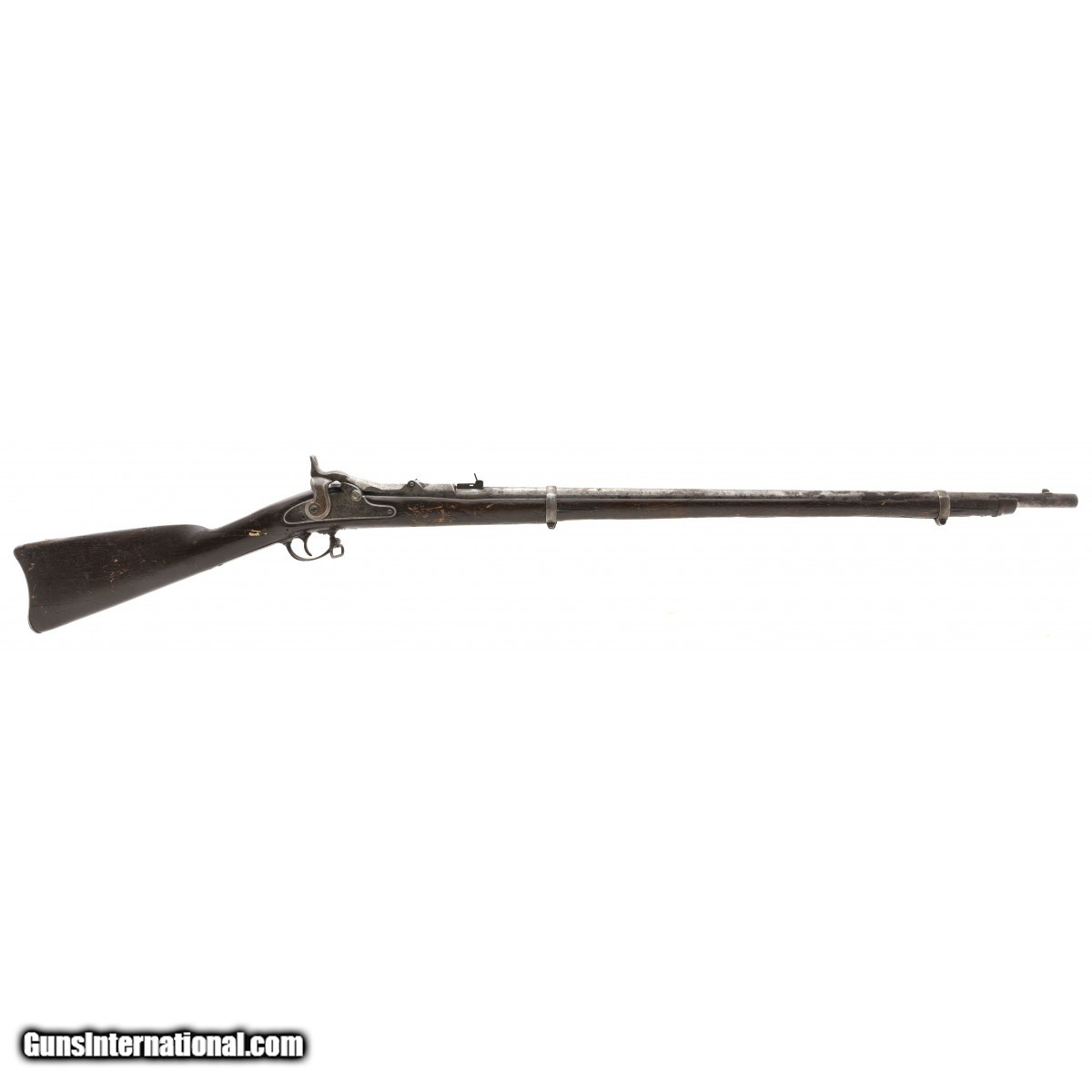 Description: " Single shot US military rifle. Breechblock is marked 1869. Stock has multible repaired cracks around the wrist. Action works. Bore has shallow rifling with pitting. Reasonably priced. SOLD Antique: Yes |