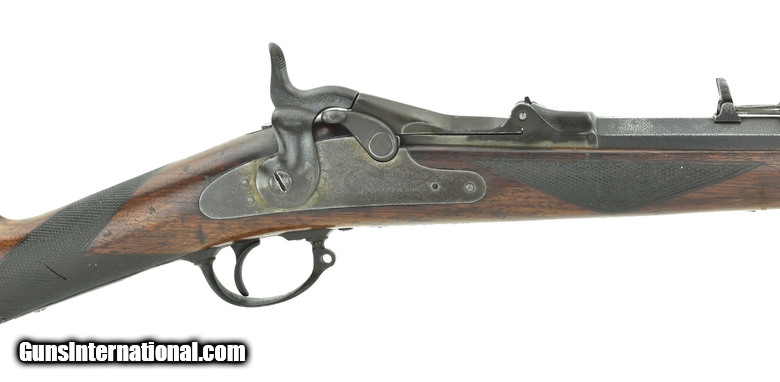 Description: "Springfield Trapdoor Sporting .45-70 caliber rifle. Sporting rifle. Barrel length is 30" and overall length is 49". The action is from a military Springfield, serial # 2480. Bore is good to very good showing wear. Many conversions for Buffalo Hunters were made on these actions with the stocks in this configuration. Rear sight is a Rocky Mountain buckhorn with adjustable ladder. Front sight is German silver ramp. Stock is good plus. Buttplate is “U.S." marked. The stock at the buttplate has dark stains. Very colorful 1870-1880 Hunters rifle priced reasonably. SOLD Antique: Yes |