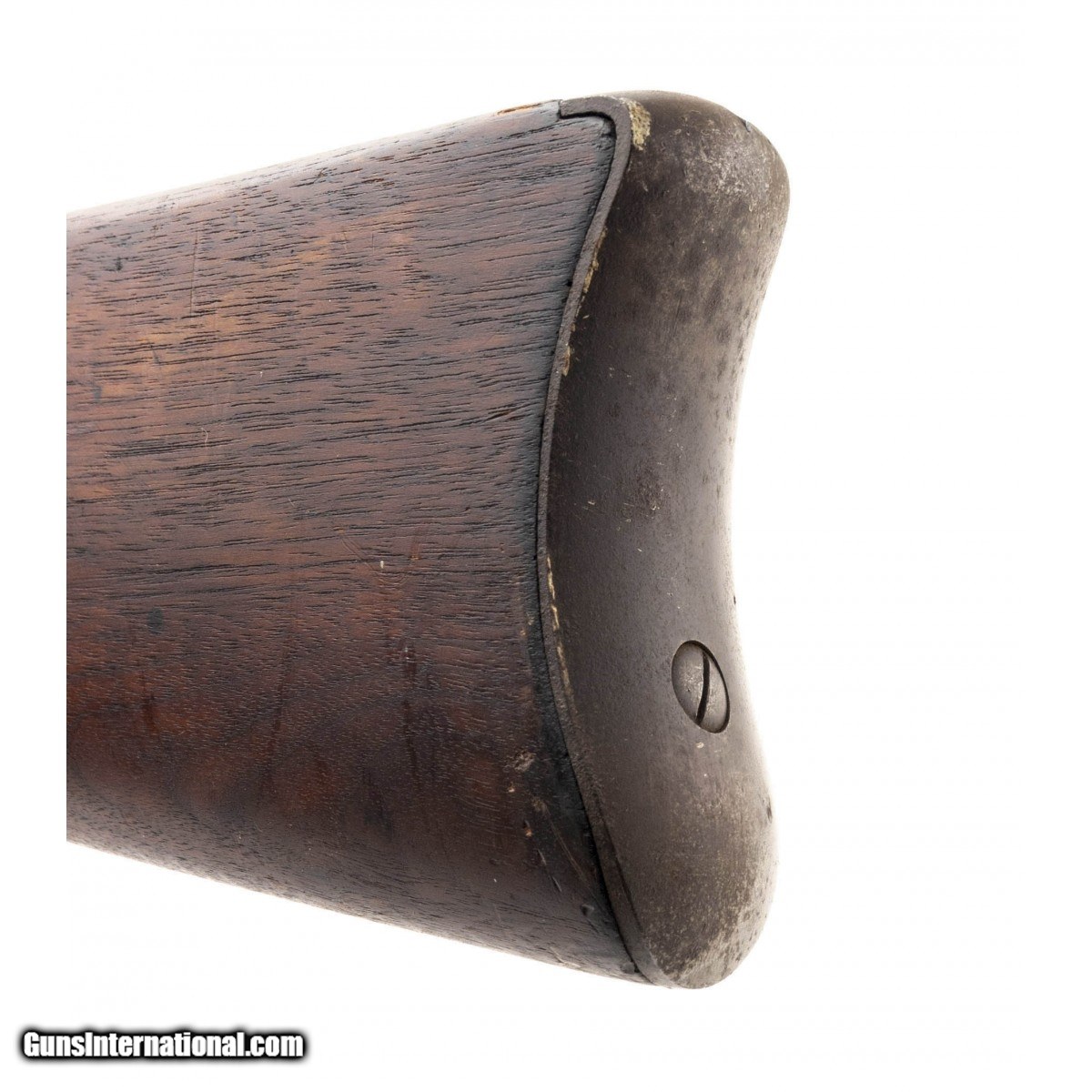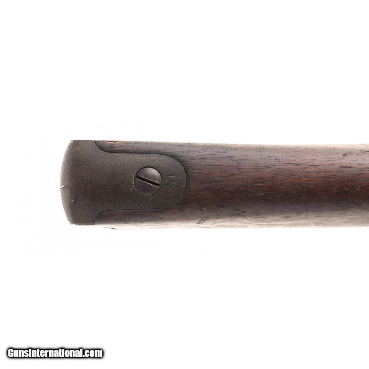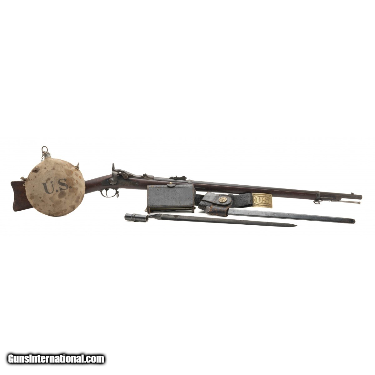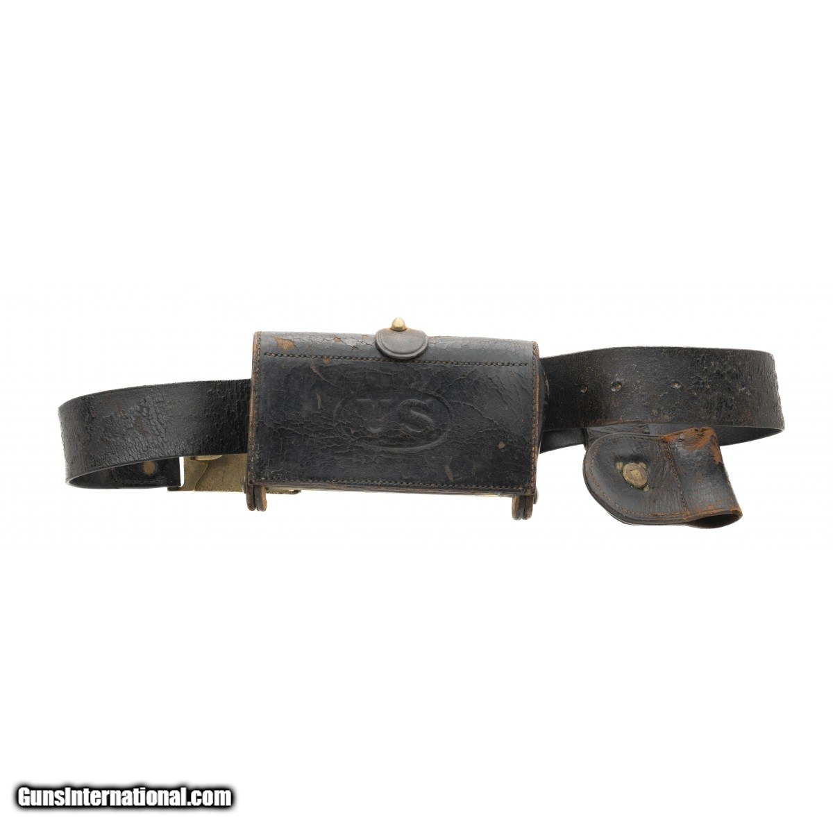 Description: " This historical set up comes with the inessentials an Infantry soldier would have carried during his time at the fort. Kit comes with an U.S. Pattern Model 1878 canteen with sling. Outside cover does so staining but the ""U.S."" is still visible. The original cork is also present. Sling is in over good condition with flaking noted on the surface. 4TH Model Mckeever Cartridge box in overall good condition. Box is chambered for 45-70 and was manufactured at the Watervliet Arsenal. Leather is still supple with some flaking noted. Indian Wars period US belt buckle. Original leather is very good with some crazing. Belt buckle has an aged mellow patina and looks great, also attached is a standard issued bayonet and scabbard in overall very good condition with some flaking noted on the leather. Now for the best part! This 45 Government (45-70) trapdoor Model 1879 rifle was made in 1882. The 32 5/8"" barrel has an excellent bore. It has the standard V over P over eagle inspection and proof marks. The correct buckhorn rear sight is marked R for rifle. It still retains its original headless attaching screws. The breechblock is correctly marked U.S. over MODEL over 1873. The lock plate is marked US over SPRINGFIELD with an eagle forward of the hammer. All the metal has a smooth blue-brown patina with the breechblock having visible case colors. The stacking and sling swivels and ramrod are present. The stock is good with a visible firing proof and strong SWP over 1882 final inspection stamp on the left wrist. It has the nicks, cents, and scrapes expected of an issued Indian Wars gun. The action functions correctly. Original condition trapdoor rifles of this period are surprisingly hard to find. SOLD Antique: Yes |