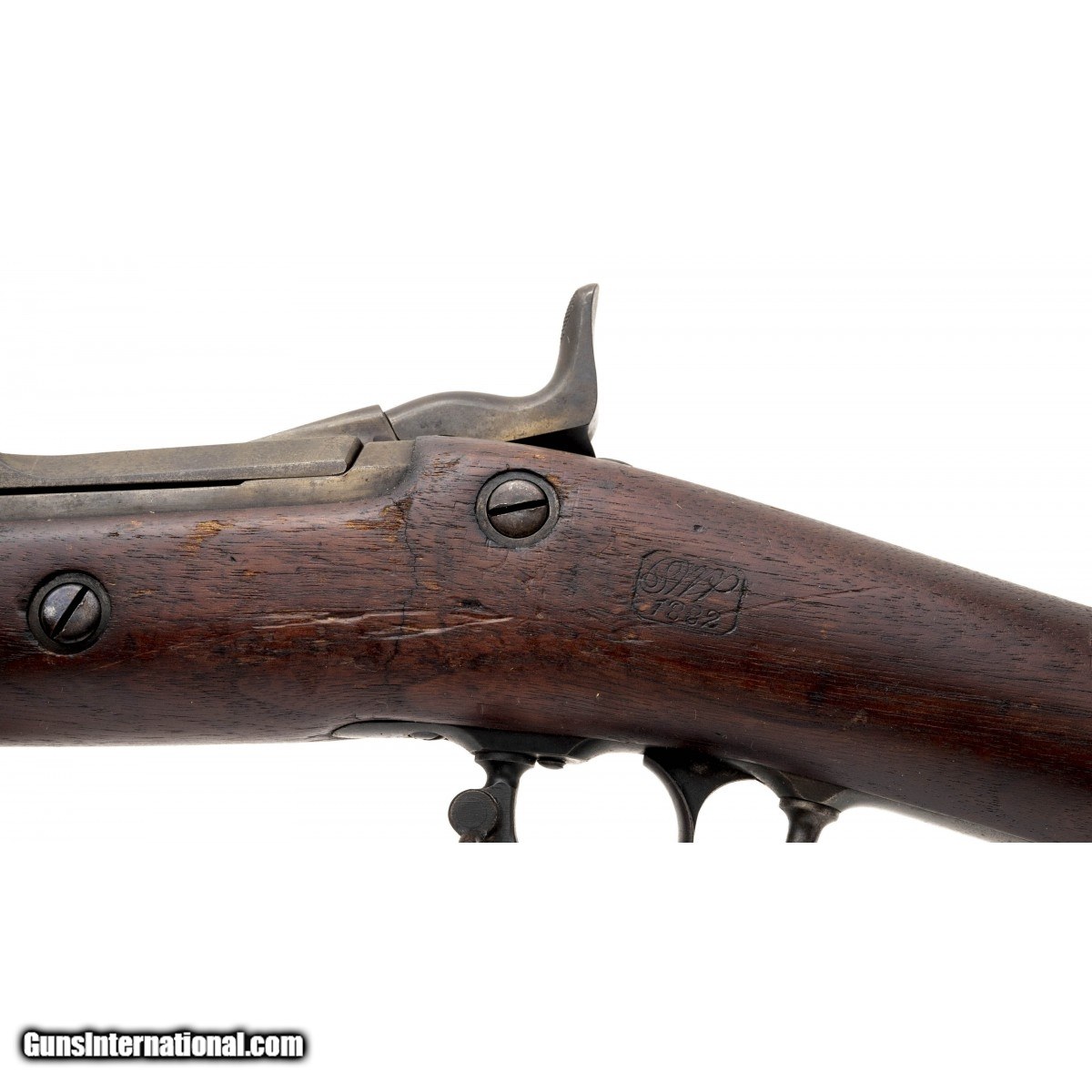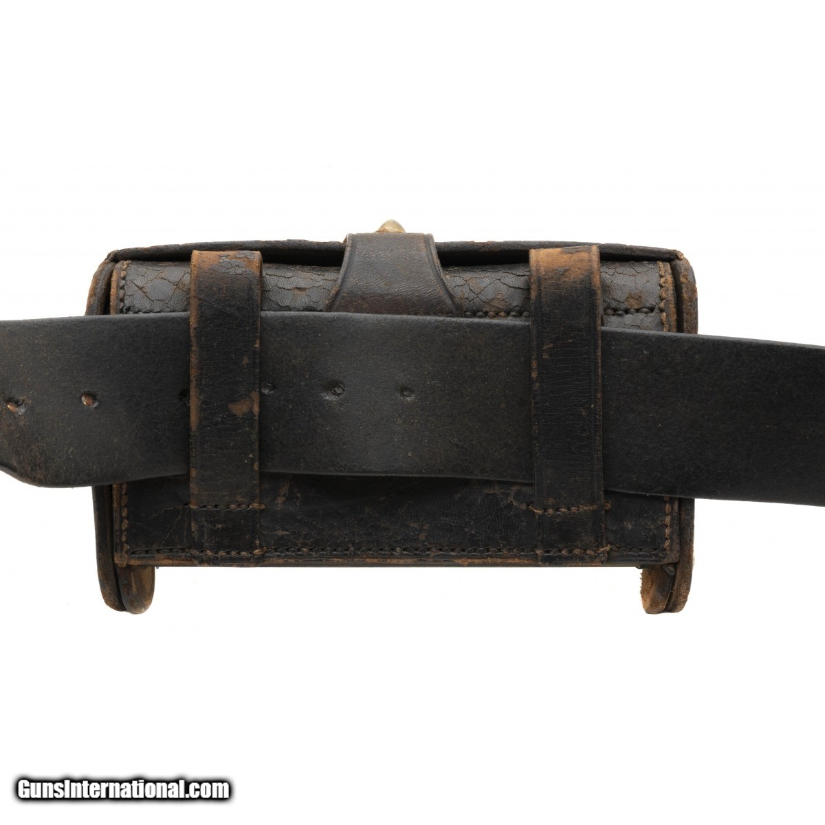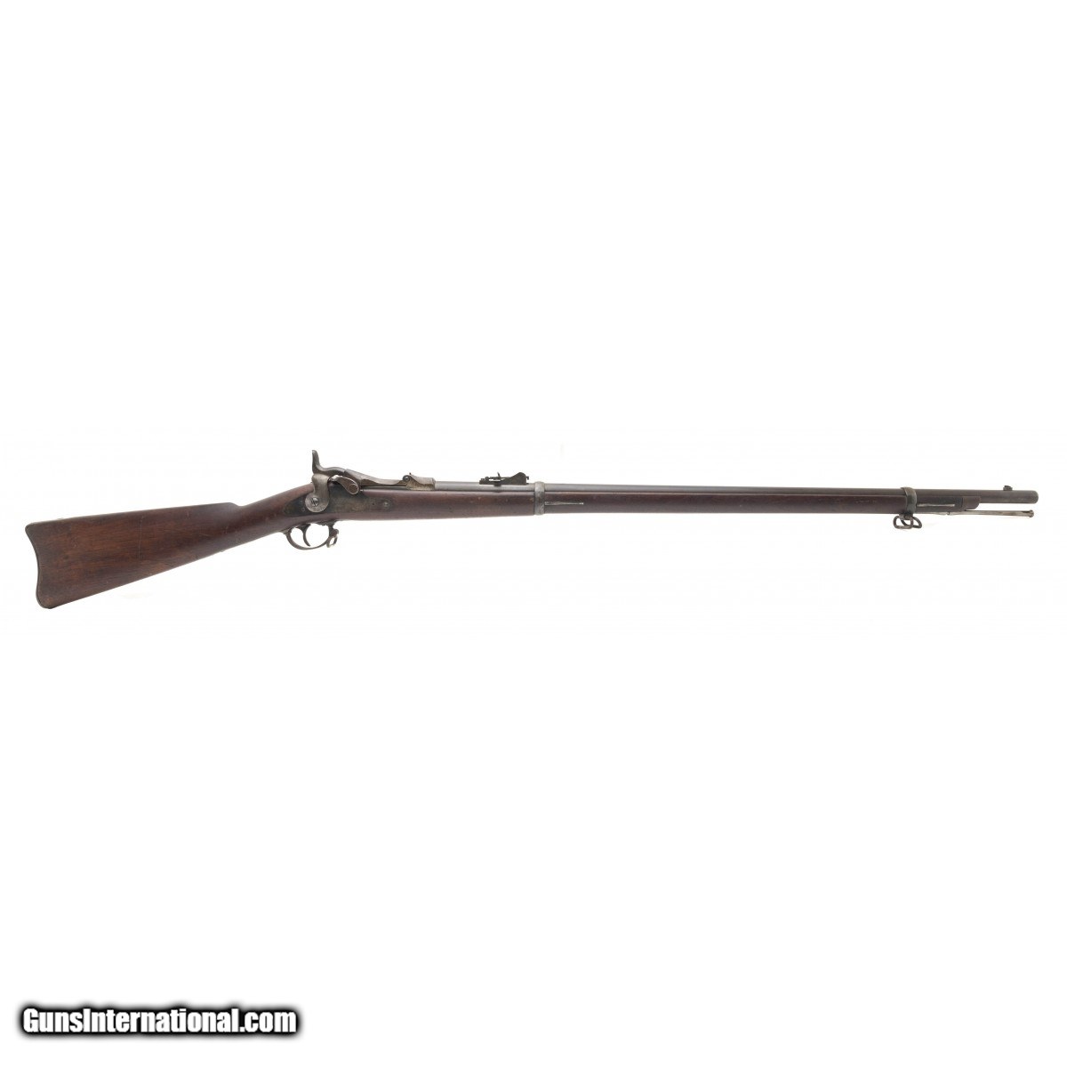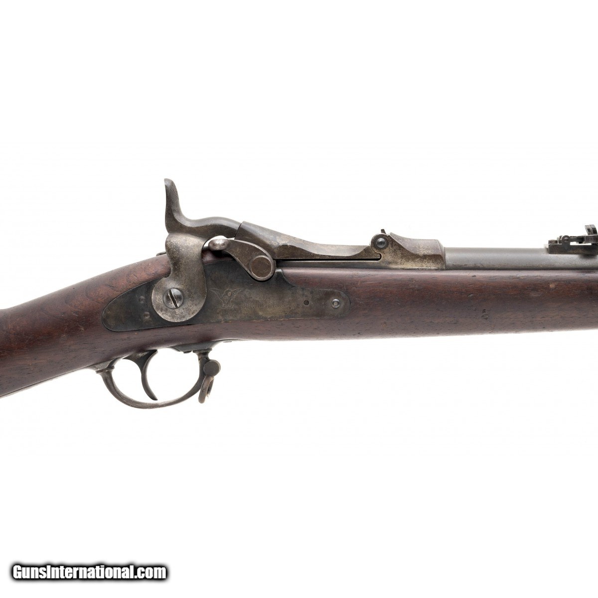 Description: " This historical set up comes with the inessentials an Infantry soldier would have carried during his time at the fort. Kit comes with an U.S. Pattern Model 1878 canteen with sling. Outside cover does so staining but the ""U.S."" is still visible. The original cork is also present. Sling is in over good condition with flaking noted on the surface. 4TH Model Mckeever Cartridge box in overall good condition. Box is chambered for 45-70 and was manufactured at the Watervliet Arsenal. Leather is still supple with some flaking noted. Indian Wars period US belt buckle. Original leather is very good with some crazing. Belt buckle has an aged mellow patina and looks great, also attached is a standard issued bayonet and scabbard in overall very good condition with some flaking noted on the leather. Now for the best part! This 45 Government (45-70) trapdoor Model 1879 rifle was made in 1882. The 32 5/8"" barrel has an excellent bore. It has the standard V over P over eagle inspection and proof marks. The correct buckhorn rear sight is marked R for rifle. It still retains its original headless attaching screws. The breechblock is correctly marked U.S. over MODEL over 1873. The lock plate is marked US over SPRINGFIELD with an eagle forward of the hammer. All the metal has a smooth blue-brown patina with the breechblock having visible case colors. The stacking and sling swivels and ramrod are present. The stock is good with a visible firing proof and strong SWP over 1882 final inspection stamp on the left wrist. It has the nicks, cents, and scrapes expected of an issued Indian Wars gun. The action functions correctly. Original condition trapdoor rifles of this period are surprisingly hard to find. SOLD Antique: Yes |