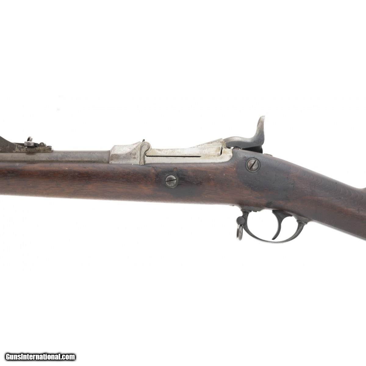 This U.S. Model 1879 Springfield trapdoor 45 Government caliber (45-70) rifle is circa late 1883/early 1884. The 32 5/8"" barrel has a fine bore with bright, strong rifling and a little frosting in the grooves. It is equipped with the correct fifth type Model 1879 rear sight. All metal has a smooth blue/brown patina with the exception of the buttplate which has moderate pitting. The case colored receiver, breechblock, and tang have turned silver with some staining. the stock is good with a couple of dents on the left above the trigger, missing wood around the buttplate tang, and various issue dents and dings. The cartouche is visible but is unreadable. The swivels and ramrod are present. This is a good representative Model 1879 trapdoor rifle which still retains the correct rear sight.