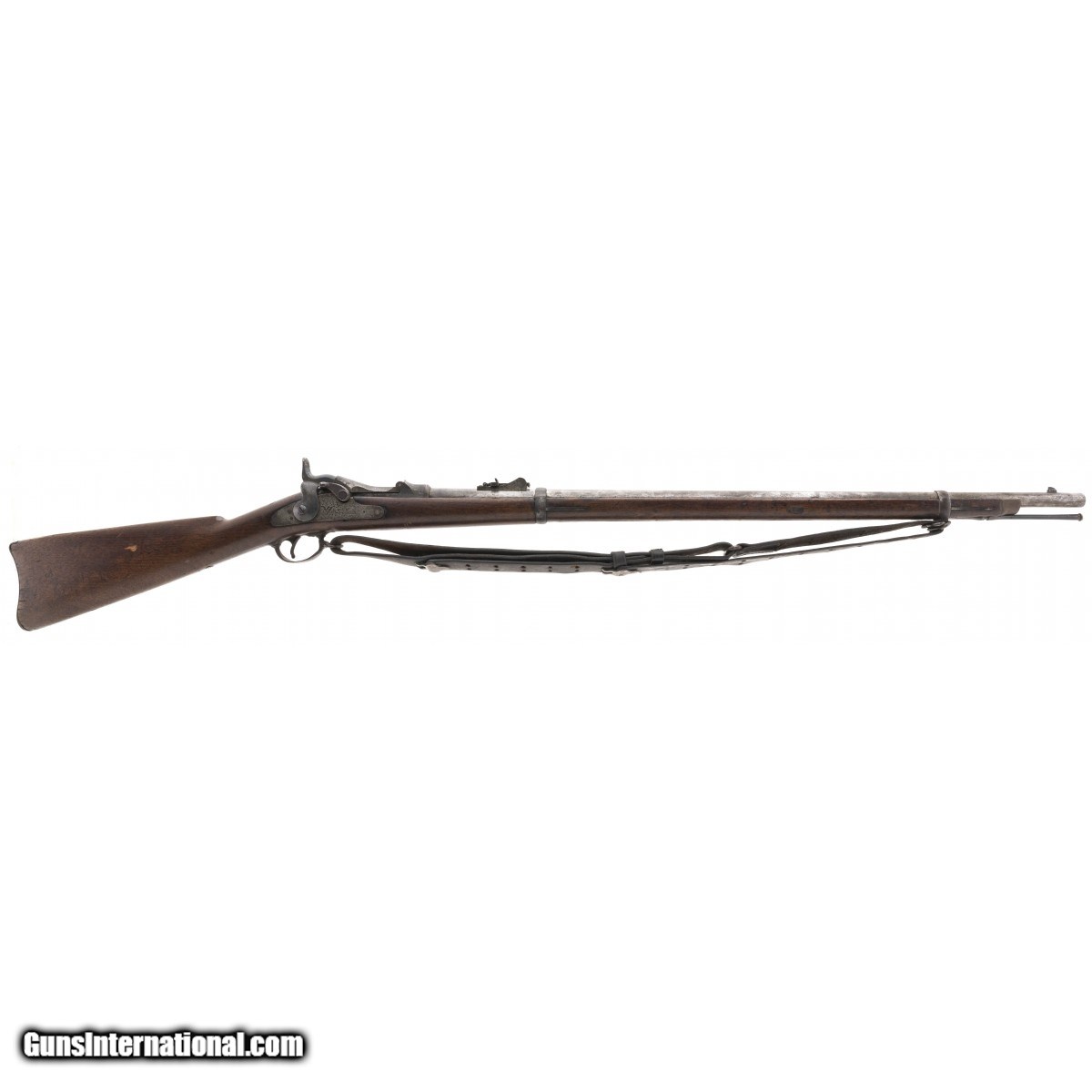Description: " U.S. Springfield model 1873 trapdoor rifle chambered in .45-70. Serial number is unreadable. Metal has a light grey patina. Bore is has strong rifling with pitting in the grooves. Stock has been refinished with faint cartouche visible. SOLD Antique: Yes |