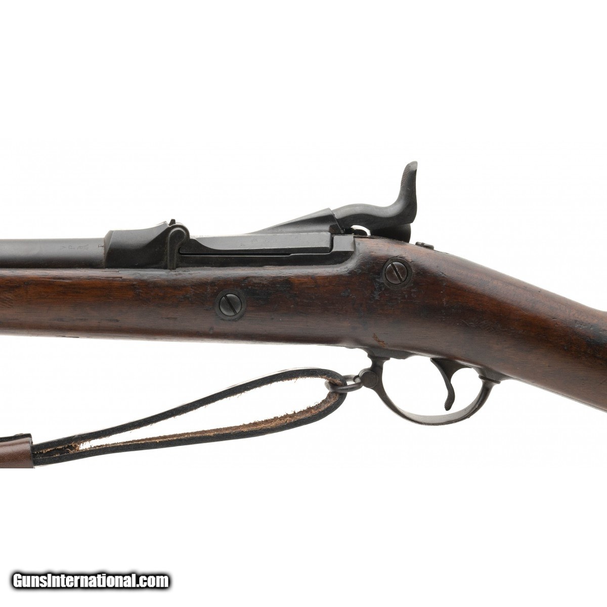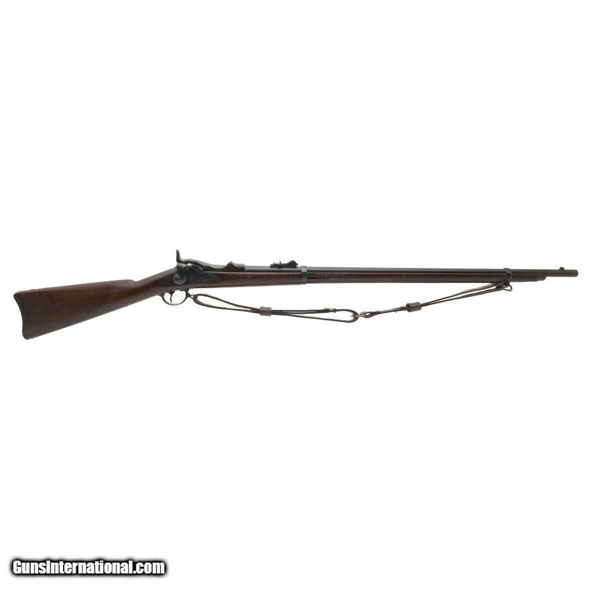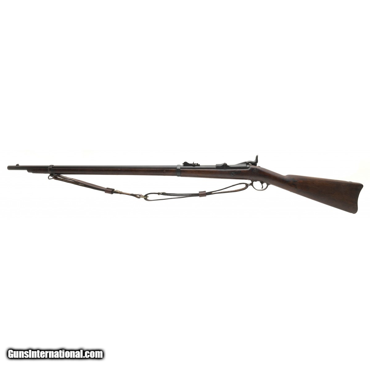 Description: " Excellent 45 Government caliber (45-70) bore with bright, strong rifling. 1879 rear sight. 85% blue turning brown. Very good wood with small chip at barrel tang and barely visible cartouche outline. Rear band spring and cleaning rod are absent. With modern sling. Action functions correctly. Good example of an Indian Wars gun. SOLD Antique: Yes |