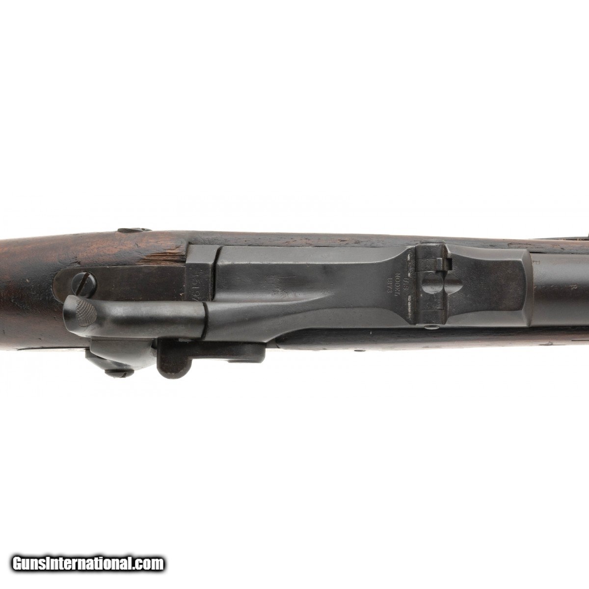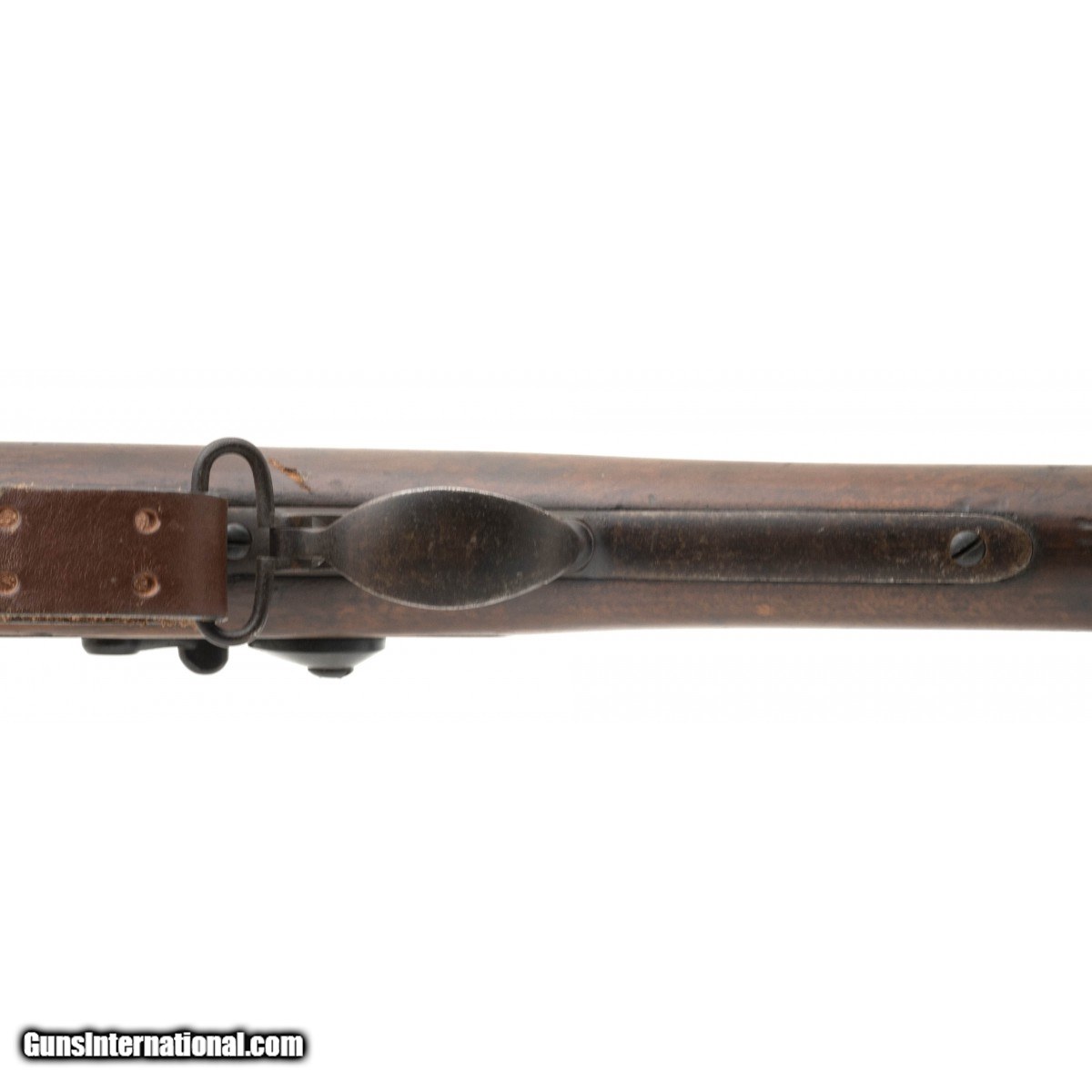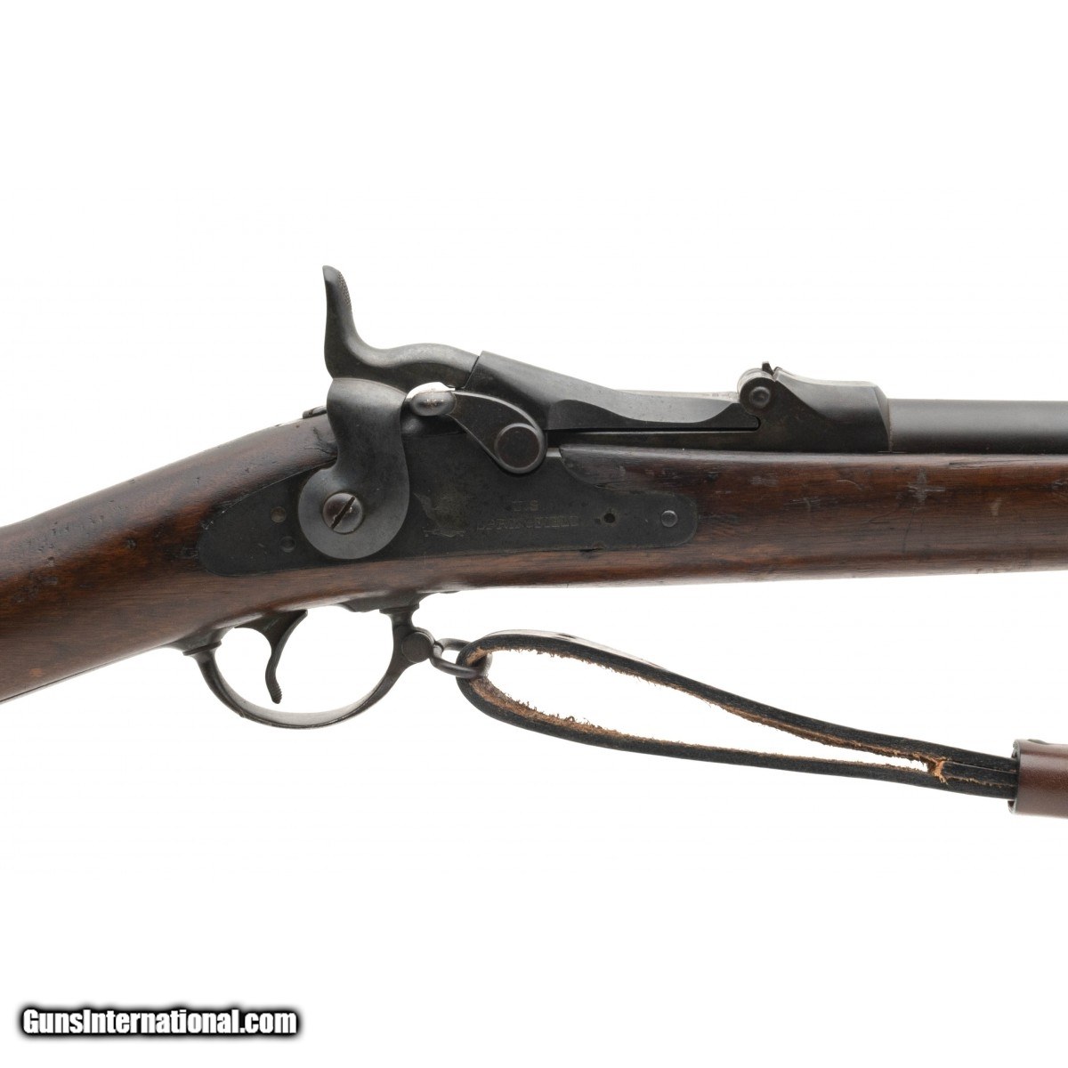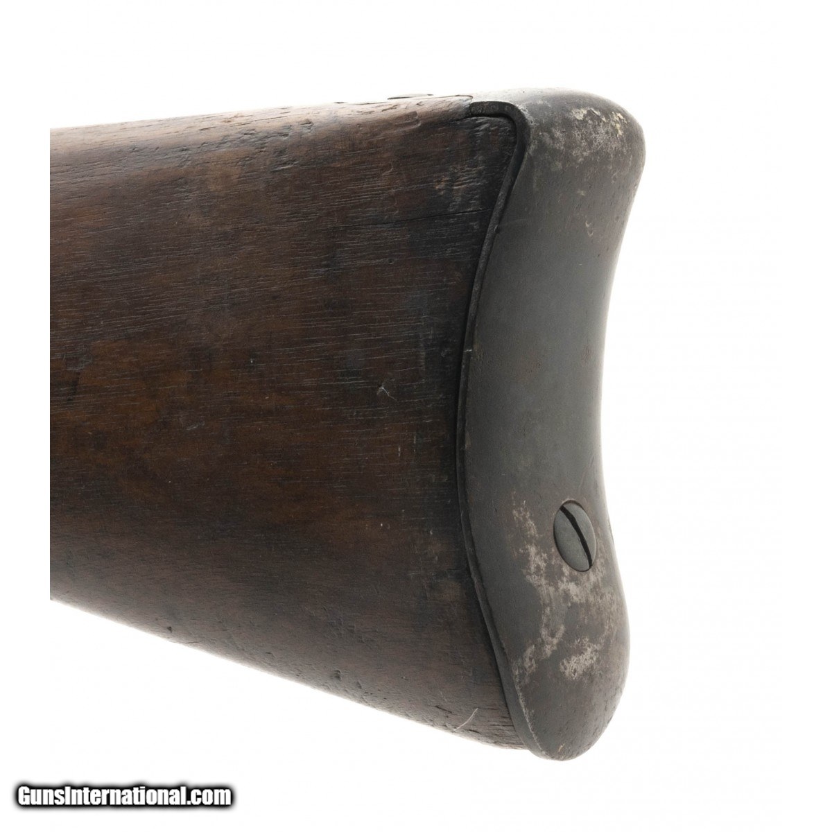 Description: " Excellent 45 Government caliber (45-70) bore with bright, strong rifling. 1879 rear sight. 85% blue turning brown. Very good wood with small chip at barrel tang and barely visible cartouche outline. Rear band spring and cleaning rod are absent. With modern sling. Action functions correctly. Good example of an Indian Wars gun. SOLD Antique: Yes |
