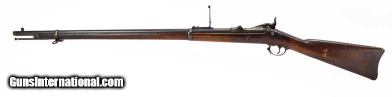 Springfield model 1884 Trapdoor rifle. Made in 1889. Gun has 50% of the original blue mixed with a blue brown patina. Gun has a replaced sight.