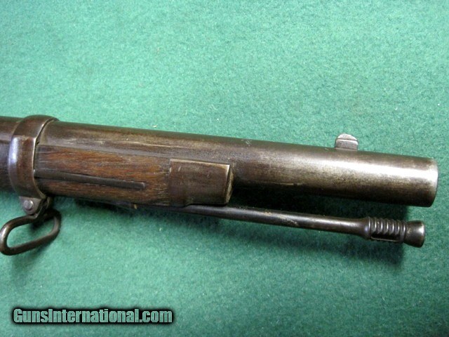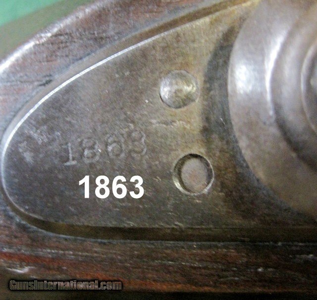 Description: Springfield 1868 Trapdoor Rifle manufactured in 1869. Has a fixed front sight/bayonet lug and a long range flip up elevation adjustable rear sight. The left side of the barrel and breech block are stamped with the serial number "457", the top of the breech block is stamped with "1869/eagle head/arrows/U.S.", the lock plate is marked with the eagle over "U.S./SPRINGFIELD" and is dated "1863", both barrel bands are marked "U", the top of the butt plate is stamped "U.S." and there is an "A" stamped on the front tang of the trigger guard. The stock has four cartouche, two oval & two square on the left flat. Just behind the tang the stock is stamped with "I 20". Comes with correct cleaning rod. Lock works perfectly(2 clicks). Bore is bright & shiny with good rifling. Action is not loose & works as it should. Barrel length is 32 1/2 inches. No cracks splits or repairs to the stock, it does have some small dings, gouges & scratches consistent with carefull use. I accept any of the name brand credit cards(Visa, Mastercard, Dicovery & American Express) with no added fees. Ships to the lower 48 states. Be sure their are no special laws where you live to prevent you from owning this antique firearm. Shipping is $35 which is added to the purchase price. SOLD Antique: Yes |