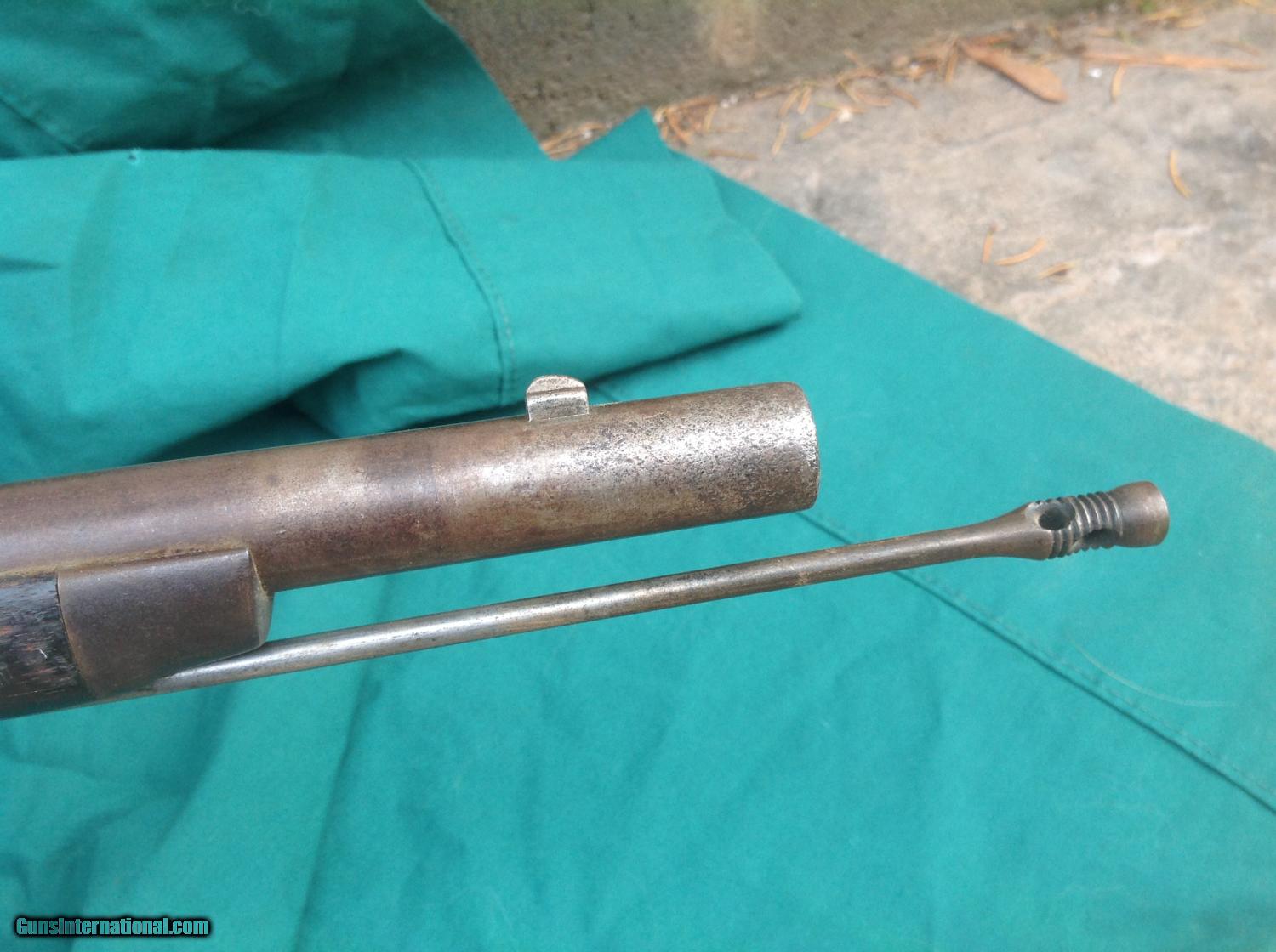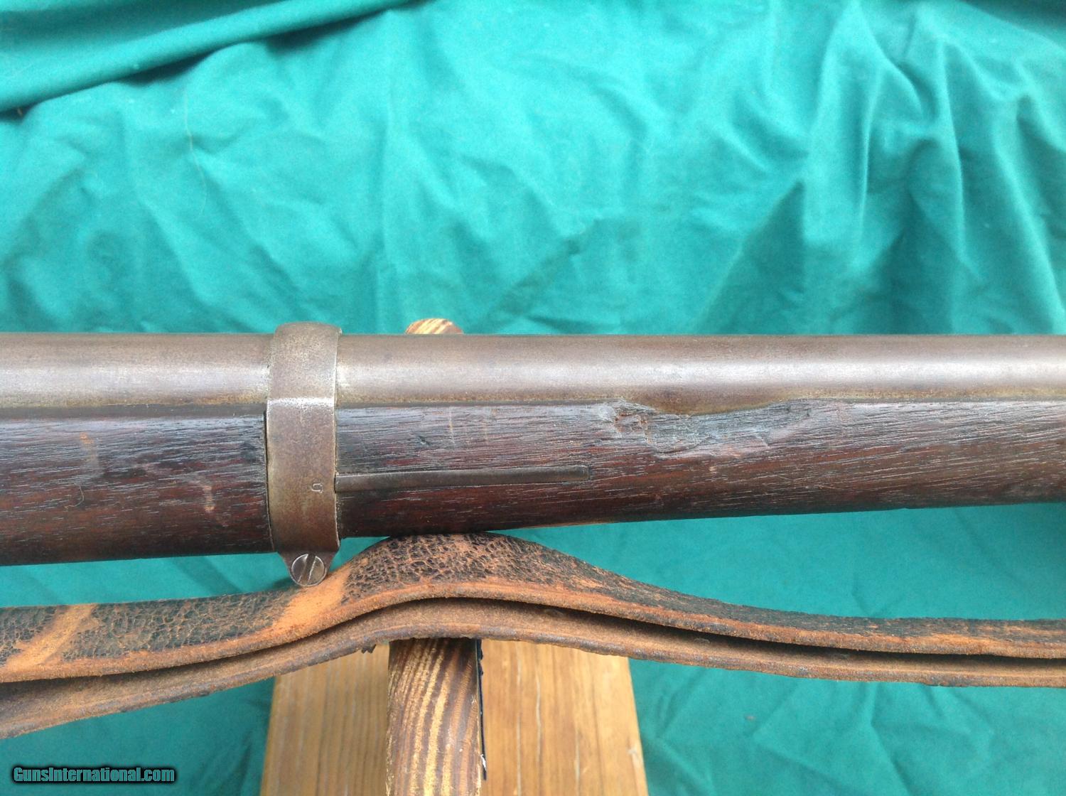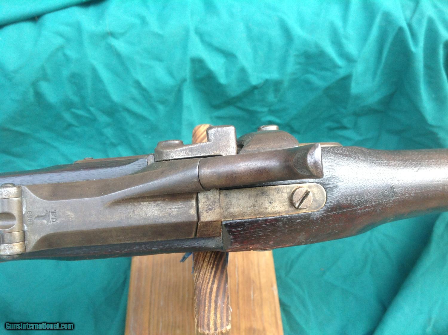 Description: 1868 US Springfield Trapdoor Rifle. Appears to be 50 caliber. Lockplate is dated 1863 and breech is dated 1869. Correct rear sight and wrong ramrod. Two cartouches are still present along with a rack mark. I will rate the bore a 7 on a scale from 1 to 10. Original sling is still present as well. Barrel measures 32 5/8". Action functions nicely. Overall condition is a gray / brown patina with sharp markings. Stock shows its age with chips, gouges, and use. Antique and can be shipped directly to your doorsteps. Please feel free to email or call me with questions 315-374-3706. SOLD Antique: Yes |