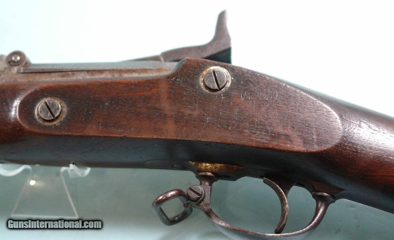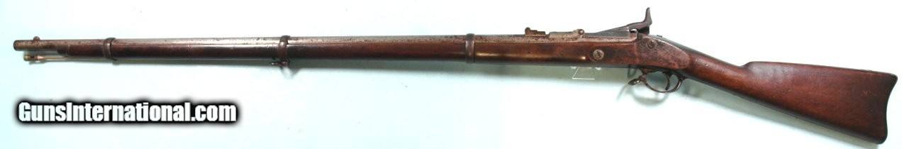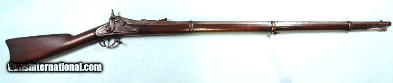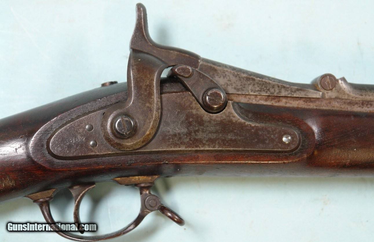 Description: 32520- INDIAN WARS SPRINGFIELD U.S. MODEL 1866 SECOND ALLIN CONVERSION .50-70 CAL. RIFLE. 36 3/4” barrel. Breech block date stamped “1866”. Lock plate stamped “U.S./SPRINGFIELD” with eagle. All original and excellent overall with the original metal patina and all the stock finish. Lock plate with considerable original color case hardening. Exceptionally nice crisp Ordnance Sub-inspector’s cartouche on stock side panel. Excellent bright bore with great rifling. Nice example. $1900. Antique: Yes Rifle Caliber: .50-70 Government Price: $1,900.00 Contact Seller |