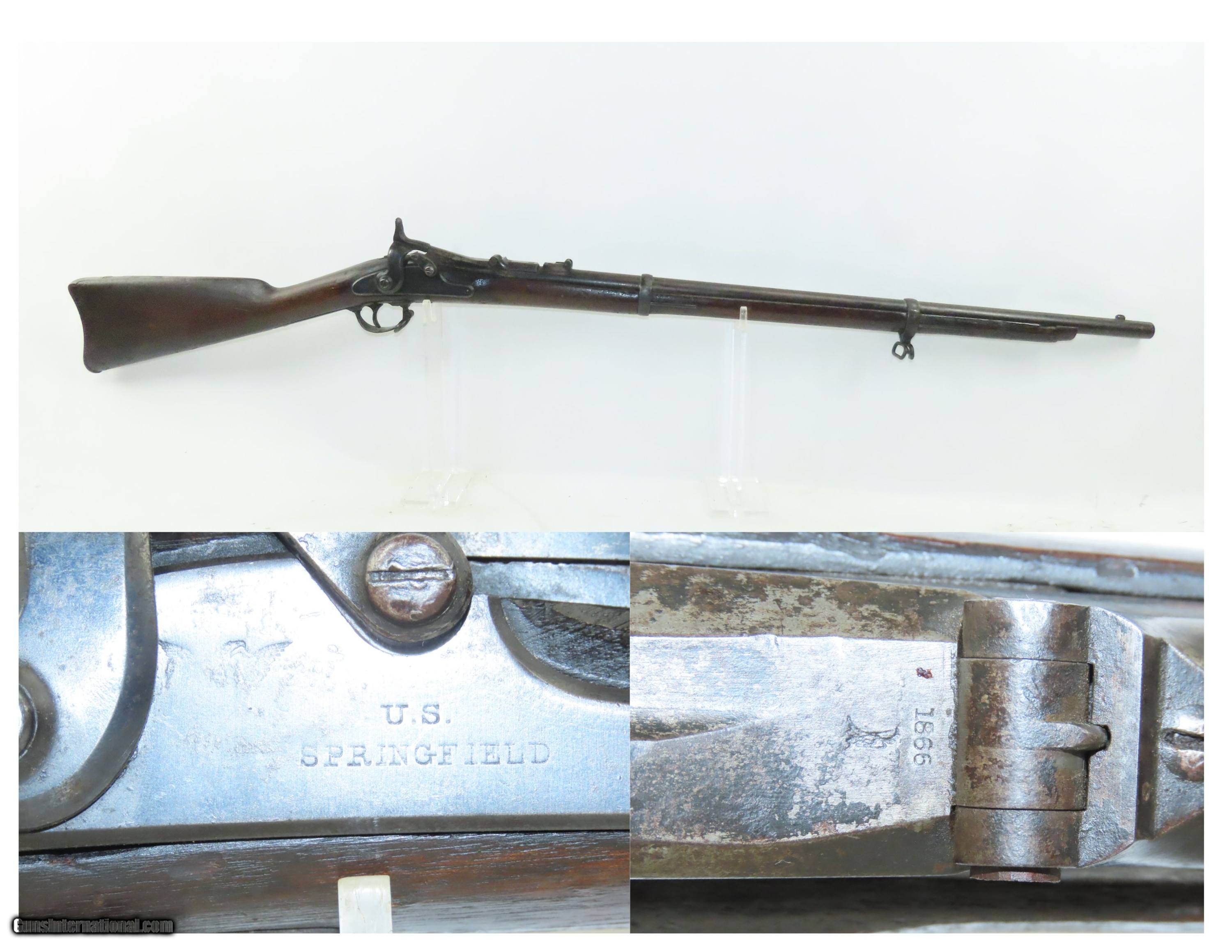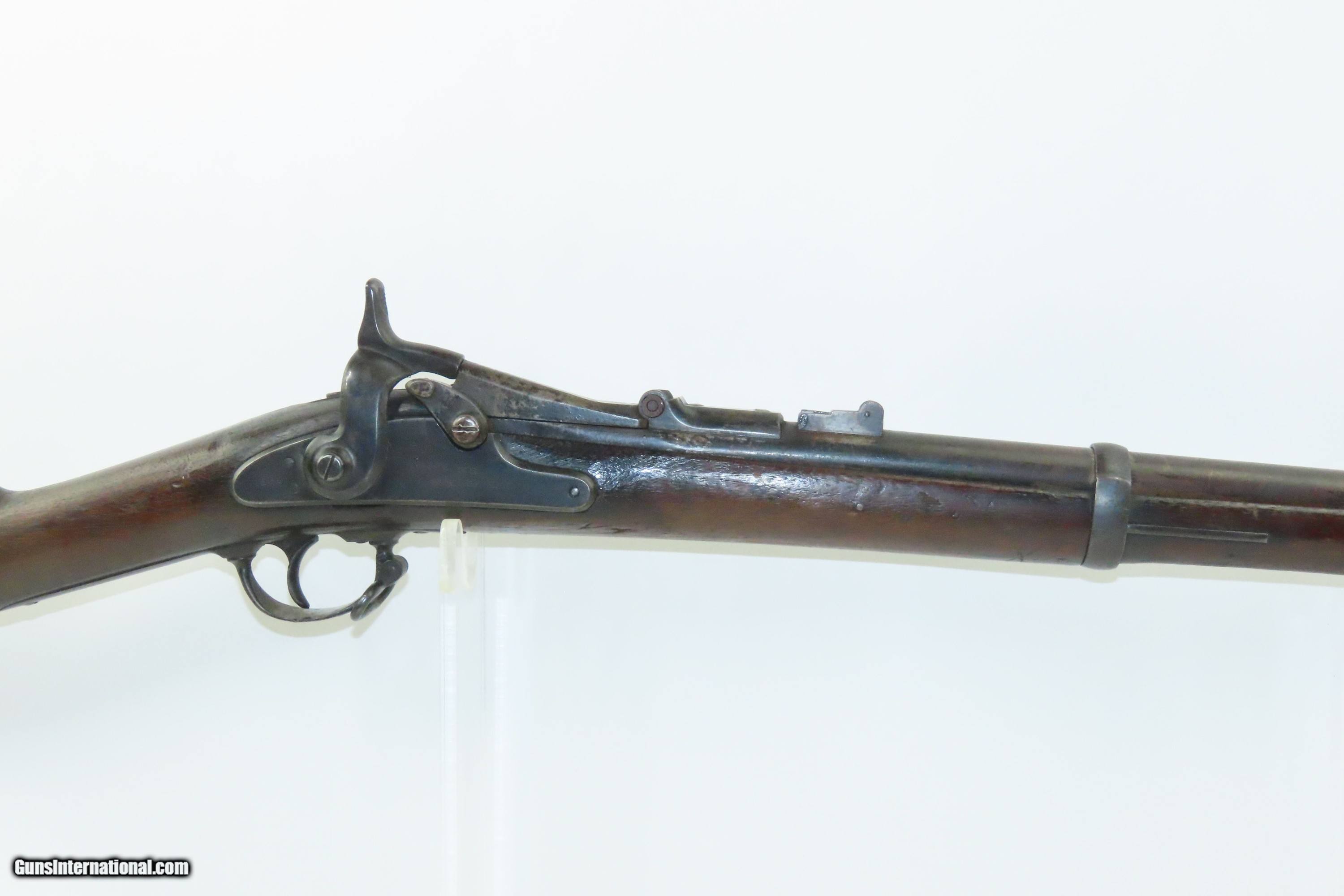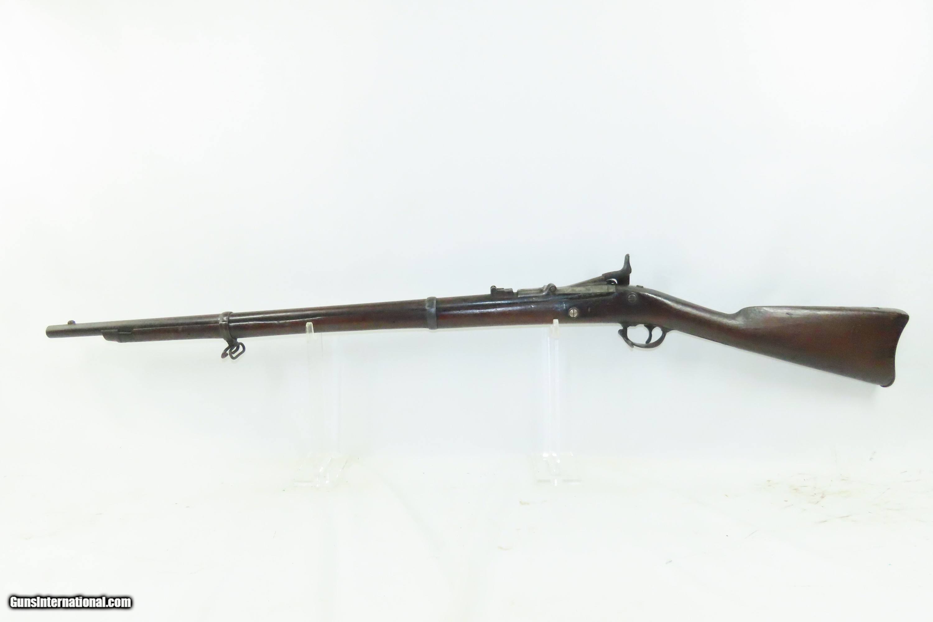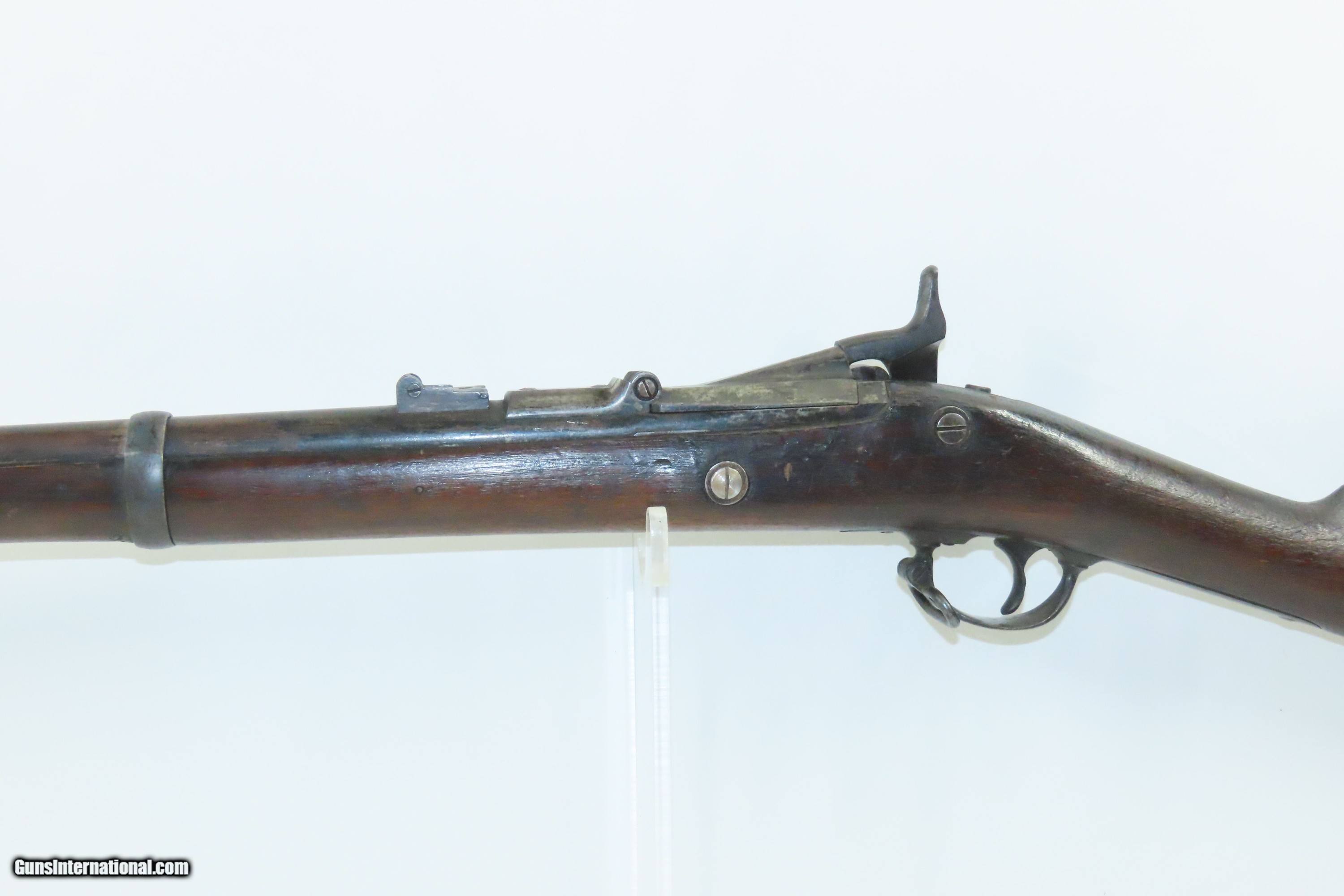 Description: Antique U.S. SPRINGFIELD M1866 .50-70 GOVT ALLIN Conversion TRAPDOOR Rifle Rifle Made Famous During the INDIAN WARS Here is an antique Springfield Model 1866 Allin Conversion Trapdoor, the rifle being manufactured circa 1864 and then converted shortly after that circa 1866. After the American Civil War, the United States military was slow to adopt new technological advances in firearms and opted to retrofit their enormous surplus inventory of Model 1861 type muskets to fire cartridges. Many different types of conversions were conceived and implemented. This one is named for its inventor, Erskine S. Allin, Master Armorer for Springfield Armory. The Springfield Model 1866 was the second iteration of the Allin designed trapdoor breech-loading mechanism. Originally developed as a means of converting rifle muskets to breechloaders, the Allin modification ultimately became the basis for the definitive Springfield Model 1873 Trapdoor, the first breech-loading rifle adopted by the United States War Department for manufacture and widespread issue to U.S. troops. These conversions were the main infantry weapon of the West and played a large role in the Indian Wars of the late 19th century. Approximately 25,000 .58 caliber Springfield Model 1863 rifled muskets were converted by Springfield Armory for use by U.S. troops, the barrels being relined and rifled to .50 caliber and the trapdoor breech system affixed. The rifle was chambered for the powerful centerfire .50-70 Government cartridge. The overall condition is good. Dark patina throughout. The action is strong. The bore is in good shape with strong rifling. The stock shows much use with some chipping around the nose cap. Cleaning rod absent. Own the original! This is a legitimate antique and not a reproduction. Barrel is 29 inches. Caliber: .50-70 GOVT Overall condition as seen in photos. Very Fast. Very Safe. FREE SHIPPING WORLDWIDE. Delivered directly to your door by express mail! Guaranteed AUTHENTIC & Includes CERTIFICATE OF AUTHENTICITY. ancestryguns $1500 #240363 SOLD Antique: Yes |