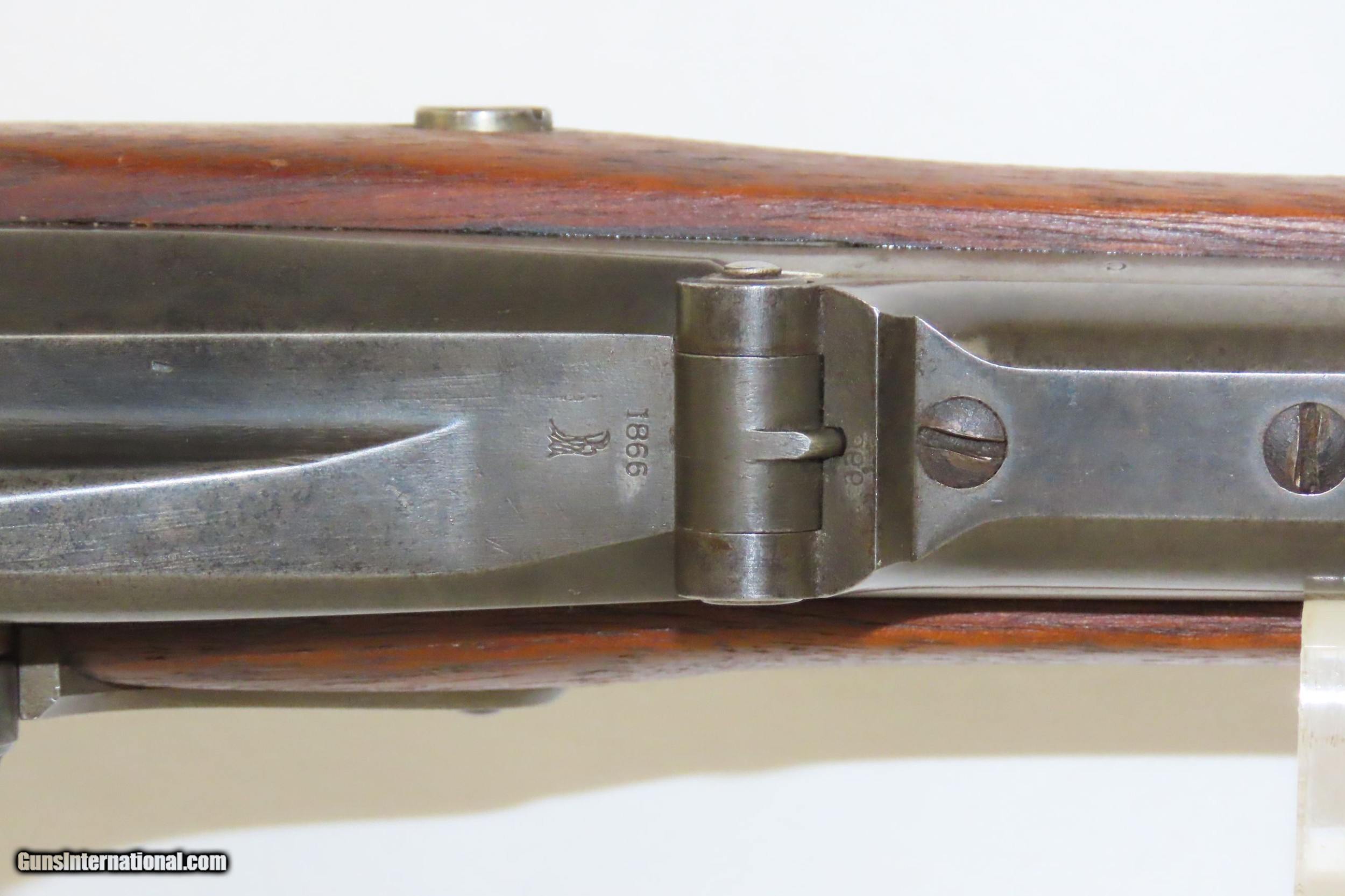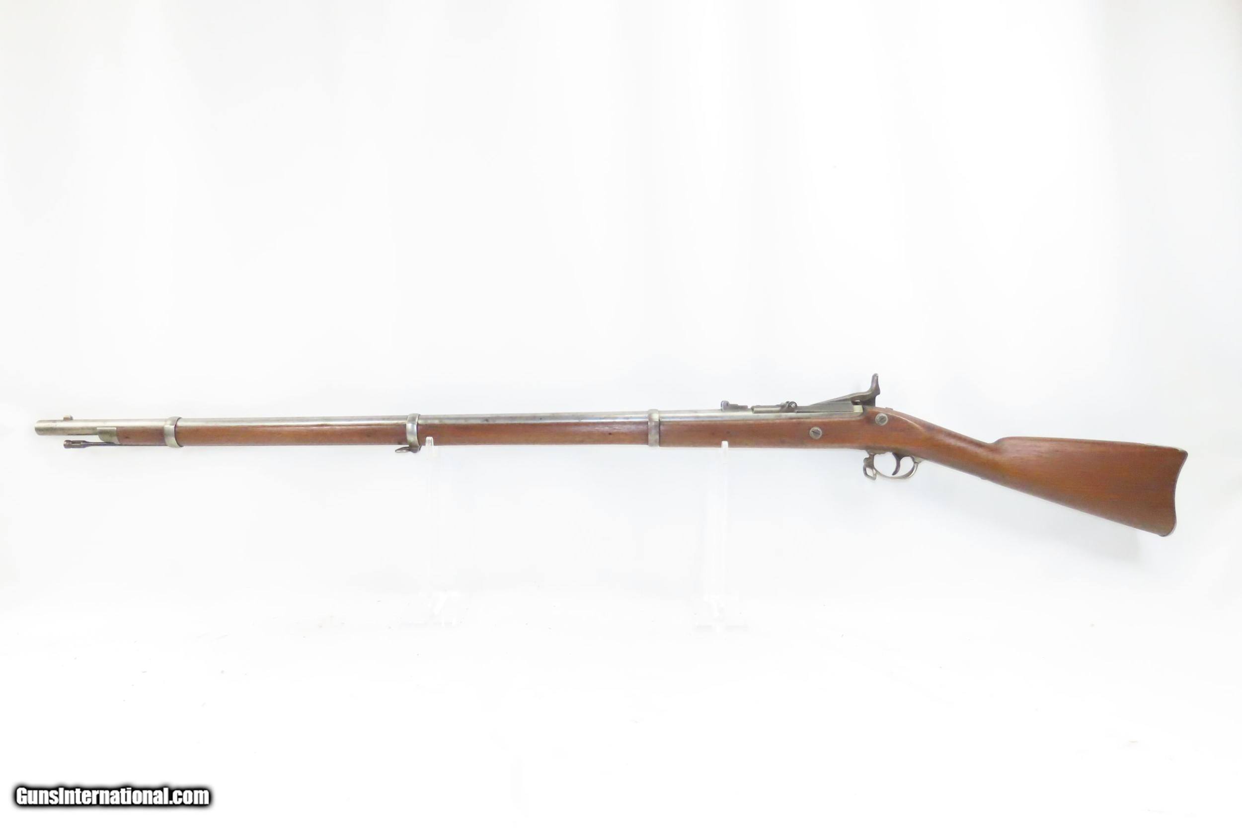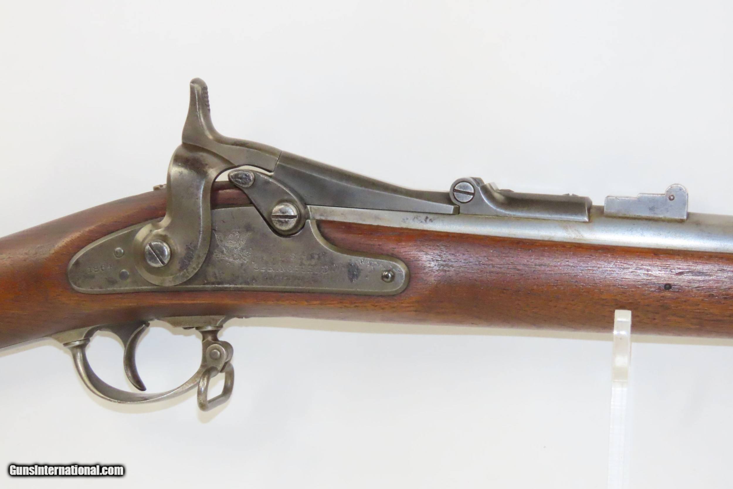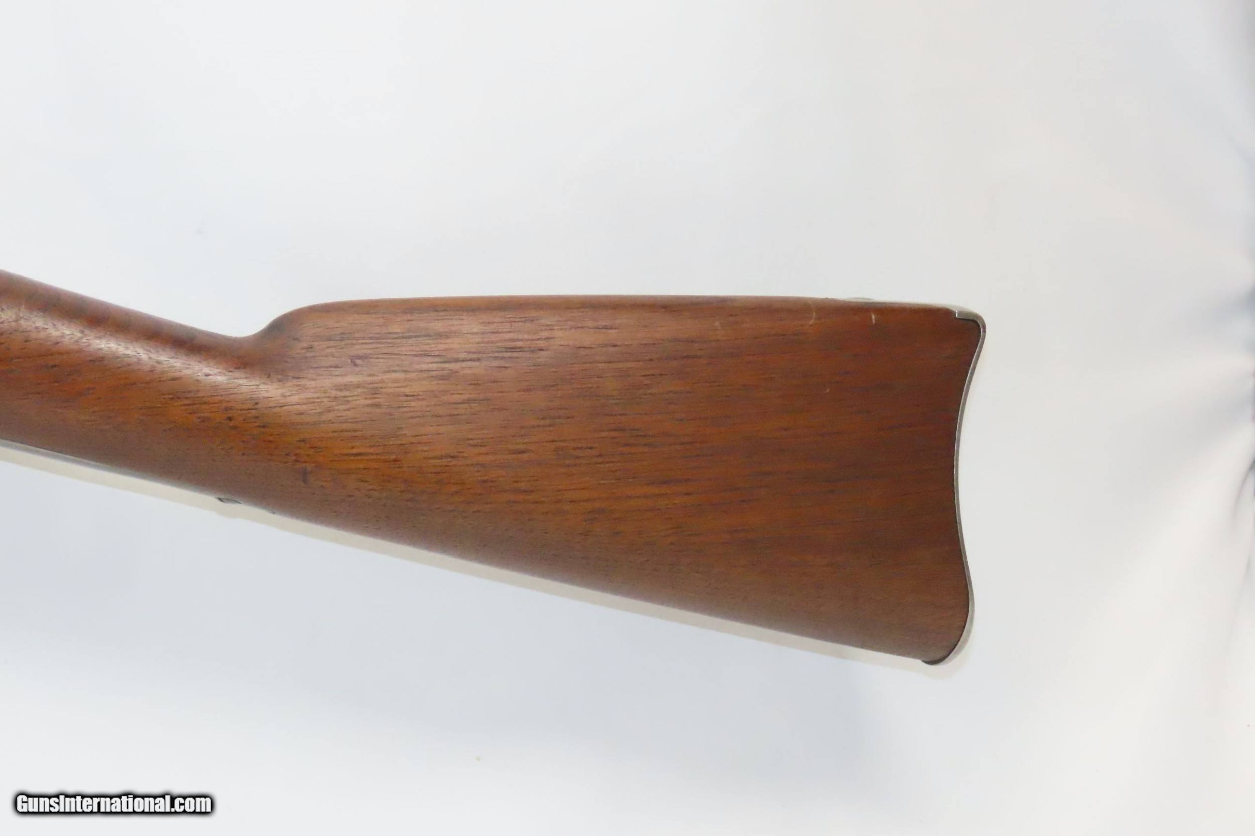 Description: Antique US SPRINGFIELD Model 1866 .50-70 GOVT 2nd ALLIN Conversion TRAPDOOR INDIAN WARS Infantry Rifle Here we present an antique Springfield Model 1866 2nd Allin Conversion Trapdoor, the rifle being manufactured circa 1864 and then converted shortly after that circa 1866. After the American Civil War, the United States military was slow to adopt new technological advances in firearms and opted to retrofit their enormous surplus inventory of Model 1861 type muskets to fire cartridges. Many different types of conversions were conceived and implemented. This one is named for its inventor, Erskine S. Allin, Master Armorer for Springfield Armory. The Springfield Model 1866 was the second iteration of the Allin designed trapdoor breech-loading mechanism. Originally developed as a means of converting rifle muskets to breechloaders, the Allin modification ultimately became the basis for the definitive Springfield Model 1873 Trapdoor, the first breech-loading rifle adopted by the United States War Department for manufacture and widespread issue to U.S. troops. These conversions were the main infantry weapon of the West and played a large role in the Indian Wars of the late 19th century. Approximately 25,000 .58 caliber Springfield Model 1863 rifled muskets were converted by Springfield Armory for use by U.S. troops, the barrels being relined and rifled to .50 caliber and the trapdoor breech system affixed. The rifle was chambered for the powerful centerfire .50-70 Government cartridge. The overall condition is very good+. Original finish. The action is excellent and the bore is in very good condition for age and black powder use: sharp rifling with lands a bit brighter than the grooves. The walnut stock is smooth and solid and shows a cartouche on the left stock flat and a smaller stamp just behind the trigger guard tang. Overall, a very nicely preserved piece that was made during the Civil War and then updated for the Indian Wars and Westward Expansion! Own the original! This is a legitimate antique and not a reproduction. Barrel is 36-5/8 inches. Caliber: .50-70 GOVT Overall condition as seen in photos. Very Fast. Very Safe. FREE SHIPPING WORLDWIDE. Delivered directly to your door by express mail! Guaranteed AUTHENTIC & Includes CERTIFICATE OF AUTHENTICITY. ancestryguns $2425 #220037 SOLD Antique: Yes |
