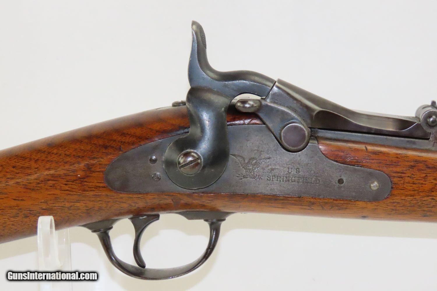 Description: Antique US SPRINGFIELD Model 1873 TRAPDOOR .45-70 GOVT Caliber CADET Rifle Manufactured at the Height of the Indian Wars! Here we present an antique U.S. Springfield Model 1873 Trapdoor Cadet Rifle, made by the Springfield Armory. Manufactured between 1873 and 1877 during the height of the Indian War and the Custer massacre, this is a cadet rifle version of the U.S. Springfield Model 1873. After the Civil War, the War Department wanted a breech-loading rifle. To be specific, it wanted a breech-loading rifle that would chamber a self-primed, metallic cartridge. Amazingly, despite the adoption of the ill-fated Model 1882 Chaffee-Reese Bolt Action Magazine Rifle, new models of trapdoor rifles continued to be produced and used all the way through the mid-1890s, until finally, the Krag-Jorgensen was adopted. The U.S. continued to see unrest and conflict with the displaced Native Americans during this time, including the Wounded Knee Massacre on December 29th, 1890. Trapdoors continued to see use all the way through the Spanish American War. “143” is stamped on top the buttstock. “US” is stamped on the buttplate tang. “US/SPRINGFIELD” is engraved on the lock. The trapdoor lid reads “US/MODEL/1873”. “VP” is stamped on the top of the barrel. The left stock has an inspector cartouche on the left side ahead of the wrist. The overall condition is very good. Original blue. Cleaning rod absent. The action is strong and tight. The bore is bright. The stock is solid and remains in good shape. This Trapdoor is equipped with a blade front sight/bayonet lug and tangent rear sight graduated to 1,100 yards with the base graduated 1-4 on the right side. A great piece of history! Own the original! This is a legitimate antique and not a reproduction. Barrel is 29-1/2 inches. Caliber: .45-70 GOVT Overall condition as seen in photos. Very Fast. Very Safe. FREE SHIPPING WORLDWIDE. Delivered directly to your door by express mail! Guaranteed AUTHENTIC & Includes CERTIFICATE OF AUTHENTICITY. ancestryguns $1595 #20361 SOLD Antique: Yes |