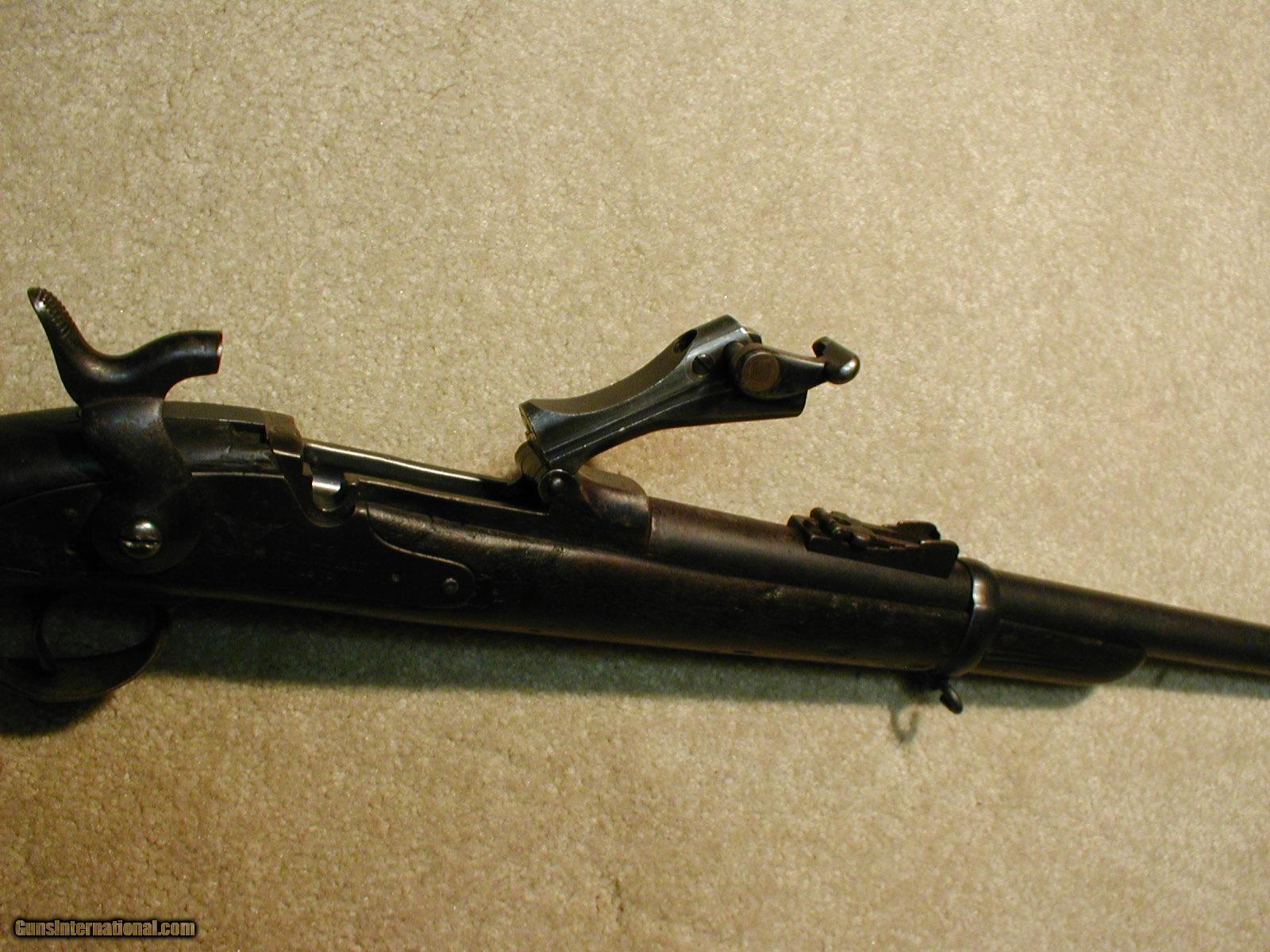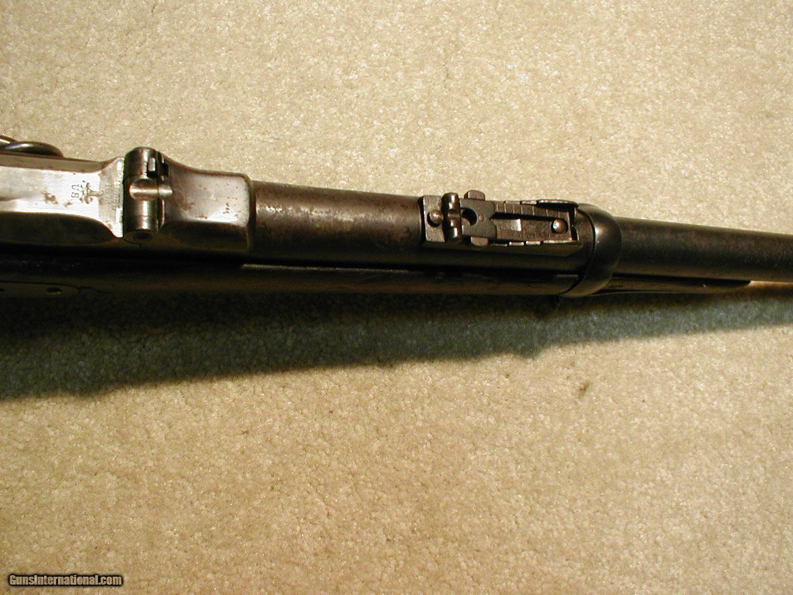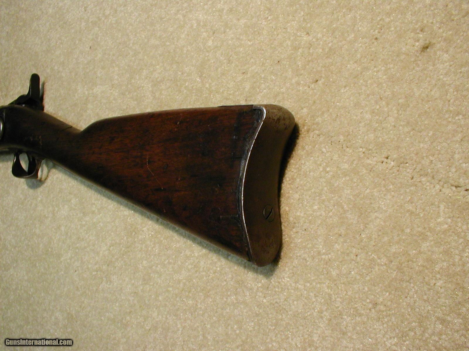 Description: RARE CUSTER ERA UNALTERED FIRST MODEL 1873 CARBINE, .45-70, #12XXX, MADE 1874, (note: there is a known Custer Battle carbine with a serial number less than 200 numbers from this one), has the correct long wrist/short comb stock, coarse knurled hammer, high arch breech block with earliest markings, 1873 dated lock plate, first model carbine rear sight with slotless screws, correct stacking swivel on the barrel band etc., almost all of these early carbines were recalled and updated by the arsenals with surviving examples in original condition extremely rare, those that do exist were most likely lost in battle to Indians or stolen- fully a third of cavalry in the early 1870s deserted for the gold fields- life for the cavalry soldier was not easy in the West and the newly discovered gold in the Black Hills of Dakota Territory was a strong temptation! Stock shows honest sling ring wear and shows a few "rows of dots" left when a spur ran along the stock while it was in a saddle scabbard, wood is weathered and has the usual age and stress cracks along the wrist with some old frontier tack repairs from the top- exactly why the wrist was shortened and thickened beginning in 1877- still retains a faint circle P cartouche behind the lower tang, nice uncleaned age blue on the barrel that has some light surface freckling still on it- never been cleaned, gray brown trigger guard and butt plate, deep aged plum hammer and lock plate, near exc. bore shows some wear but is surprisingly bright, has the number 148 stamped in the wood ahead of the butt plate with a couple of small letters ahead of it and the small number 042 stamped ahead of the trigger guard- probably rack numbers, overall an uncleaned "attic condition" example with, no doubt, a rich history! SOLD Antique: Yes Manufacturer: Springfield Model: 1873 1st. Model Carbine Serial Number: 12XXX Caliber Info: 45-70 Condition: VG+ |
