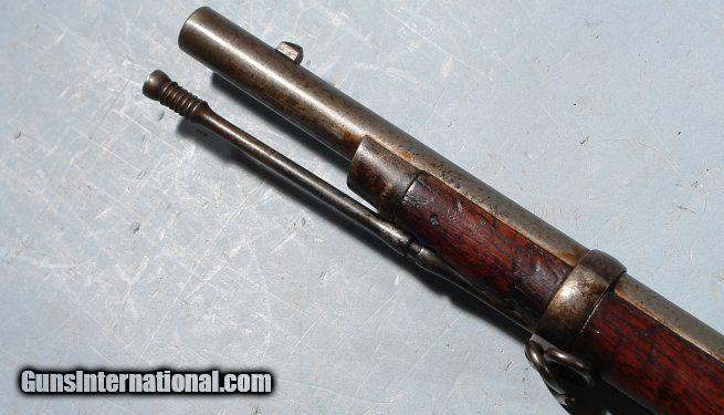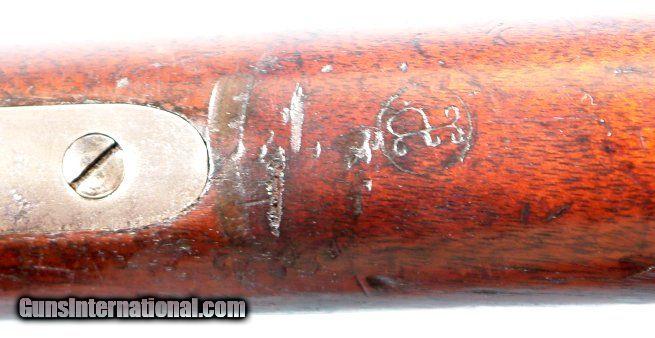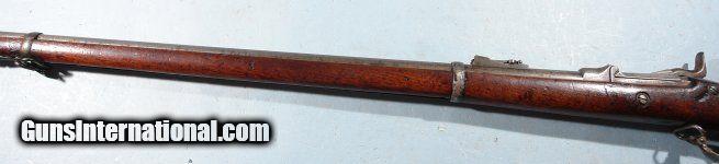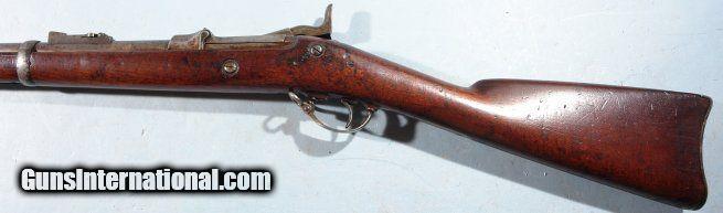 Description: EARLY INDIAN WARS PERIOD SPRINGFIELD U.S. MODEL 1873 .45-70 TRAPDOOR RIFLE. Serial number "507XX" which puts it within Indian Scouts range. This rifle overall has all the characteristics of an unalterd 1dt type 1873 with correct three groove rifling, early style hammer, smooth trigger, correct sights, high arch breechblock, etc. Traces of original case color in recesses of trapdoor. Original browned barrel now faded to patina. Very good bore and rifling. Original ESA cartouche on left stock crisp as well as Circle/P proof behind lower tang. Stock never been cleaned with no cracks or hairlines. Correct ramrod. Rack number stamped in cob forward of US buttplate. All original screws correct and NOT buggered. Perfect working order. Fine example of early type 1873 with honest character right from the period of Indian Wars activity. SOLD Antique: Yes |