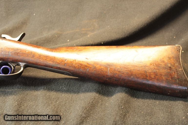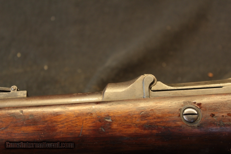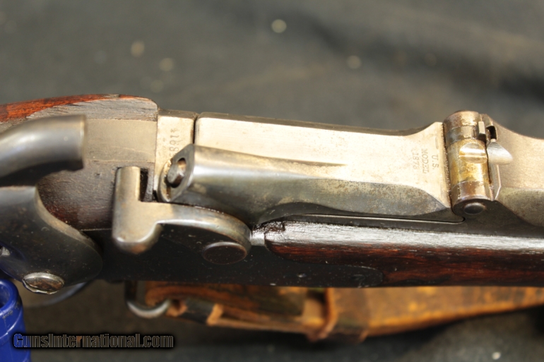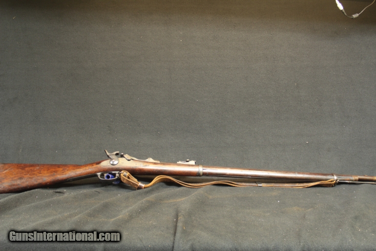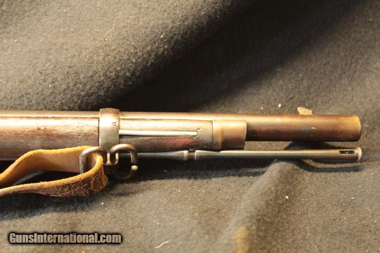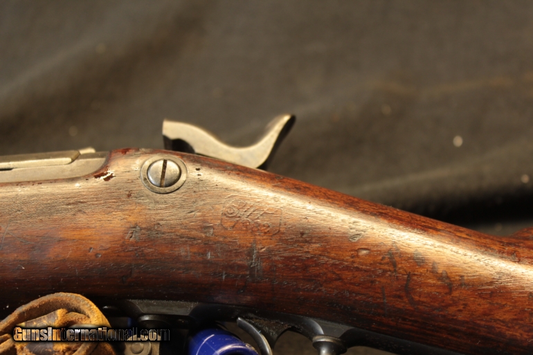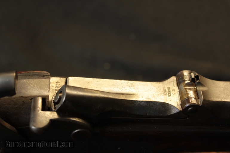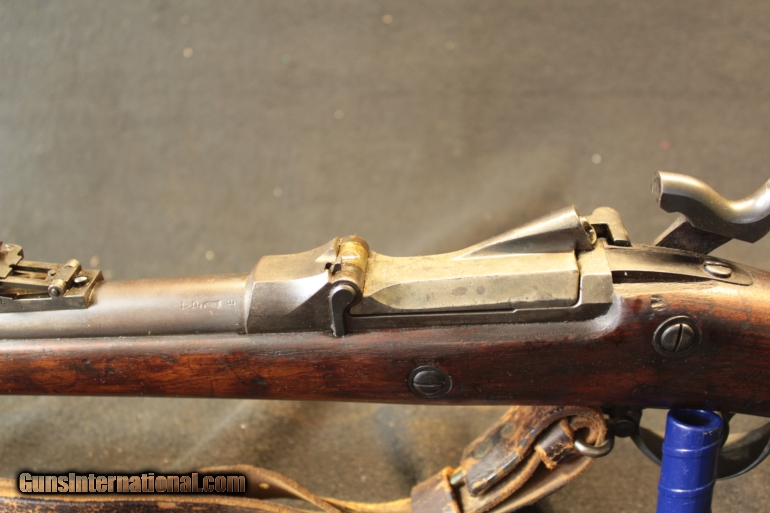 Description: Springfield 1873 Rifle. Extremely nice condition with a bore that rates about a 9. 1882 cartouche on the left side. Leather sling, Strong blue on lock plate and barrel showing a bit of patina at the muzzle. Case colored breech block. Slight chip in upper portion of stock at left receiver tang. Would be difficult to improve on this one. SOLD Antique: Yes |